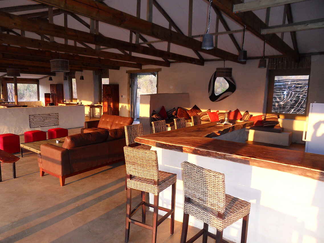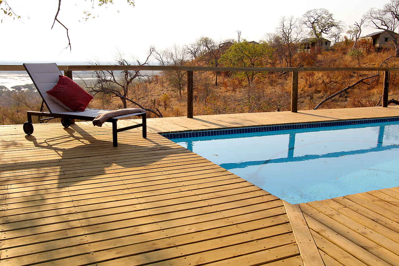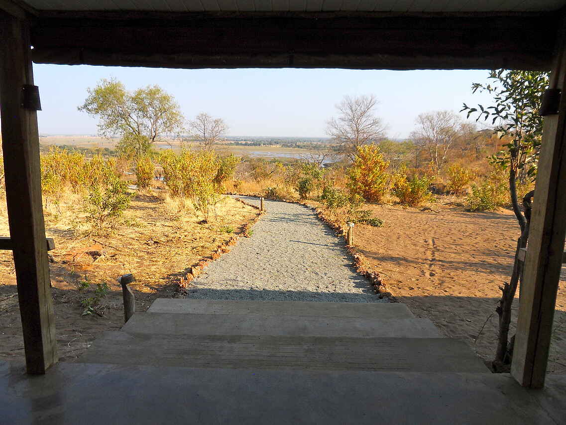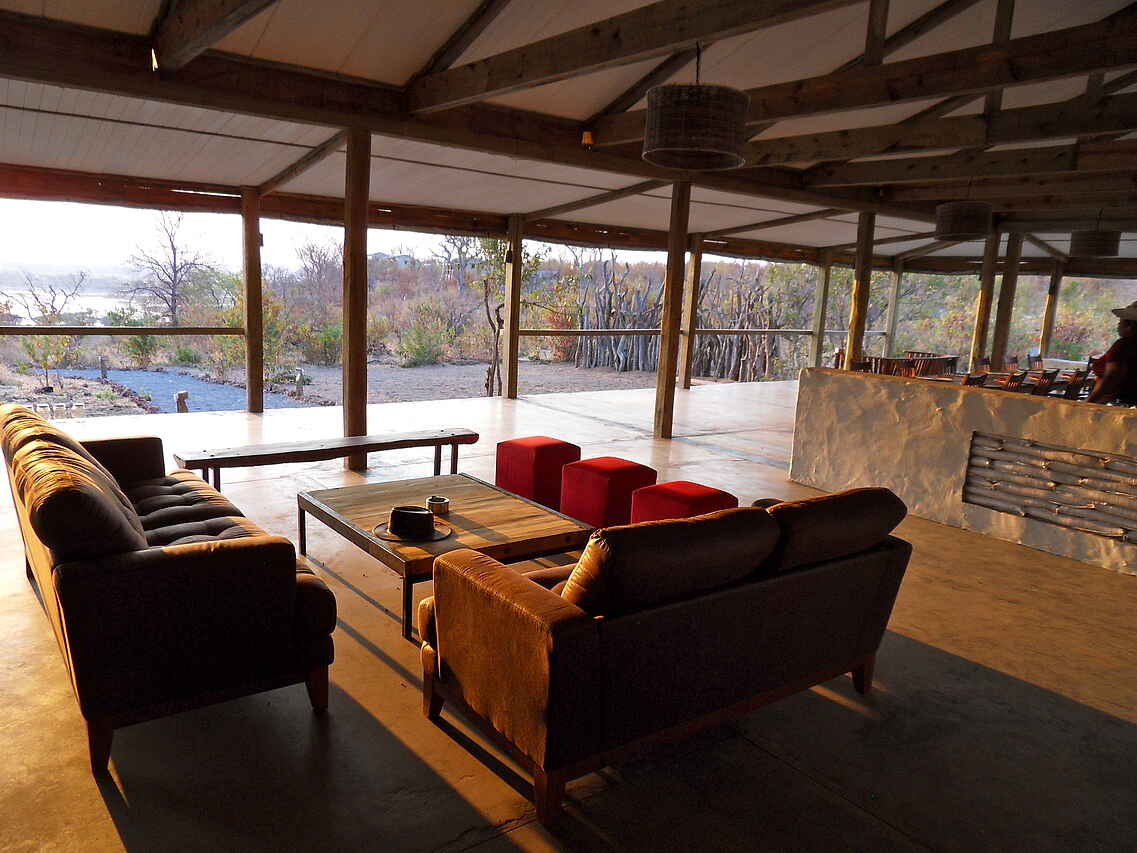 Auf einer Klippe nah an der Grenze zum Chobe National Park erbaute Lodge mit Blick auf den Flusslauf des Chobe River. Hauptgebäude und Chalets unter Beachtung ökologischer Normen, sowie mit natürlichen Baustoffen errichtet. Hauptgebäude im Farmhouse-Stil mit offener Seite zum Chobe und komfortabler Lobby, Erholungsbereich mit Sitzgelegenheiten, sowie Essbereich, Bar und großer Veranda. Sonnendeck mit Swimmingpool und Liegemöglichkeiten, Blick auf den Fluss. Kostenfreie Stellplätze.