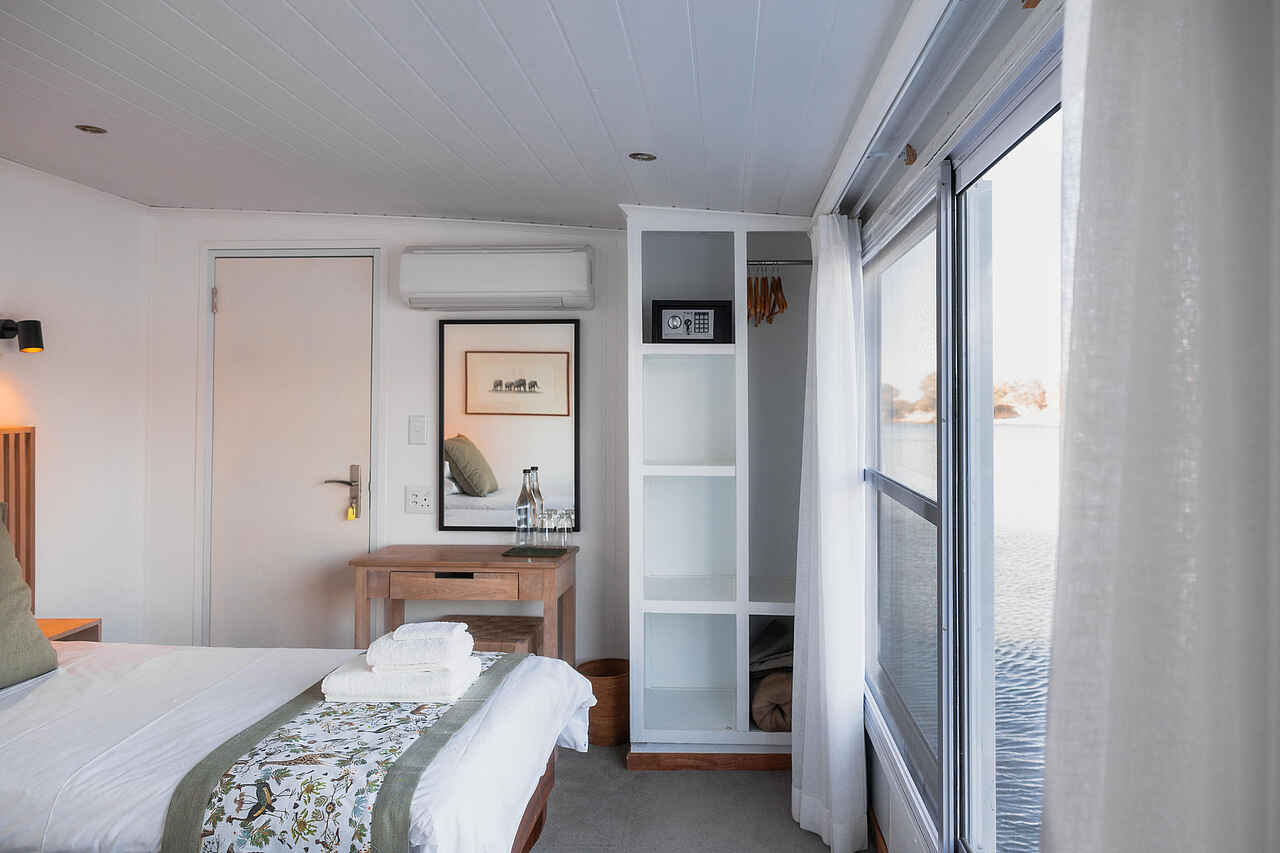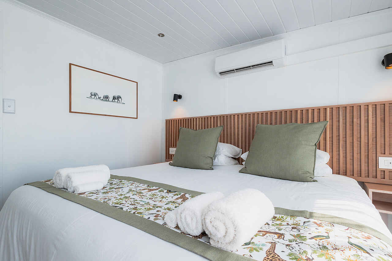 Vier bis fünf geschmackvoll und modern eingerichtete, großräumige Kabinen mit jeweils eigenem großen Schiebefenster, die einen weiträumigen Blick auf die Landschaft ermöglichen. Ausgestattet mit eigenem Bad und je nach Präferenz zwei Einzel- oder einem Kingsize-Bett. Die Kabinen verfügen über Klimaanlagen und Moskitoschutz. Bereitstellung von Insektenschutzmittel und Kosmetikartikeln.
