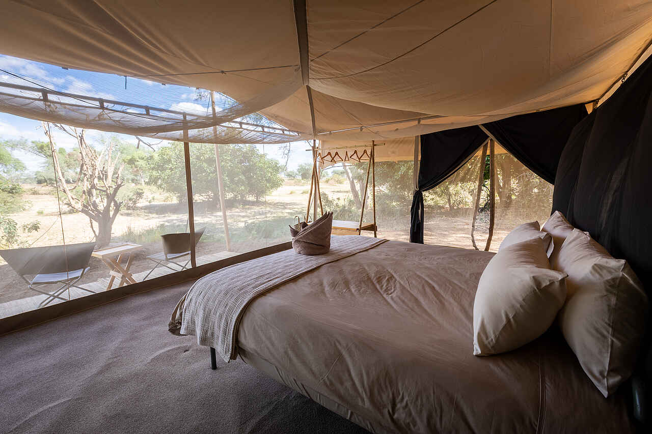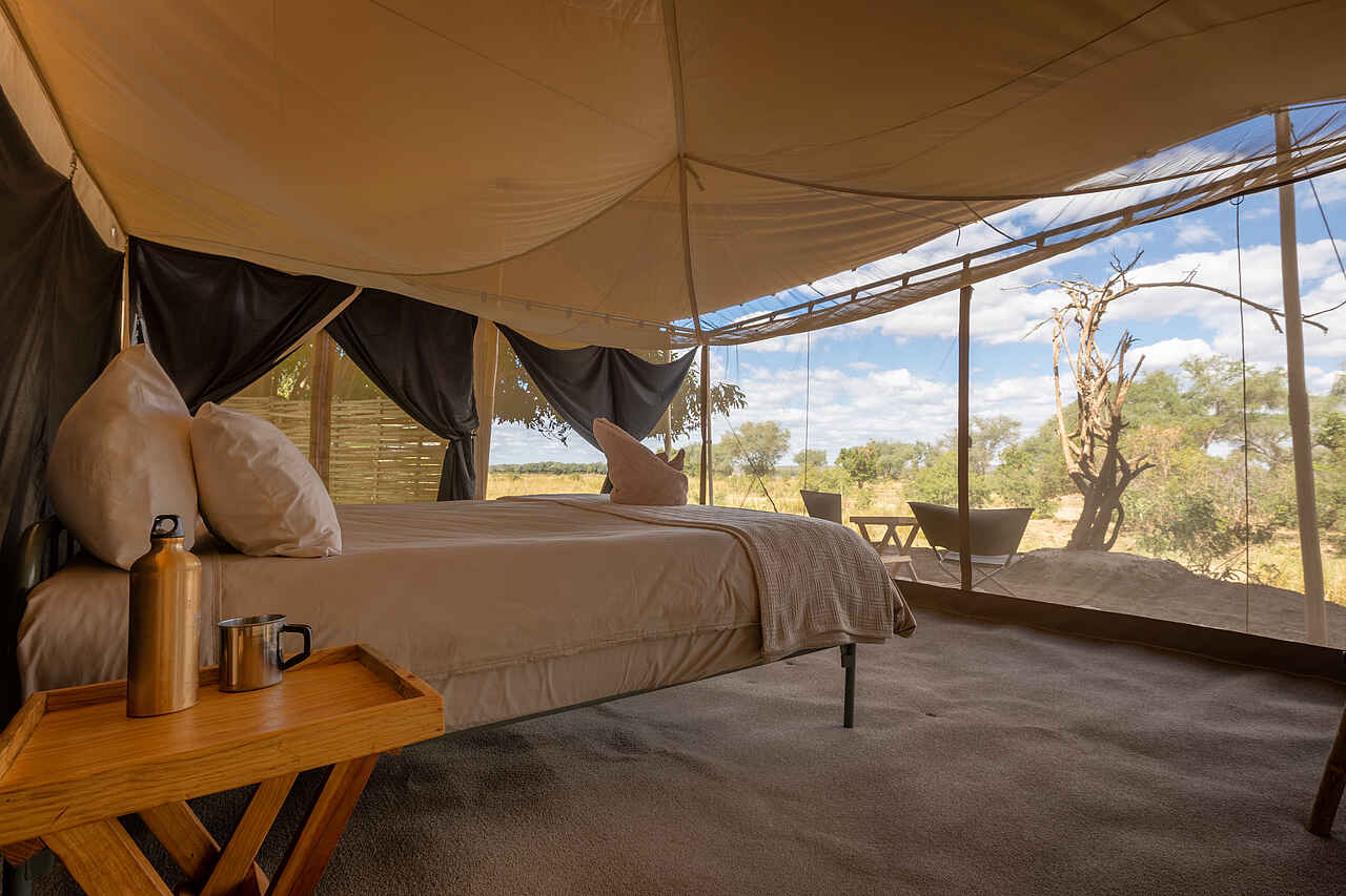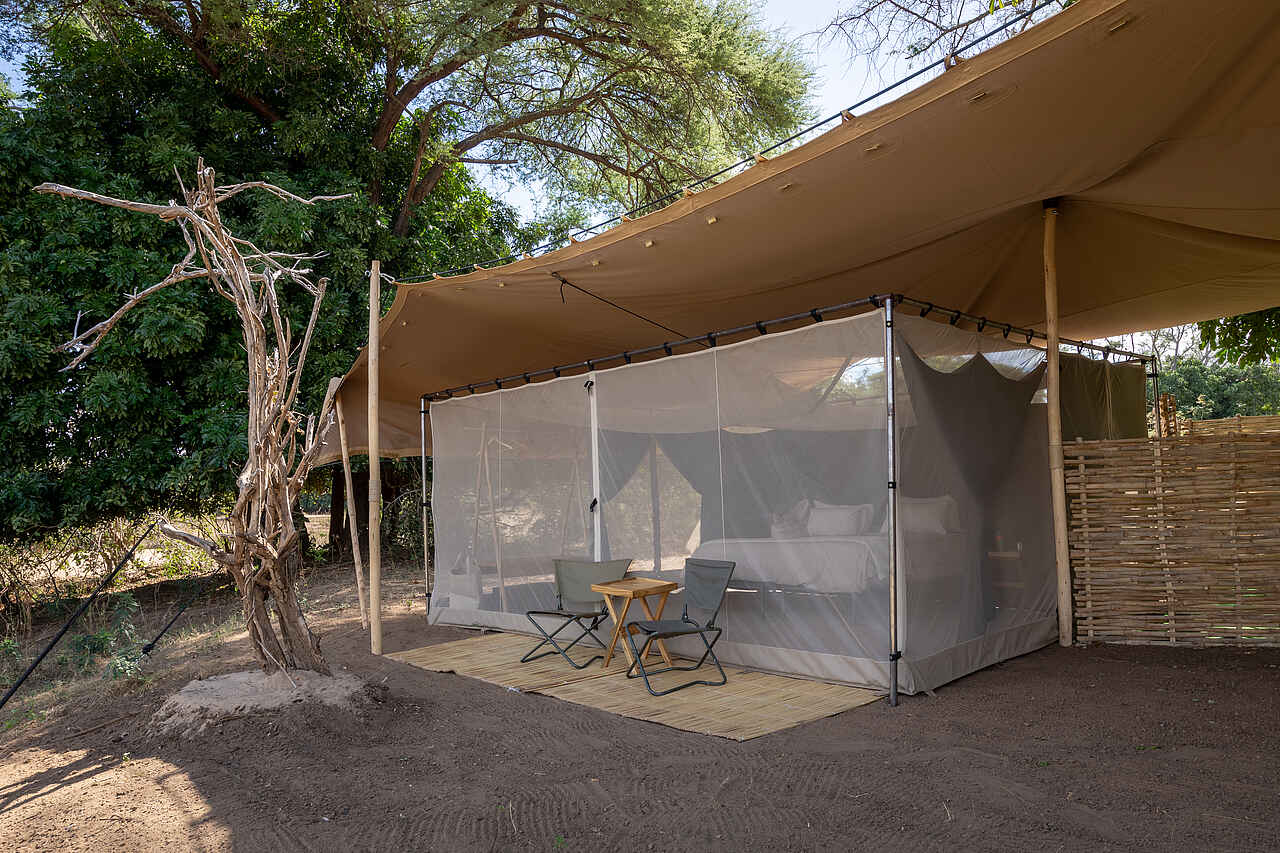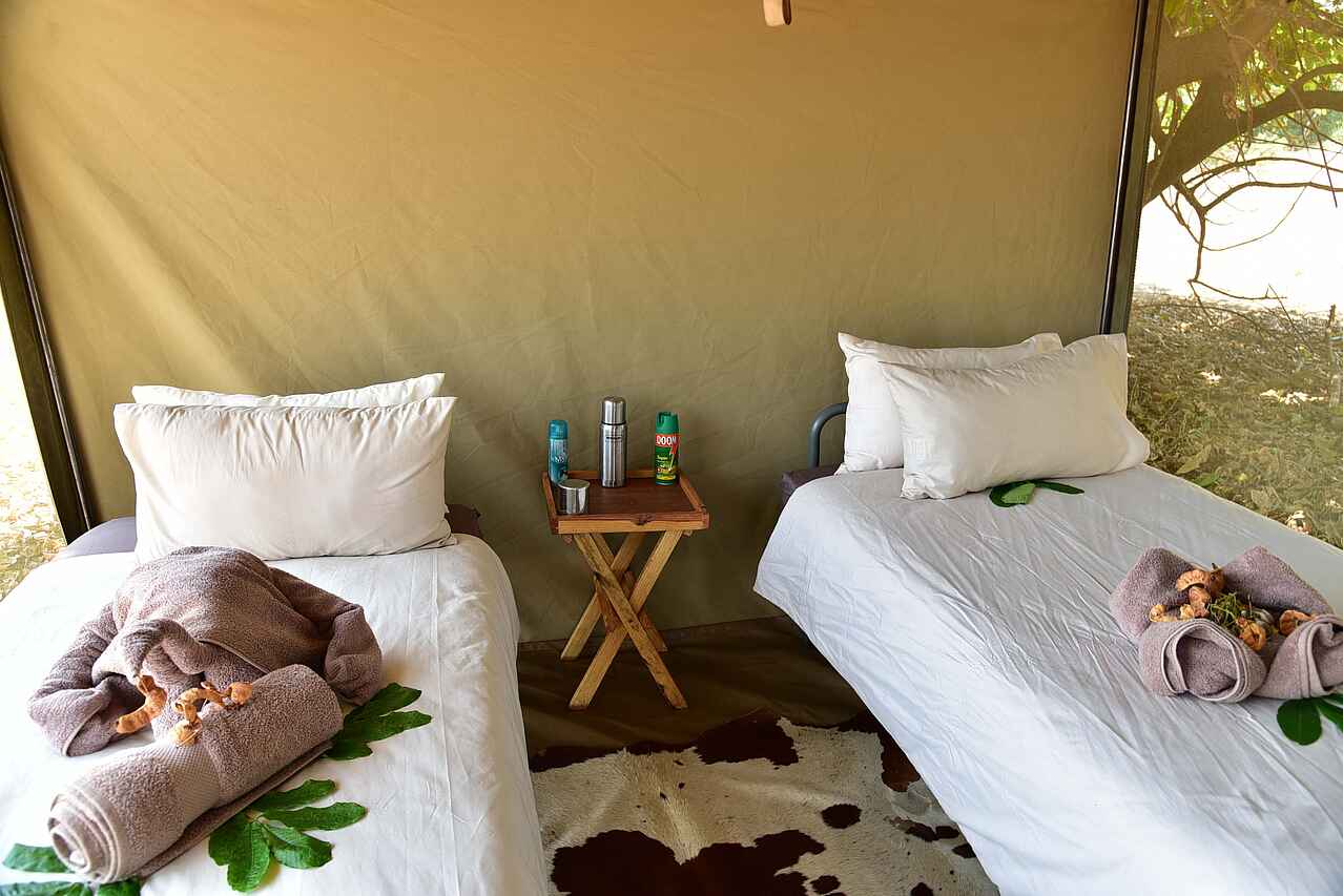 Die Zelte sind 5 x 4 Meter groß. Sie verfügen über einzelne bequeme Betten, die auf Anfrage als Doppelbetten verwendbar sind. Die Bettwäsche ist hochwertig. Verstärkte Moskitonetzwände bieten eine schöne Aussicht. Für mehr Privatsphäre am Abend oder bei kühleren Temperaturen lassen sich die Leinwände herunterklappen. In jedem Zelt befinden sich zwei Nachttische mit einer Taschenlampe, einem Funkgerät, einem Moskitospray sowie einer isolierten Wasserflasche mit Becher. Solarlichter hängen von der Decke. Der Boden ist mit Teppichen belegt. Es gibt einen Safe für Wertsachen, zwei bequeme Lagerstühle, zwei Klappregale für Gepäck und Kleidung. Das Ensuite-Badezimmer befindet sich hinten am Zelt. Es gibt eine Eimerdusche mit Aussicht, weiche Handtücher mit Handtuchhalter, WC, sowie einen kleinen Tisch mit kupfernem Waschbecken, einem Spiegel und kostenlosen Pflegeprodukten. Wäscheservice ist inkludiert. Kleidung wird von Hand gewaschen und an der Leine getrocknet. Die Gäste werden nach Einbruch der Dunkelheit zu und von ihren Zelten begleitet. Für den Brandschutz stehen Feuereimer vor jedem Zelt.