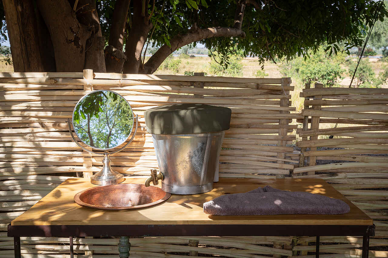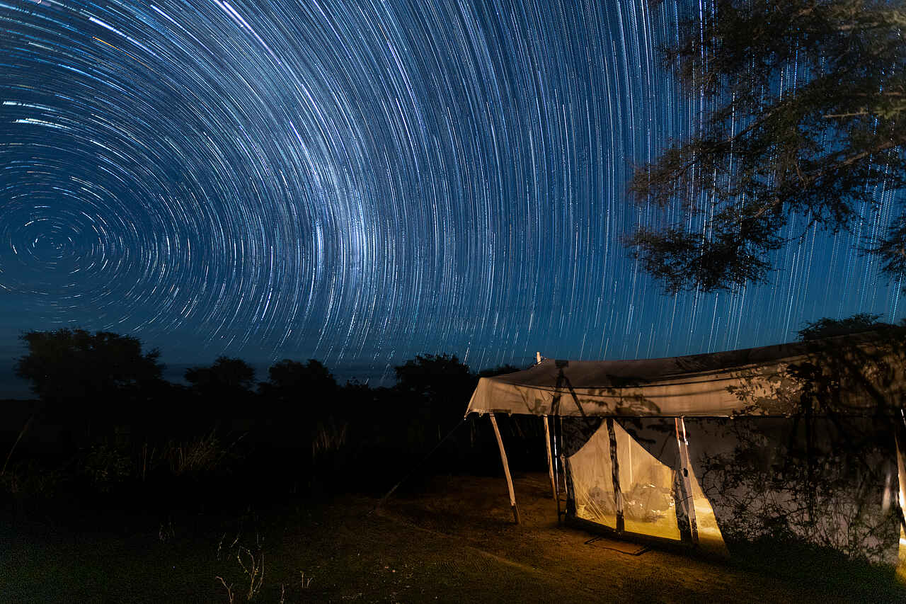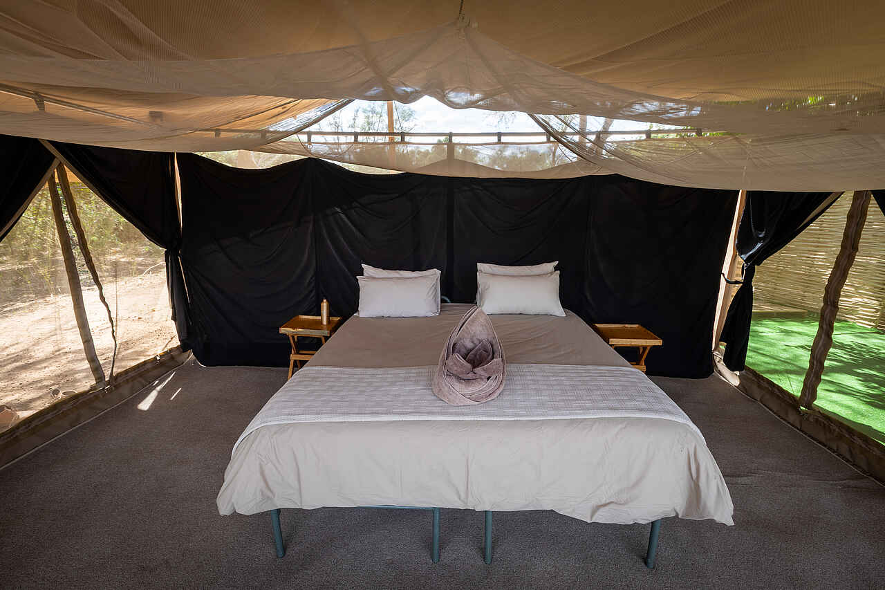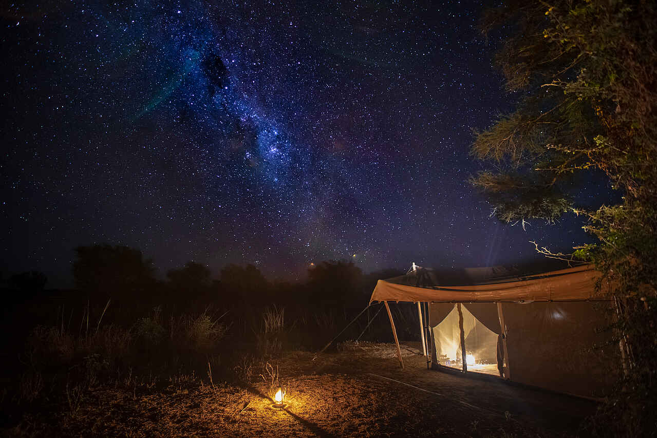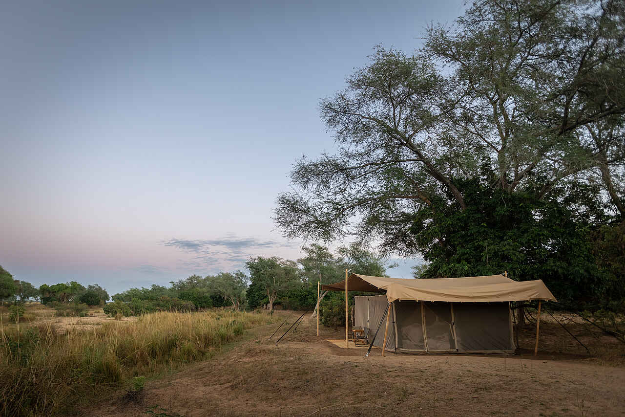 Die Zelte sind 5 x 4 Meter groß. Sie verfügen über einzelne bequeme Betten, die auf Anfrage als Doppelbetten verwendbar sind. Die Bettwäsche ist hochwertig. Verstärkte Moskitonetzwände bieten eine schöne Aussicht. Für mehr Privatsphäre am Abend oder bei kühleren Temperaturen lassen sich die Leinwände herunterklappen. In jedem Zelt befinden sich zwei Nachttische mit einer Taschenlampe, einem Funkgerät, einem Moskitospray sowie einer isolierten Wasserflasche mit Becher. Solarlichter hängen von der Decke. Der Boden ist mit Teppichen belegt. Es gibt einen Safe für Wertsachen, zwei bequeme Lagerstühle, zwei Klappregale für Gepäck und Kleidung. Das Ensuite-Badezimmer befindet sich hinten am Zelt. Es gibt eine Eimerdusche mit Aussicht, weiche Handtücher mit Handtuchhalter, WC, sowie einen kleinen Tisch mit kupfernem Waschbecken, einem Spiegel und kostenlosen Pflegeprodukten. Wäscheservice ist inkludiert. Kleidung wird von Hand gewaschen und an der Leine getrocknet. Die Gäste werden nach Einbruch der Dunkelheit zu und von ihren Zelten begleitet. Für den Brandschutz stehen Feuereimer vor jedem Zelt.
