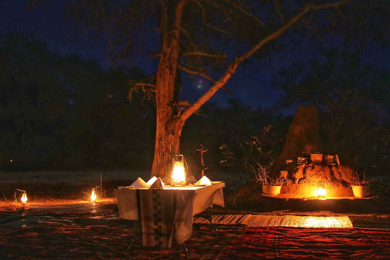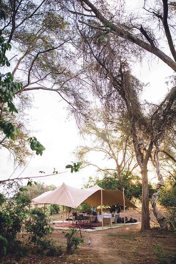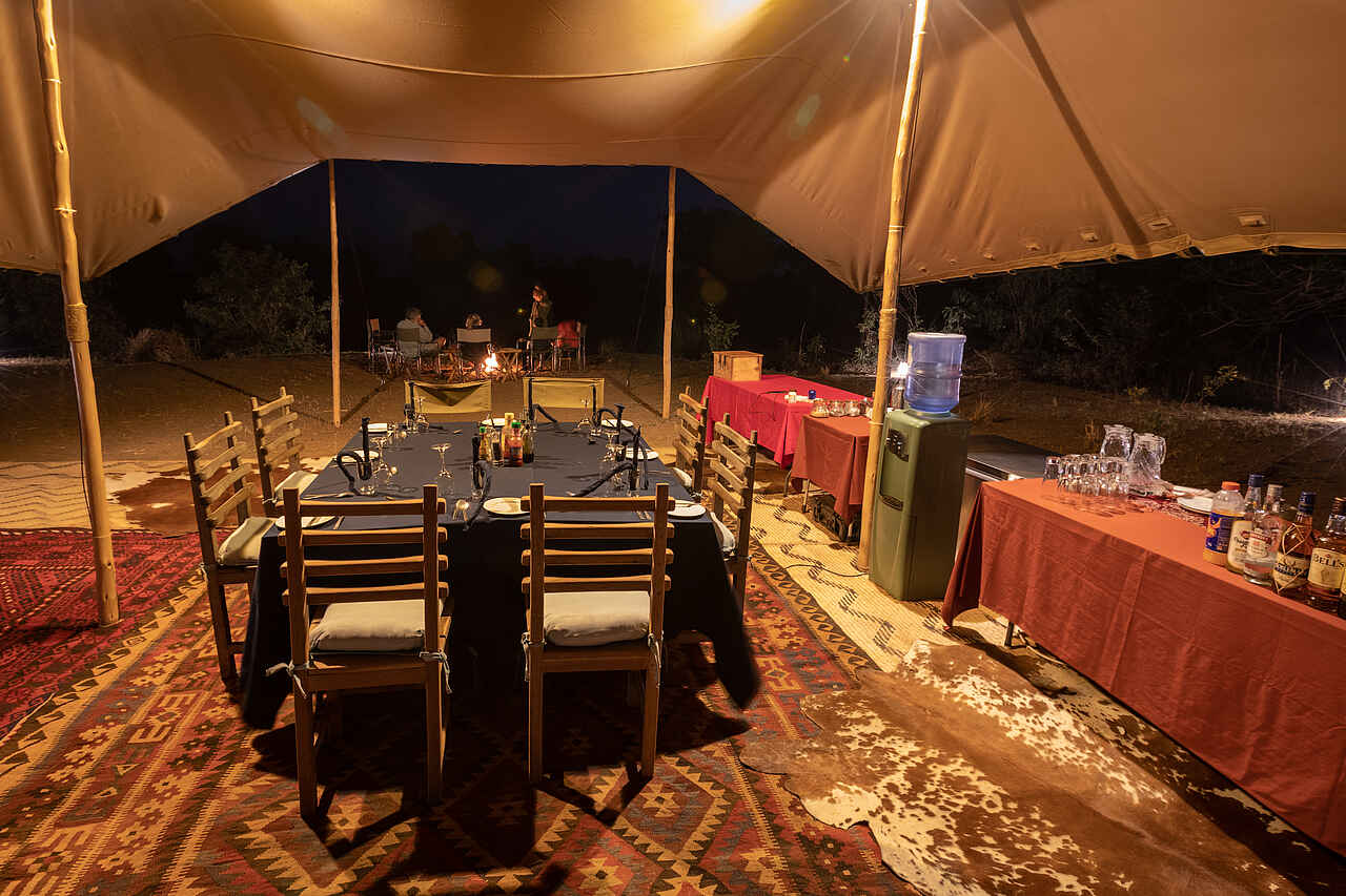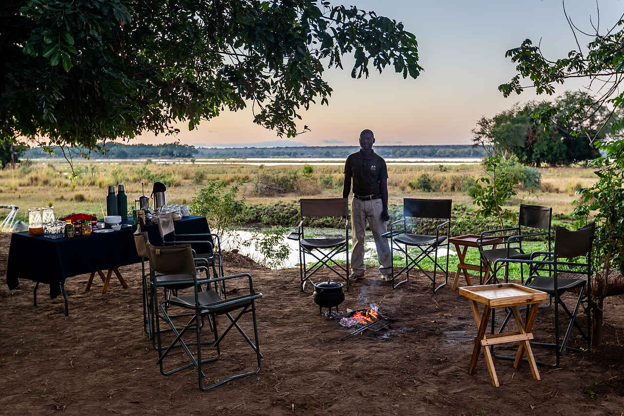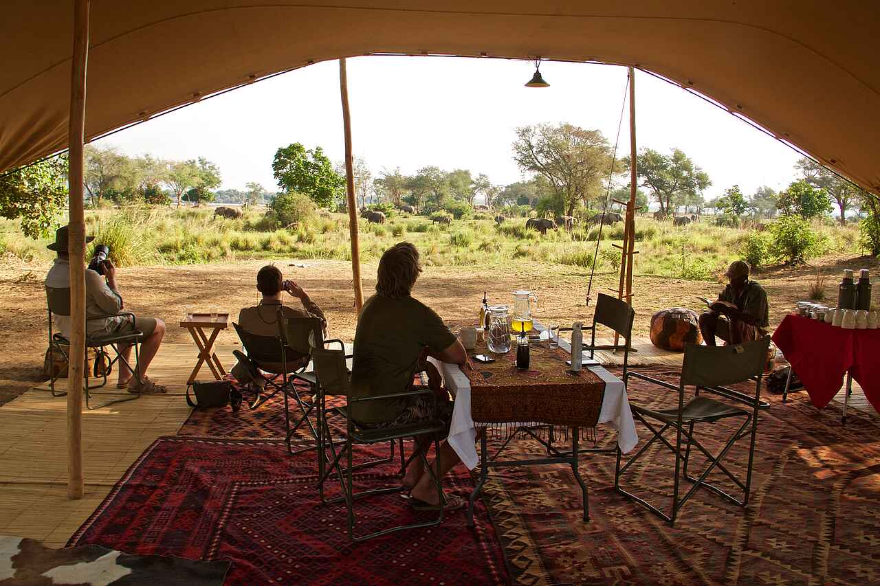 Alle Mahlzeiten sind inklusive und werden in der Gruppe eingenommen. Frühstück ist um 5.30 Uhr am Lagerfeuer. Obst, Toast, Marmeladen und Brei werden auf Bestellung über dem Feuer zubereitet. Tee, Kaffee und Saft werden dazu gereicht. Das Mittagessen ist flexibel. Als Buffet werden Fleisch- oder Gemüsegerichte sowie hausgebackenen Brötchen, Salat und frisches Obst angeboten. Das Abendessen wird als Menü serviert. Der Tisch wird im Schutz des Hauptzeltes oder näher am Fluss unter den Sternen gedeckt. Gefiltertes Trinkwasser steht bereit und alkoholfreie Getränke und lokale alkoholische Getränke sind inklusive. Premium-Weine und Spirituosen können im Voraus bestellt werden und sind kostenpflichtig.