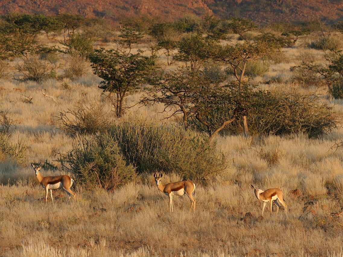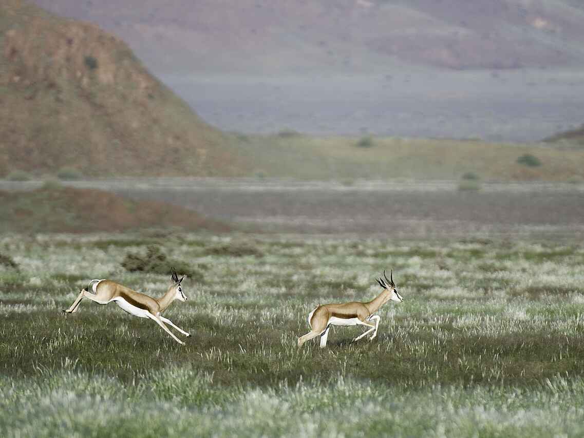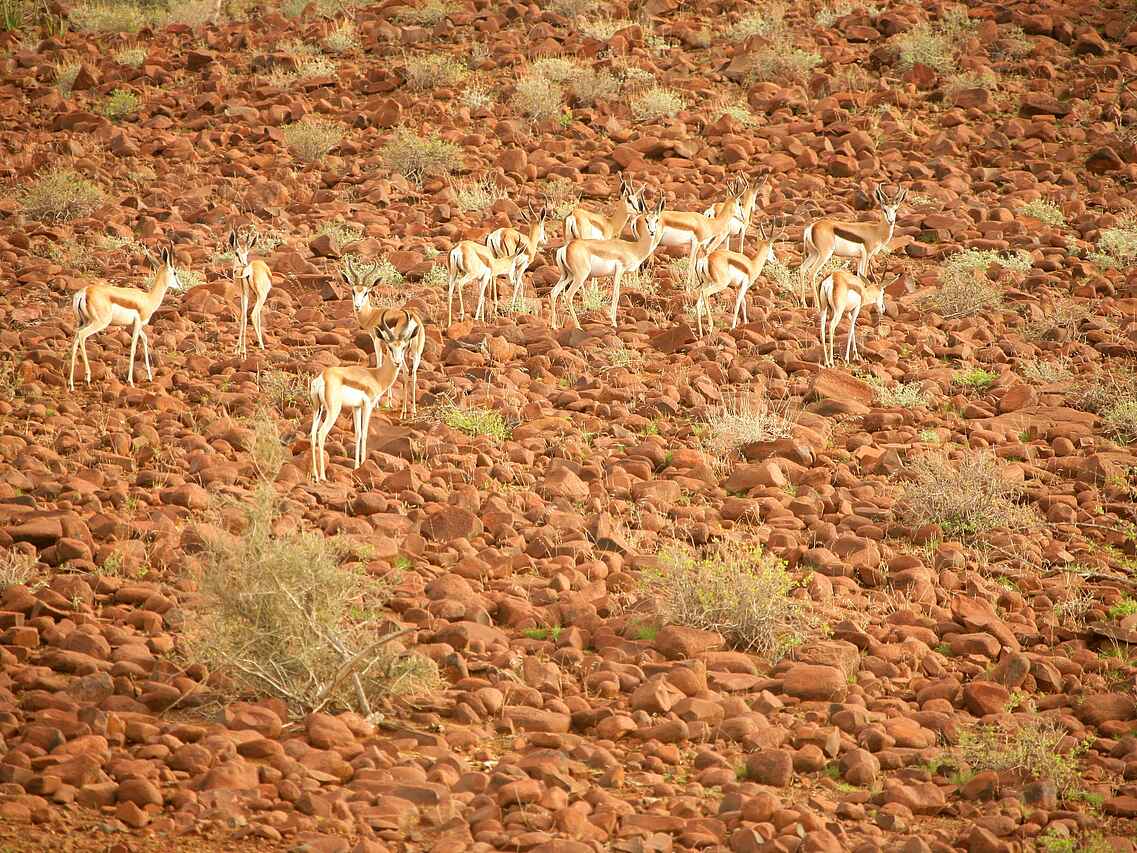 Das Damaraland ist ganzjährig bereisbar, wobei die Trockenzeit von Mai bis Oktober als beste Reisezeit für Tierbeobachtungen gilt. In diesen Monaten sind die Temperaturen moderat und Tiere halten sich verstärkt in den Trockenflusstälern auf. Die Sommermonate von November bis März sind wärmer und können kurze Regenfälle bringen. Die Landschaft wirkt dann frischer, Sichtungen sind weiterhin möglich, erfordern jedoch mehr Geduld. Die Wintermonate bieten klare Tage, kühle Nächte und sehr gute Bedingungen für Aktivitäten.
