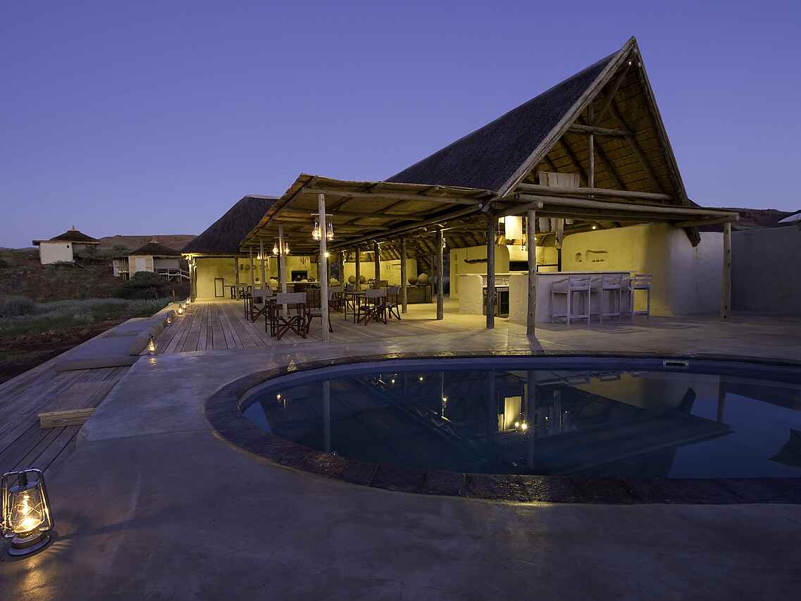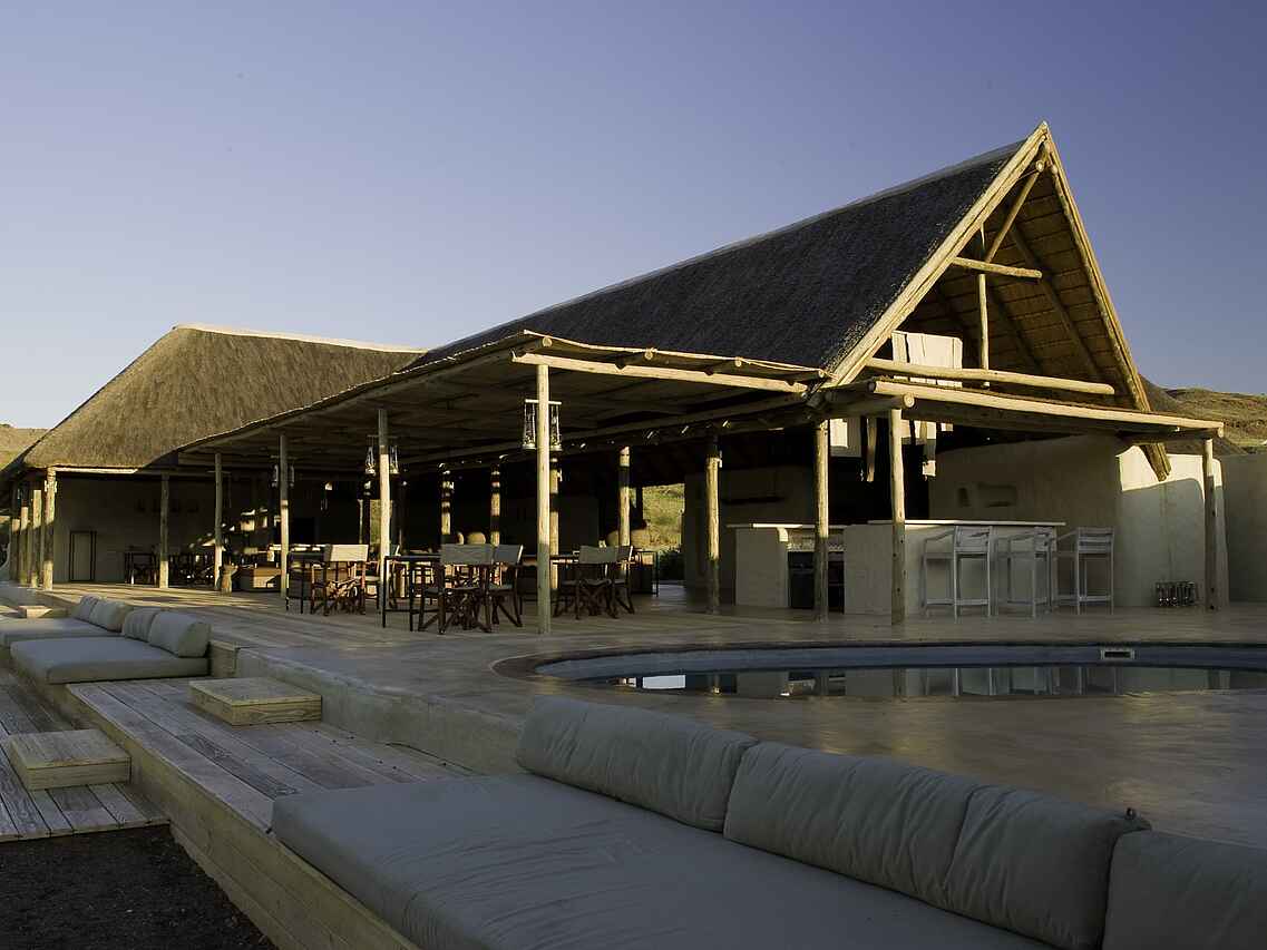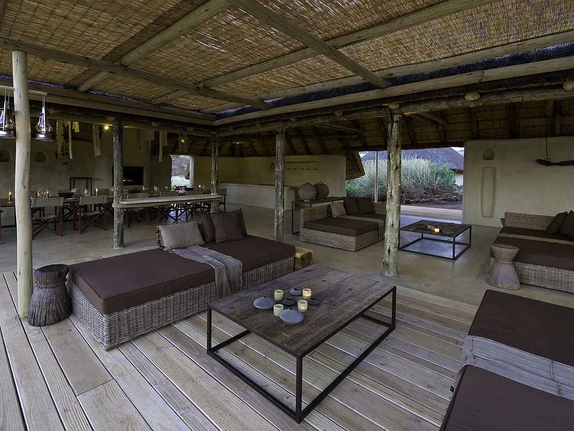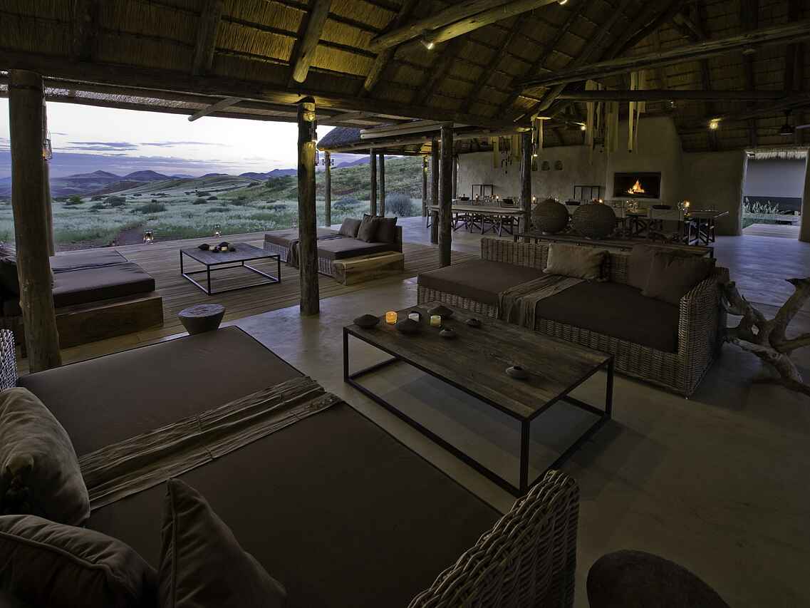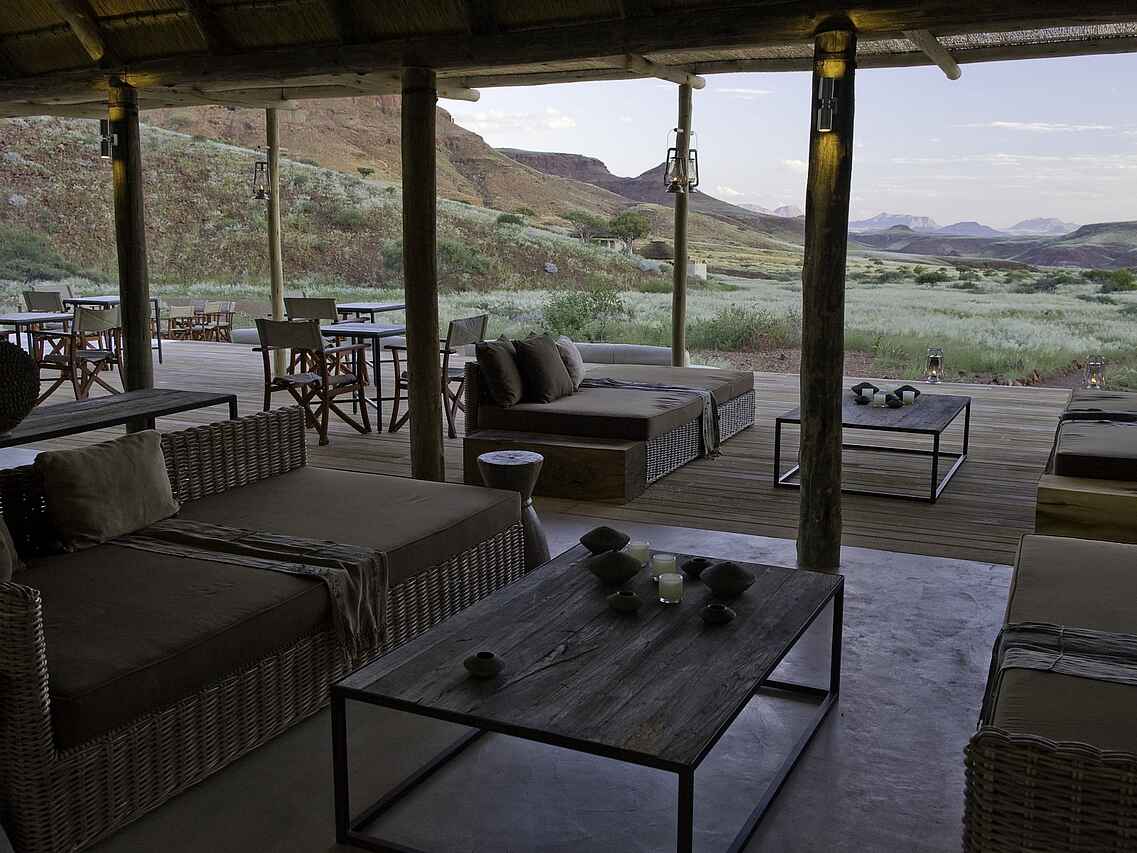 Der zentrale Bereich des Damaraland Camp ist aus Stein gebaut und mit einem hohen Reetdach versehen. Lounge, Bar und Essbereich sind offen angelegt und bilden den Treffpunkt zwischen den Aktivitäten. Tiefe Sofas mit großen Kissen, ein offener Kamin sowie eine Tee- und Kaffeestation stehen den Gästen zur Verfügung. Ergänzt wird der Bereich durch einen kleinen Shop mit ausgewähltem Kunsthandwerk und eine kleine Bibliothek. Im Außenbereich befindet sich ein Swimmingpool mit Liegen in schattiger Lage. Eine vorgelagerte Terrasse mit großen Sitzkissen eröffnet den Blick in die umliegende Landschaft. Die Mahlzeiten finden an einer langen Tafel im Essbereich oder je nach Wetter in der Boma statt, die etwas vor dem Camp liegt und abends beleuchtet wird.
