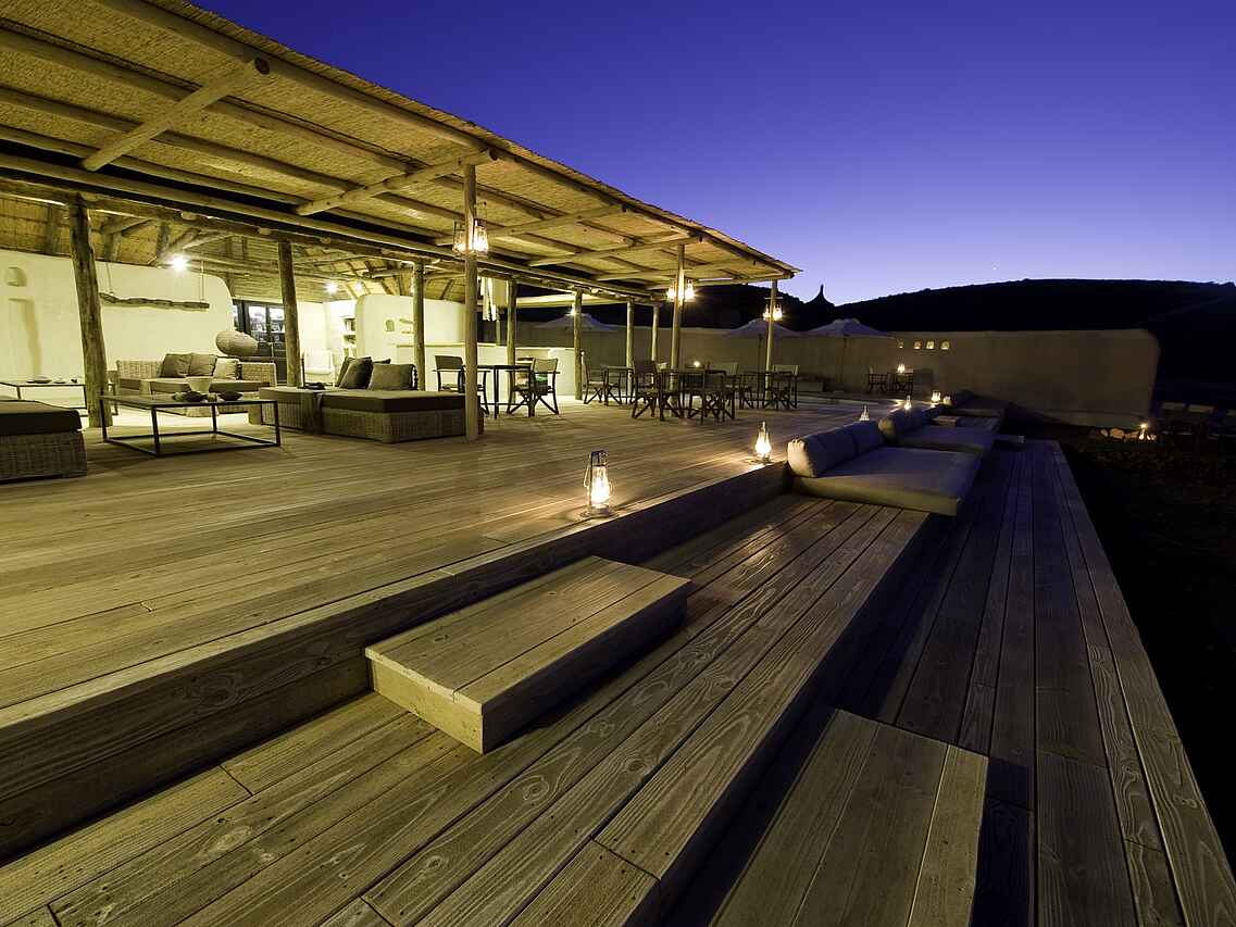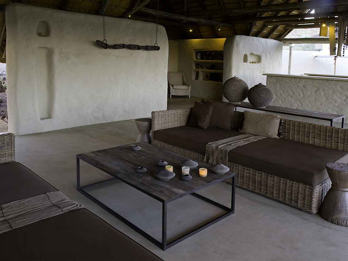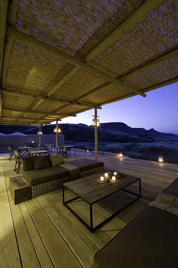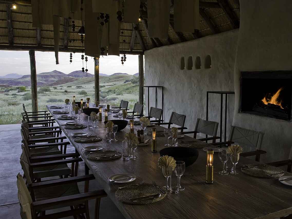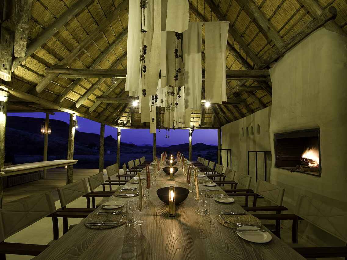 Der zentrale Bereich des Damaraland Camp ist aus Stein gebaut und mit einem hohen Reetdach versehen. Lounge, Bar und Essbereich sind offen angelegt und bilden den Treffpunkt zwischen den Aktivitäten. Tiefe Sofas mit großen Kissen, ein offener Kamin sowie eine Tee- und Kaffeestation stehen den Gästen zur Verfügung. Ergänzt wird der Bereich durch einen kleinen Shop mit ausgewähltem Kunsthandwerk und eine kleine Bibliothek. Im Außenbereich befindet sich ein Swimmingpool mit Liegen in schattiger Lage. Eine vorgelagerte Terrasse mit großen Sitzkissen eröffnet den Blick in die umliegende Landschaft. Die Mahlzeiten finden an einer langen Tafel im Essbereich oder je nach Wetter in der Boma statt, die etwas vor dem Camp liegt und abends beleuchtet wird.