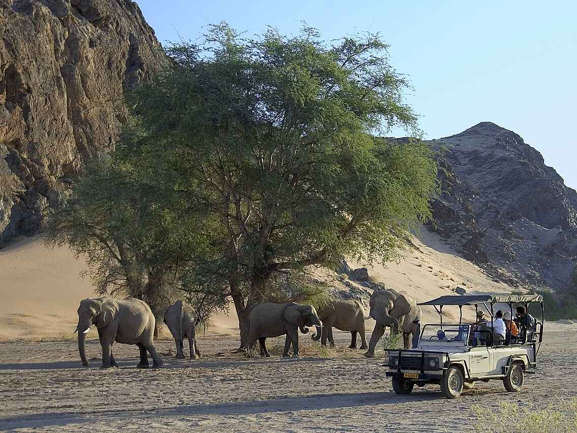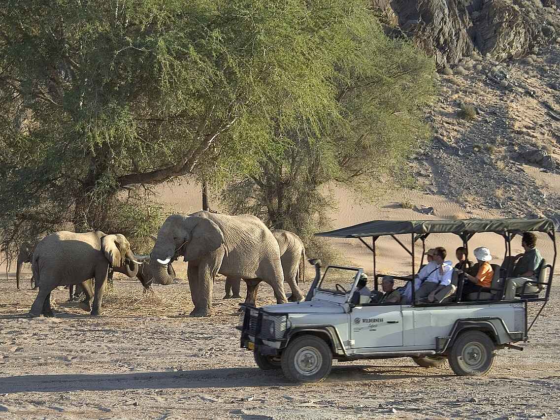 Der Schwerpunkt der Aktivitäten im Damaraland Camp liegt auf geführten Naturfahrten im offenen Geländewagen. Diese konzentrieren sich auf die Beobachtung wüstenangepasster Elefanten und weiterer Tierarten, die sich entlang der Trockenflüsse bewegen. Ergänzt wird das Angebot durch geführte Wanderungen, bei denen Geologie, Flora und ökologische Zusammenhänge thematisiert werden. Kulturelle Begegnungen mit der lokalen Bevölkerung ermöglichen Einblicke in traditionelle Lebensweisen der Region. Auch Tagesausflüge zu den Felsgravuren von Twyfelfontein sind fester Bestandteil des Aktivitätsprogramms. Die Guides sind ortskundig und vermitteln fundiertes Wissen über Landschaft und Tierwelt.
