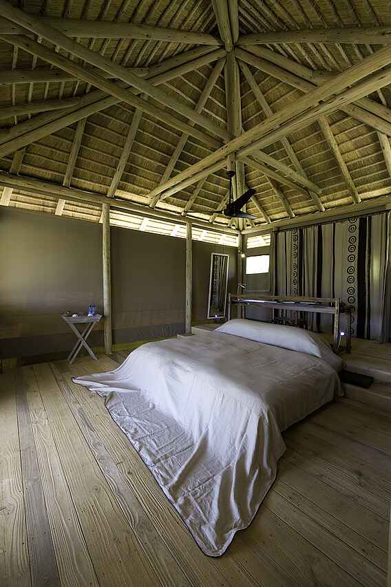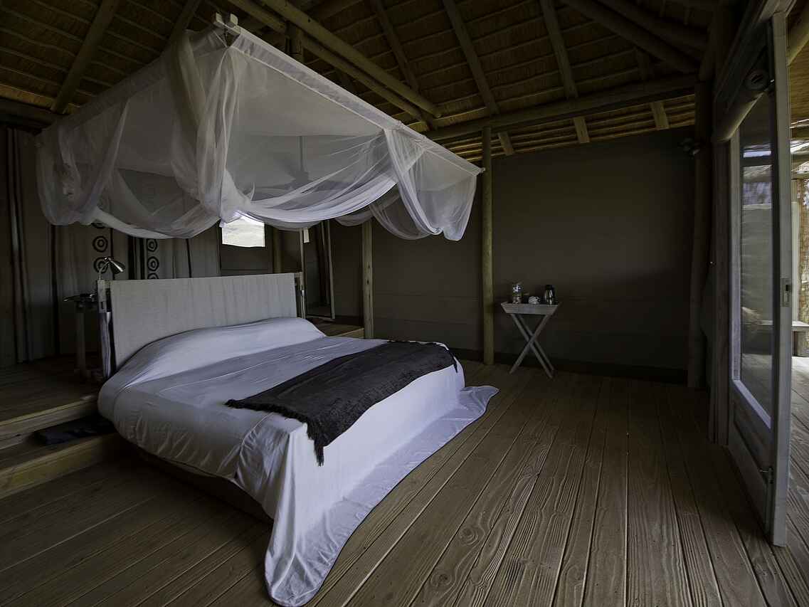 Die Gästeunterkünfte im Damaraland Camp bestehen aus zehn großzügigen Chalets, die hell, offen und sorgfältig gestaltet sind. Sie stehen leicht erhöht auf niedrigen Plattformen und verfügen über eine private Veranda mit Ausblick in die Landschaft. Im Schlafbereich befinden sich ein Doppelbett oder zwei Einzelbetten, ergänzt durch Moskitonetze und Leselampen. Daran schließt sich ein Ankleidebereich mit Gepäckablage und großem Schreibtisch an. Zur weiteren Ausstattung gehören ein Ventilator, Kaffee- und Teezubereitungsmöglichkeiten, Trinkwasser und Insektenschutz. Das geräumige En-suite-Badezimmer ist offen gestaltet und mit Doppelwaschbecken, ausgewählten Pflegeprodukten sowie einer großzügigen Dusche mit Fenster und Sichtschutz ausgestattet. Eine Unterkunft ist als Familienchalet konzipiert und verfügt über zwei Schlafzimmer mit jeweils eigenem Badezimmer.