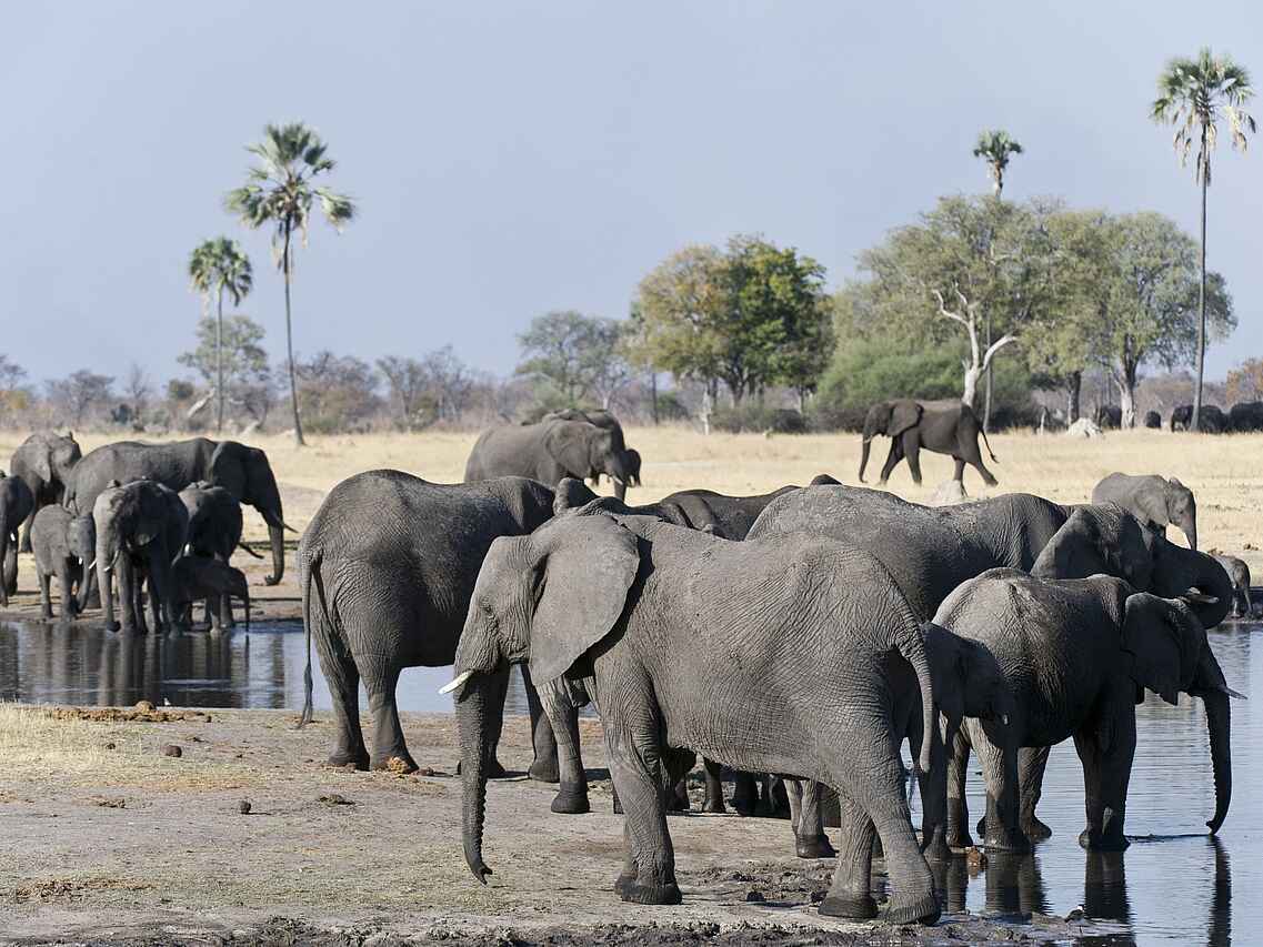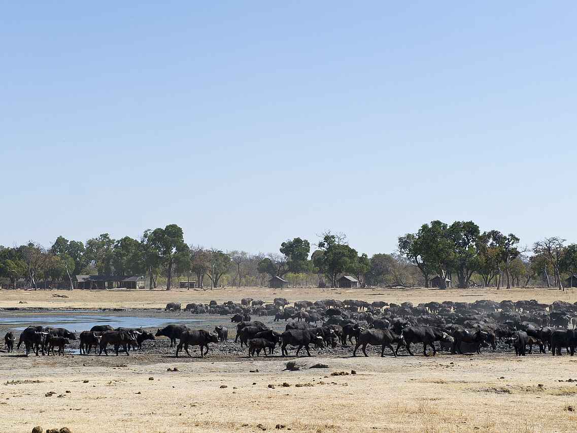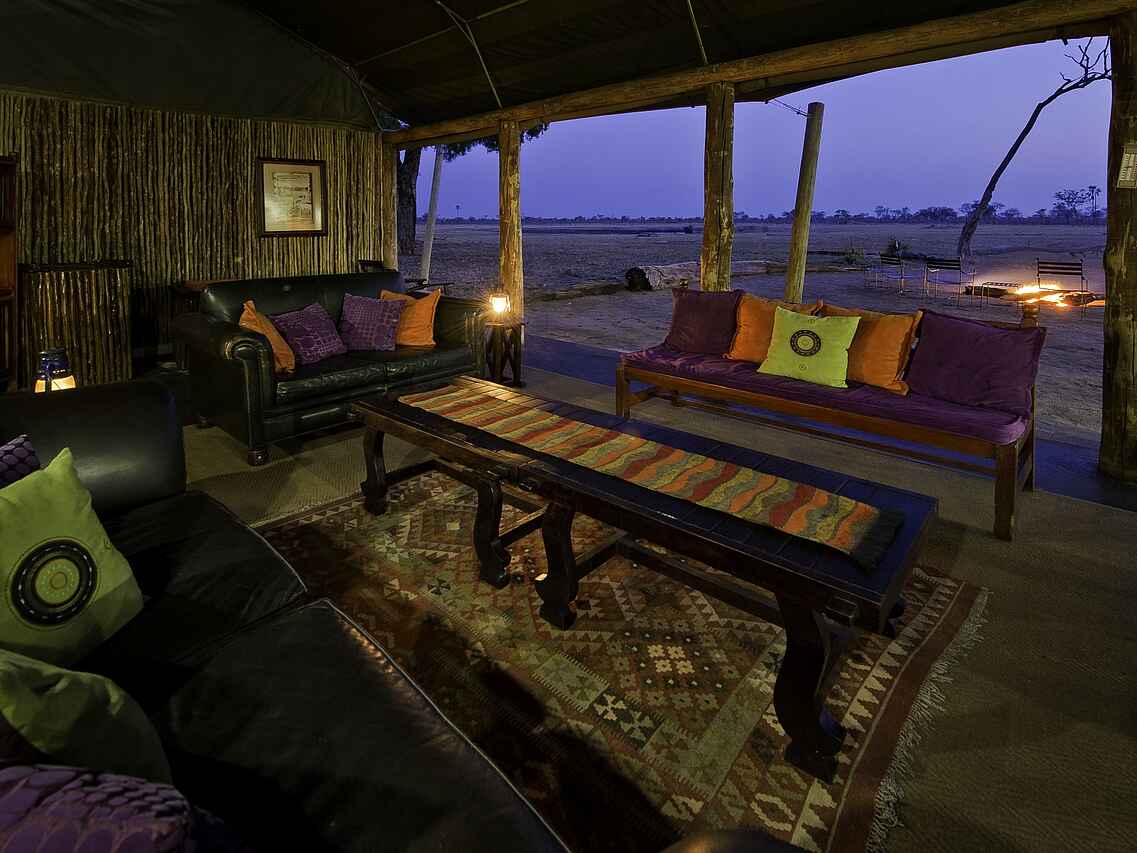 In einer exklusiven Konzession im süd-östlichen Teil des Hwanga National Park gelegen. Umgeben von Mopane-Bäumen. Offener Blick auf ein eigenes Wasserloch.