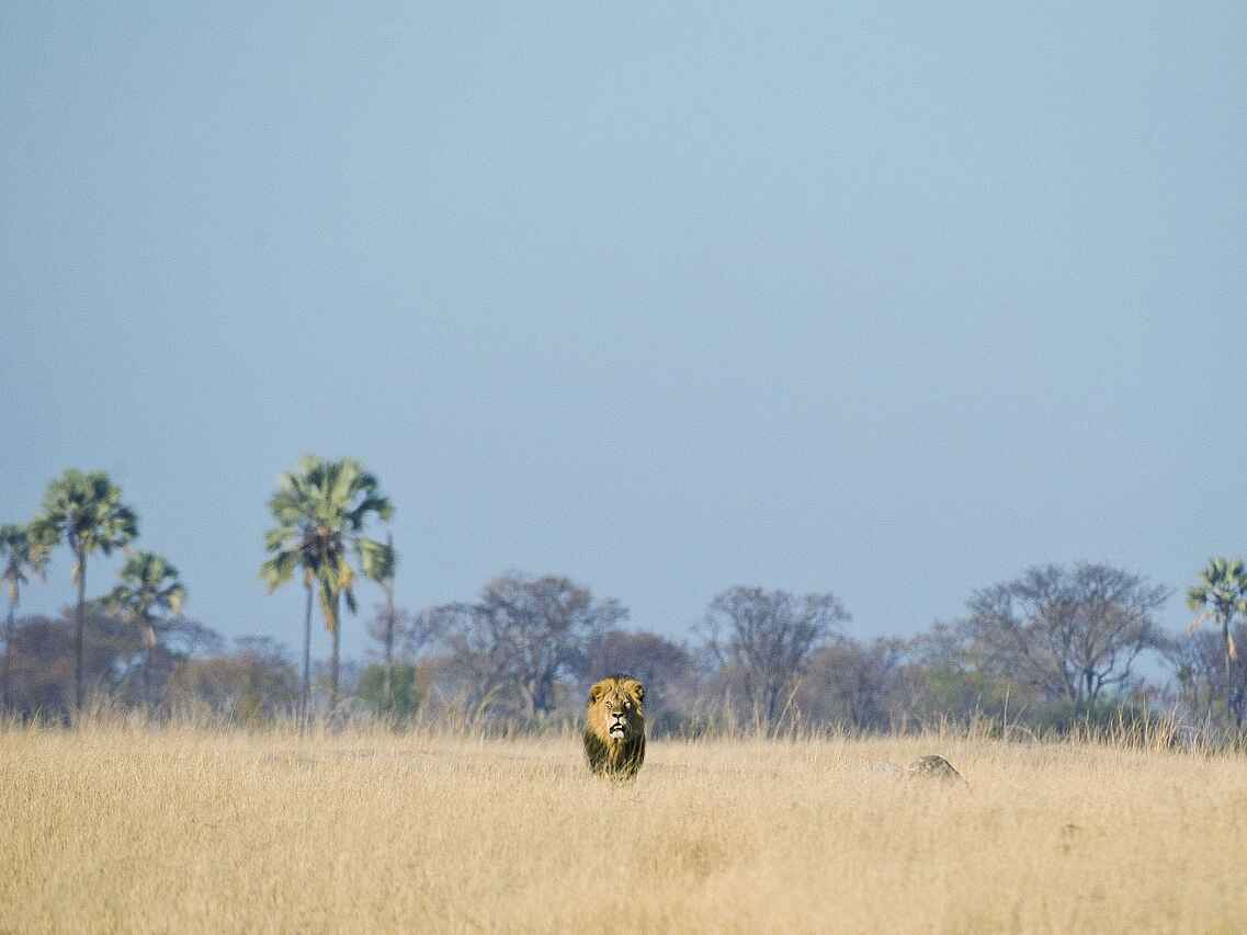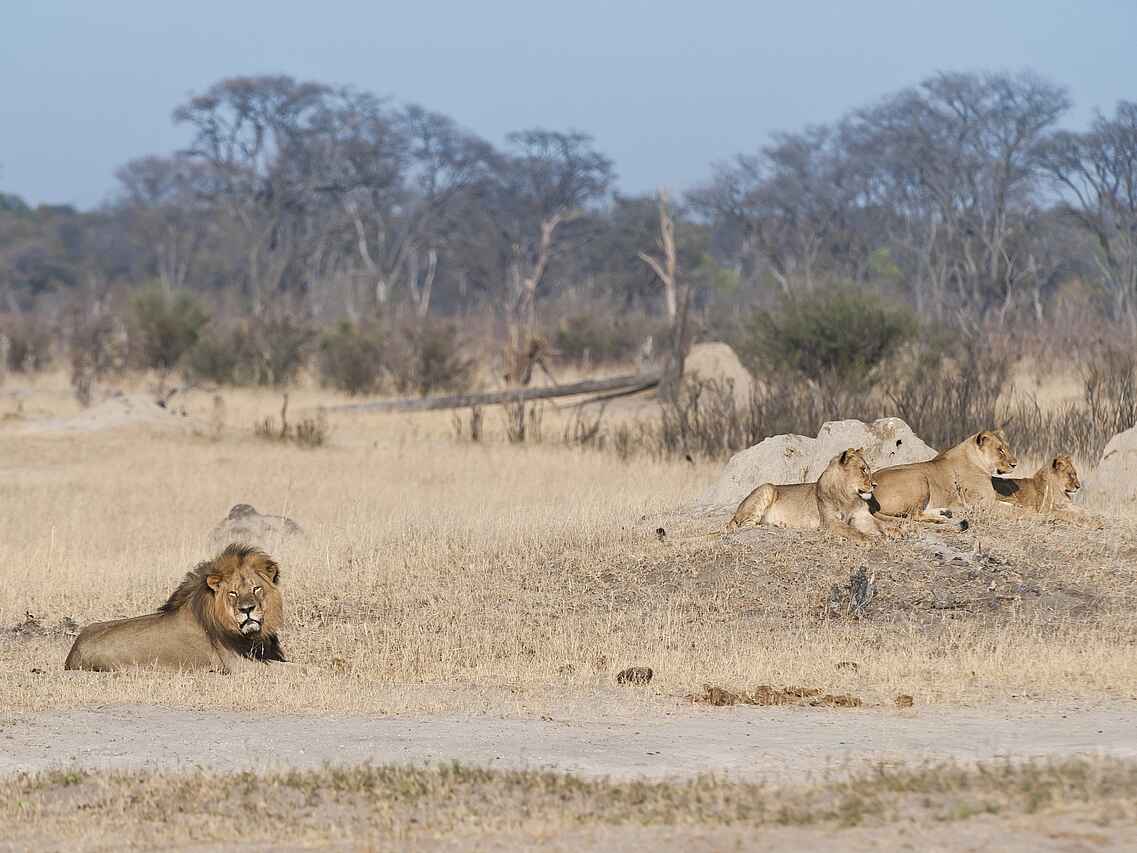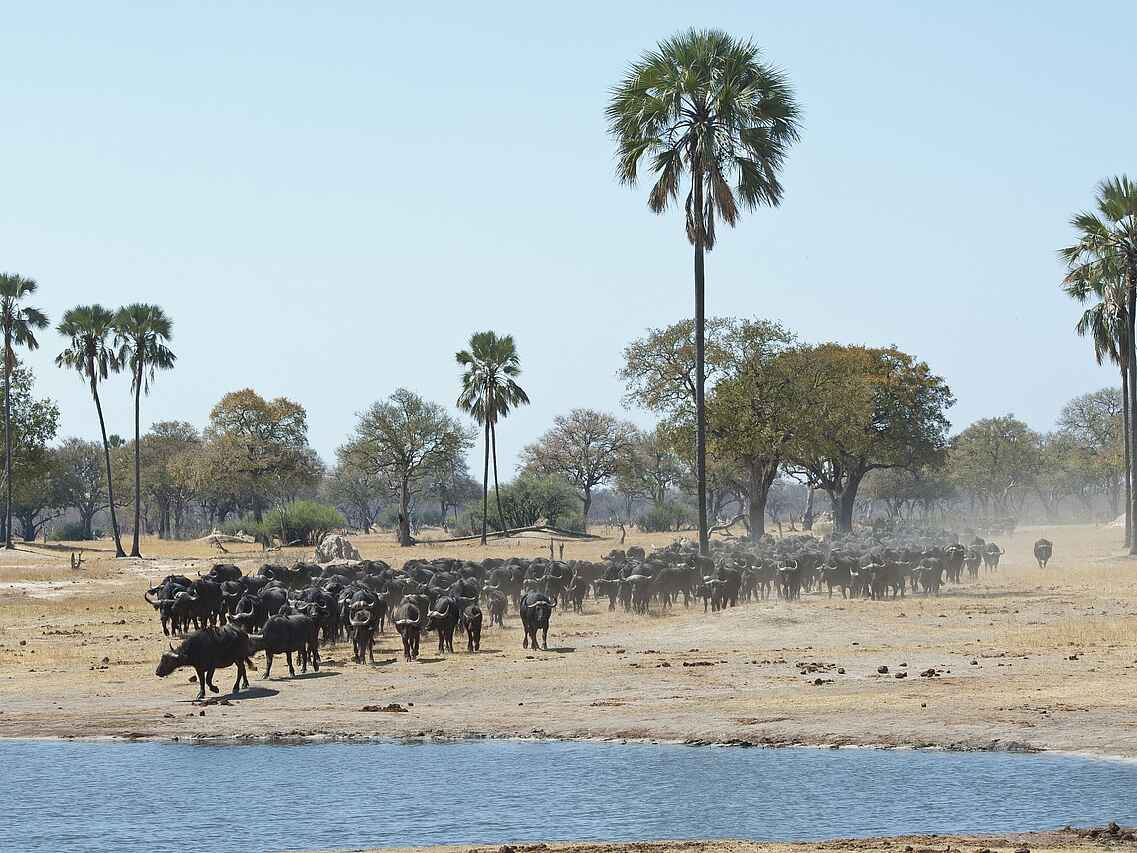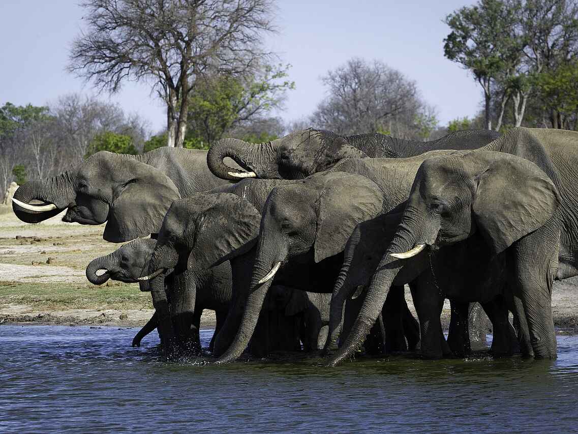 In einer exklusiven Konzession im süd-östlichen Teil des Hwanga National Park gelegen. Umgeben von Mopane-Bäumen. Offener Blick auf ein eigenes Wasserloch.