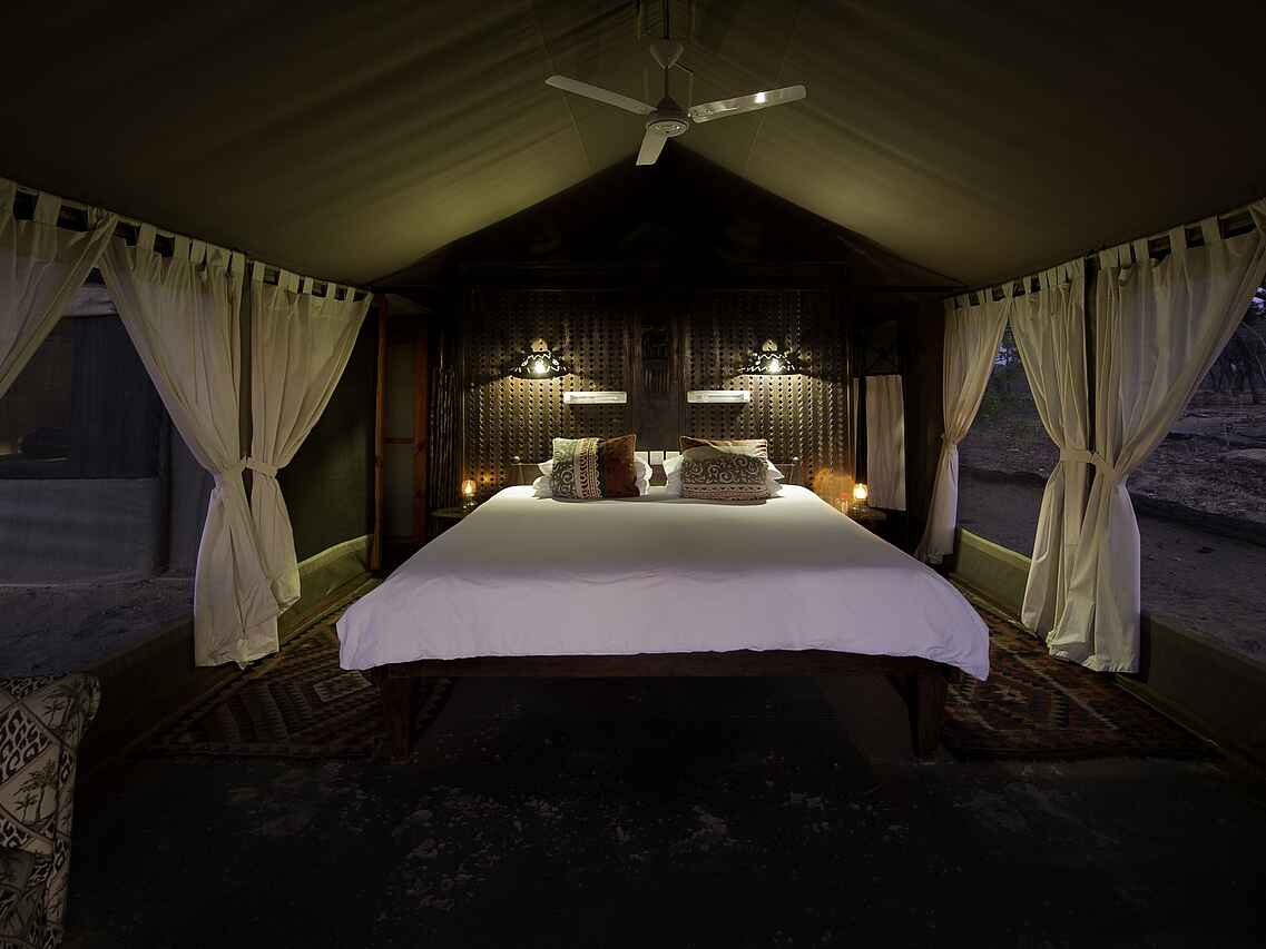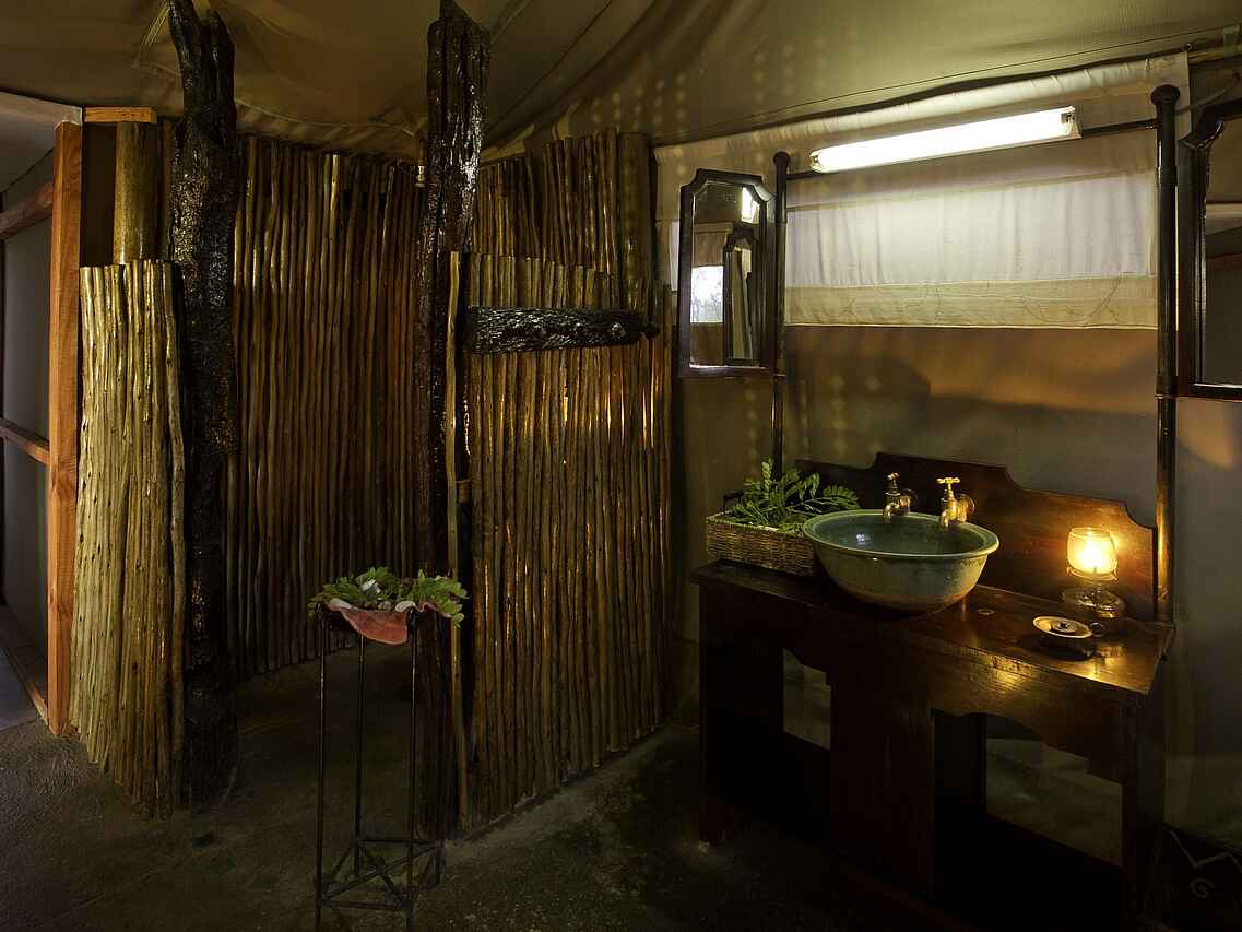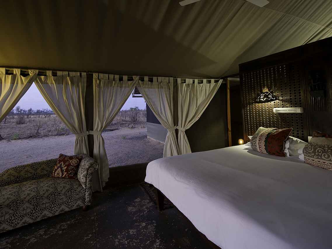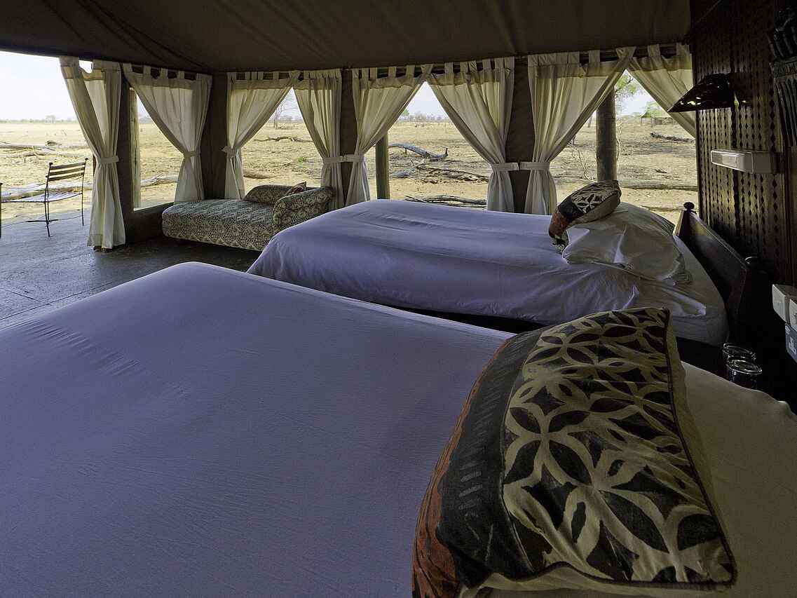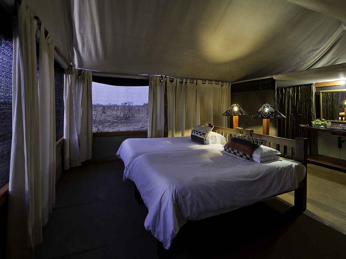 Blick vom Bett aufs Wasserloch! Alle Gästezelte mit en-suite Badezimmern mit Bambusdusche, Waschbecken, fließendem Kalt- und Warmwasser ausgestattet und durch geschmacksvolle Holzwand vom Schlafbereich getrennt. Sehr geräumige und große Fenster damit kein Anblick des Buschs verloren geht.