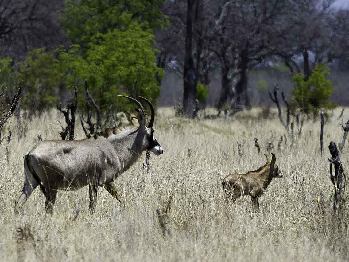 Große Elefanten- und Büffelherden sind das Highlight! Über 100 Säugetieraten. Löwen, Leoparden, weiße Nashörner (selten), Giraffen, Wildebeest, Zebra, Säbelantilopen, Pferdeantilopen, Wasserböcke, verschiedene Greifvogelarten, Crimson Breasted Shrike, Tropical Boubou, White Hooded Vulture,etc.