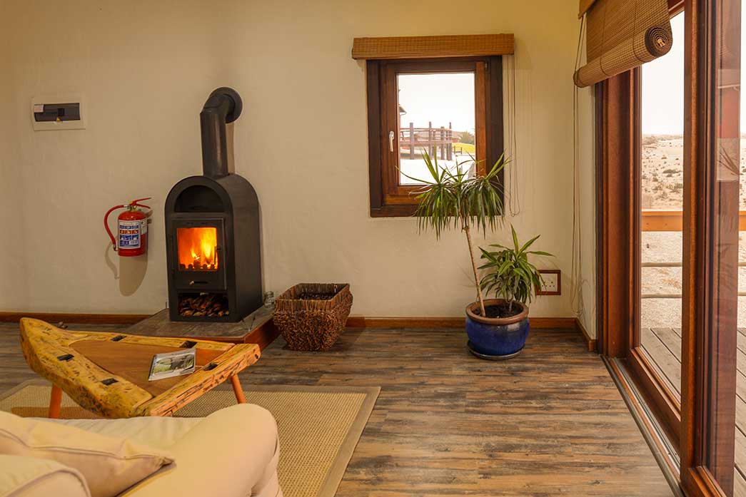12 Gästebungalows mit privaten Bädern -Dusche, Waschbecken, WC, fließend Kalt- und Warmwasser - sowie eine Villa mit 3 Schlafzimmern und eine Jungle Villa mit 2 Schlafzimmern. Beide können nur als Ganze gebucht werden. Jeweils Kamin, WLAN, Tee / Kaffee, Safe, Standventilator. Kleine Lounges mit Sofas und einfachen Teppichen. Bei den Bungalows sind jeweils die Außenmauern der Bädern intensiv bund bemalt, inf blaiu, grün, türkis, rot oder orange. Aus den Schlafzimmern schaut man auf die Dünen am anderen Ufer des Swakop River.