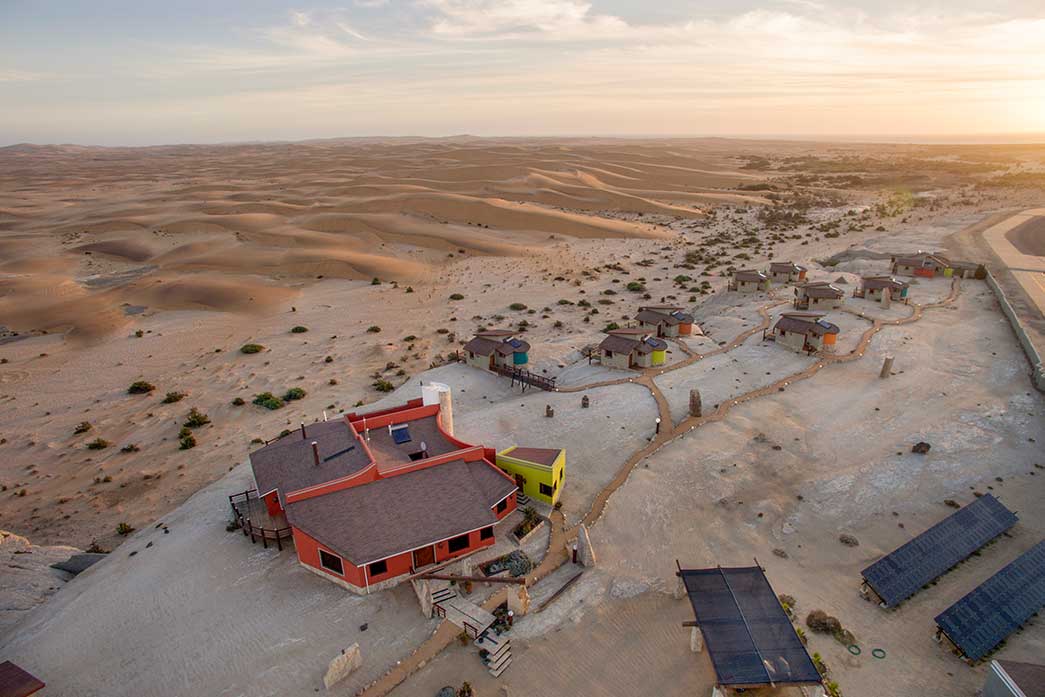 Trotz der kurzen Entfernung zum Stadtzentrum von Swakopmund bietet Desert Breeze Lodge eine Atmosphäre wie sonst nur die Lodges am Sossusvlei. Auf der gegenüberligenden Seite des trockenen Flussbettes breiten sich niedrige Dünen aus. Naturnahes Ambiete und ungewöhnliche Architektur für budgetbewusste Gäste.