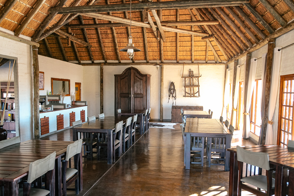 Gegessen wird je nach Wetterlage auf der Terrasse mit Blick in die Wüste oder im gemütlichen Innenbereich. Die Küche legt Wert auf frische, regionale Zutaten und verbindet namibische Spezialitäten mit internationalen Einflüssen. Zum Frühstück gibt es eine reichhaltige Auswahl an Brot, Aufschnitt, Obst, Eierspeisen und Müsli. Mittags wird ein leichtes Mahl serviert, abends ein mehrgängiges Dinner. Trinkwasser, Tee und Kaffee sind inklusive, weitere Getränke stehen an der Bar bereit.