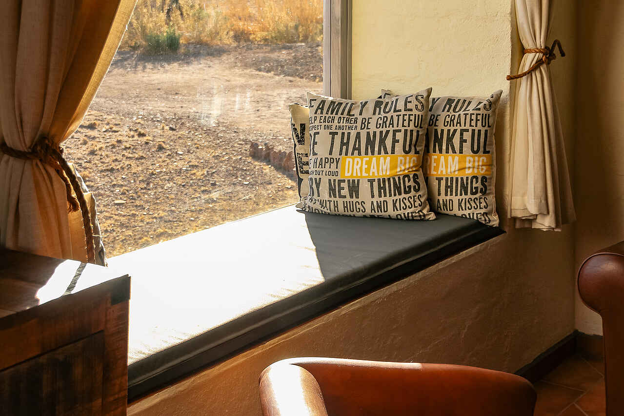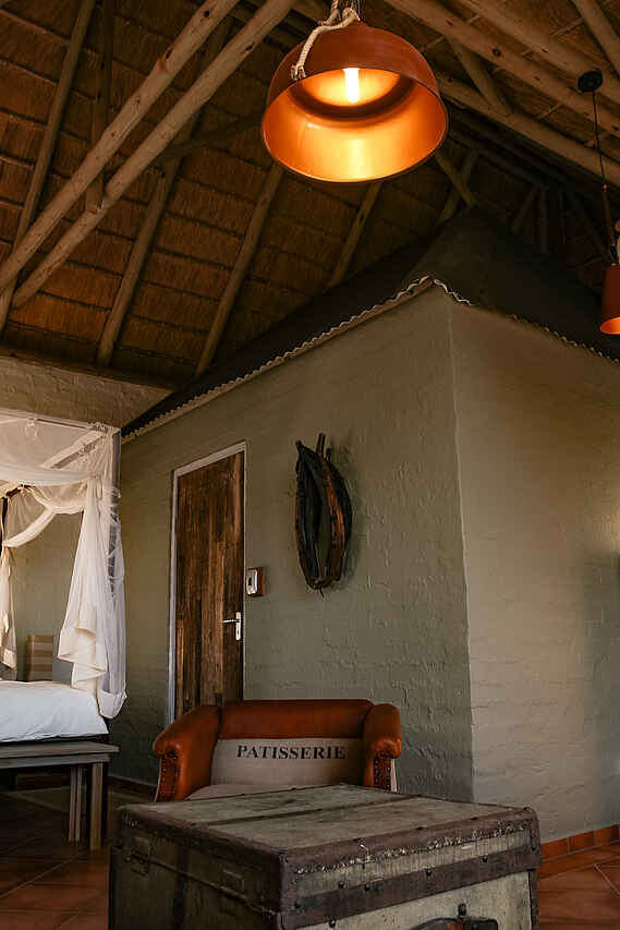 Die Chalets der Desert Homestead Lodge erinnern mit ihren Reetdächern und Natursteinwänden an traditionelle Farmhäuser. Innen erwarten die Gäste großzügiger Raum, klare Linien und liebevoll ausgewählte Details. Jedes Chalet verfügt über eine private, möblierte Terrasse mit weitem Blick über das Tal, bequeme Betten mit Moskitonetz, eine Klimaanlage, einen Safe sowie eine Kaffee- und Teestation. Die En-suite Badezimmer sind mit Dusche, Waschtisch, flauschigen Handtüchern und Pflegeprodukten ausgestattet. Für Familien oder kleine Gruppen steht ein geräumiges Chalet mit zwei Schlafzimmern, einem gemeinsamen Bad und einem gemütlichen Wohnbereich zur Verfügung.