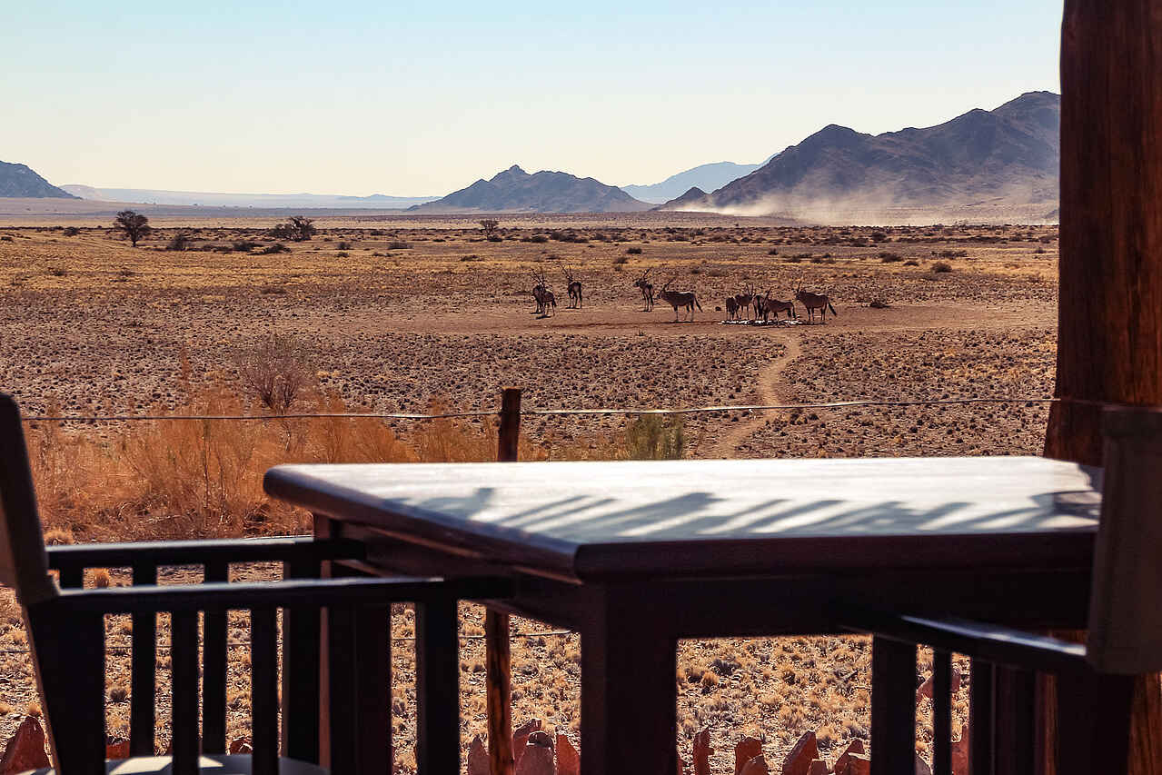 Die Wüstenlandschaft rund um die Lodge ist Heimat für zahlreiche an Trockenheit angepasste Arten. Regelmäßig zu sehen sind Oryxantilopen, Springböcke, Strauße und Hartmann-Zebras. Mit etwas Glück zeigen sich Schabrackenhyänen, Stachelschweine oder Kapfüchse. Auch Vogelbeobachter kommen auf ihre Kosten: Neben Wüstenlerchen und Raben sind oft auch Riesentrappen und andere charakteristische Arten der Region zu beobachten.