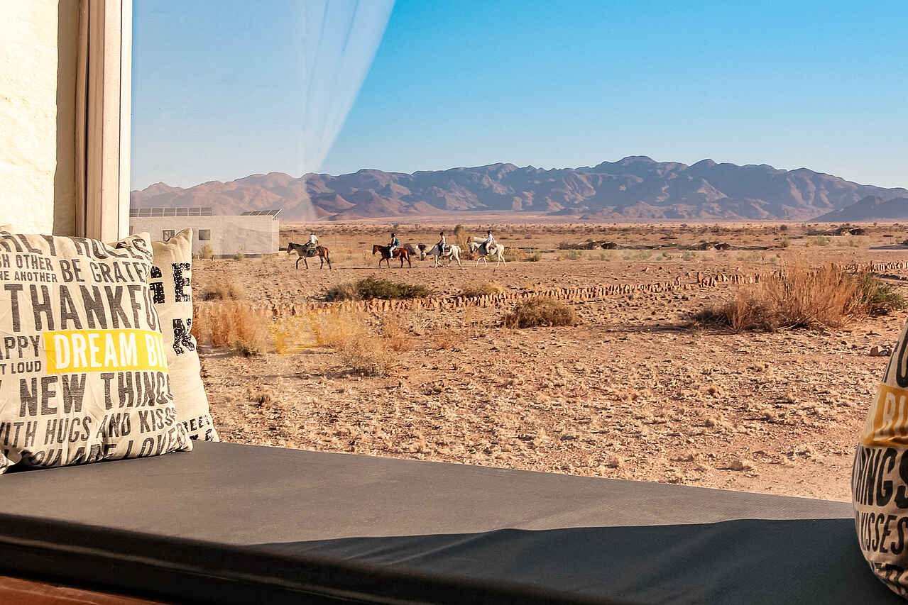Kinder sind willkommen und finden im Familienchalet ausreichend Platz. Für Reitausflüge gelten aus Sicherheitsgründen Alters- und Größenbeschränkungen, die vor Ort erfragt werden sollten. Ausflüge nach Sossusvlei oder zu Fuß in die Umgebung sind auch für Familien mit jüngeren Kindern geeignet.