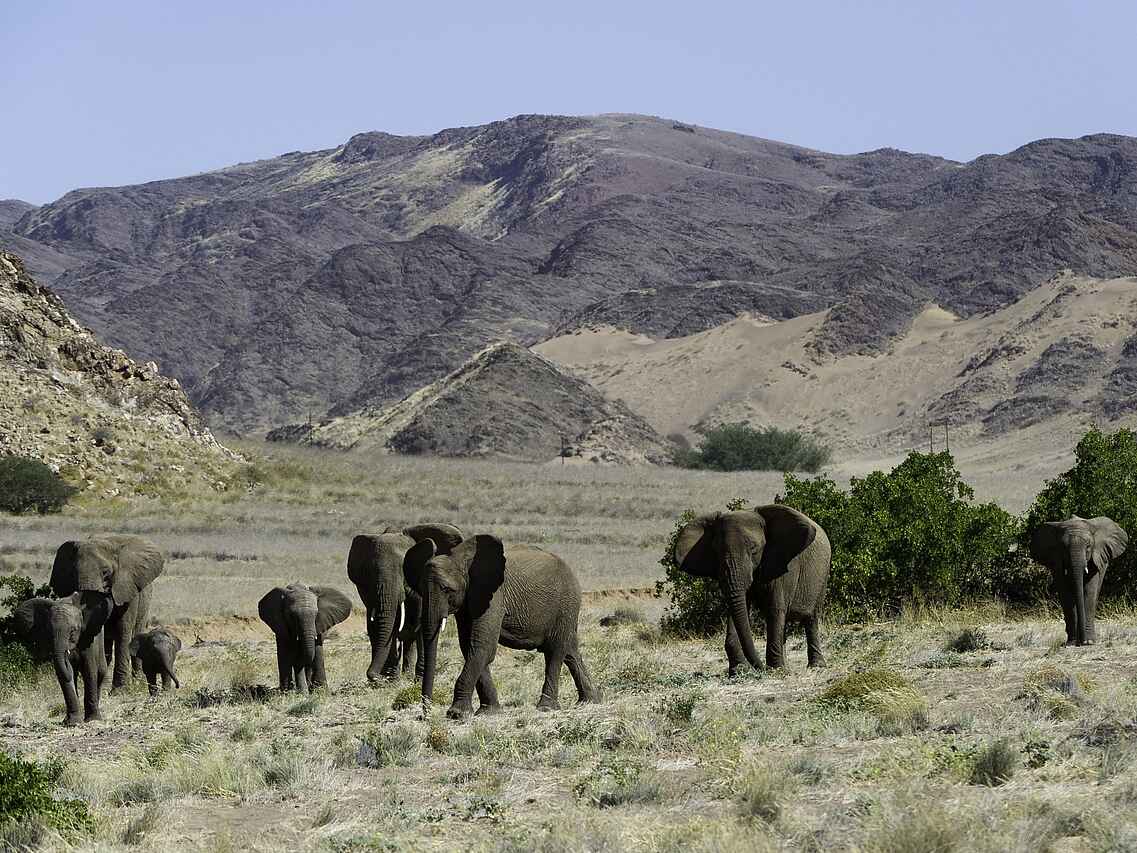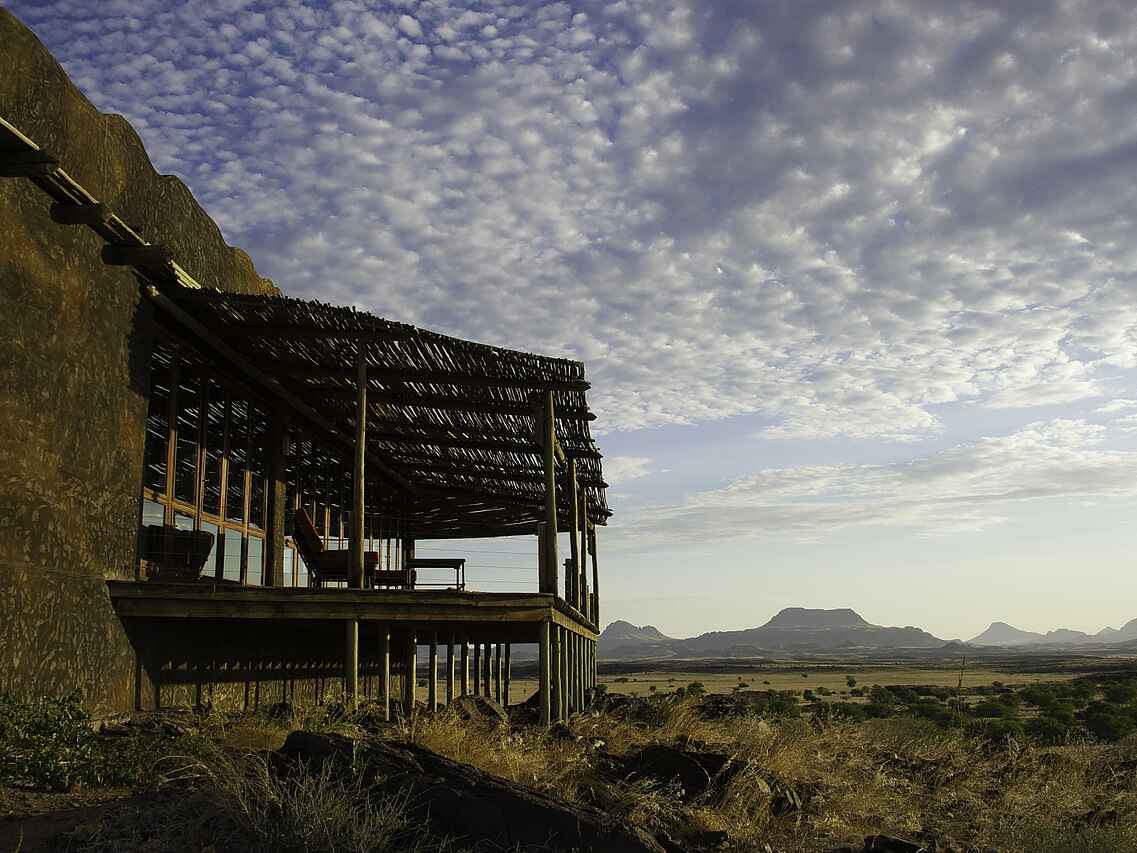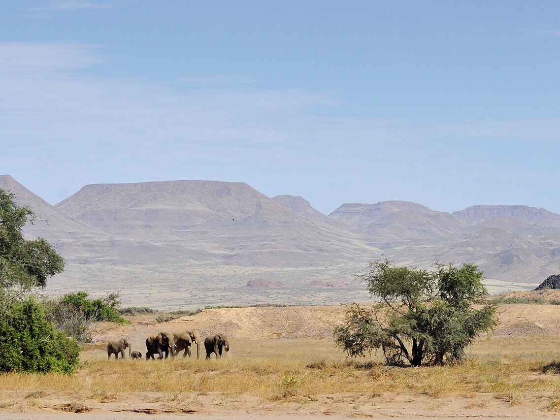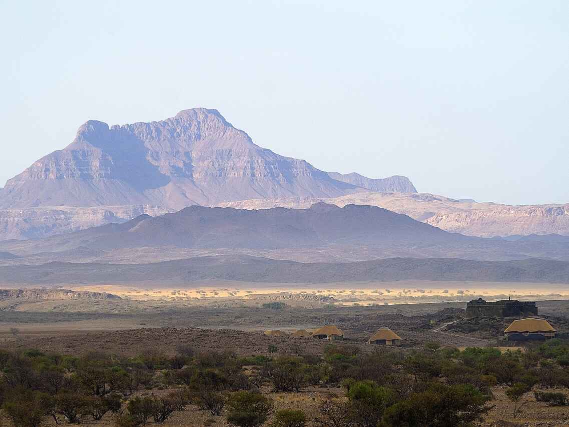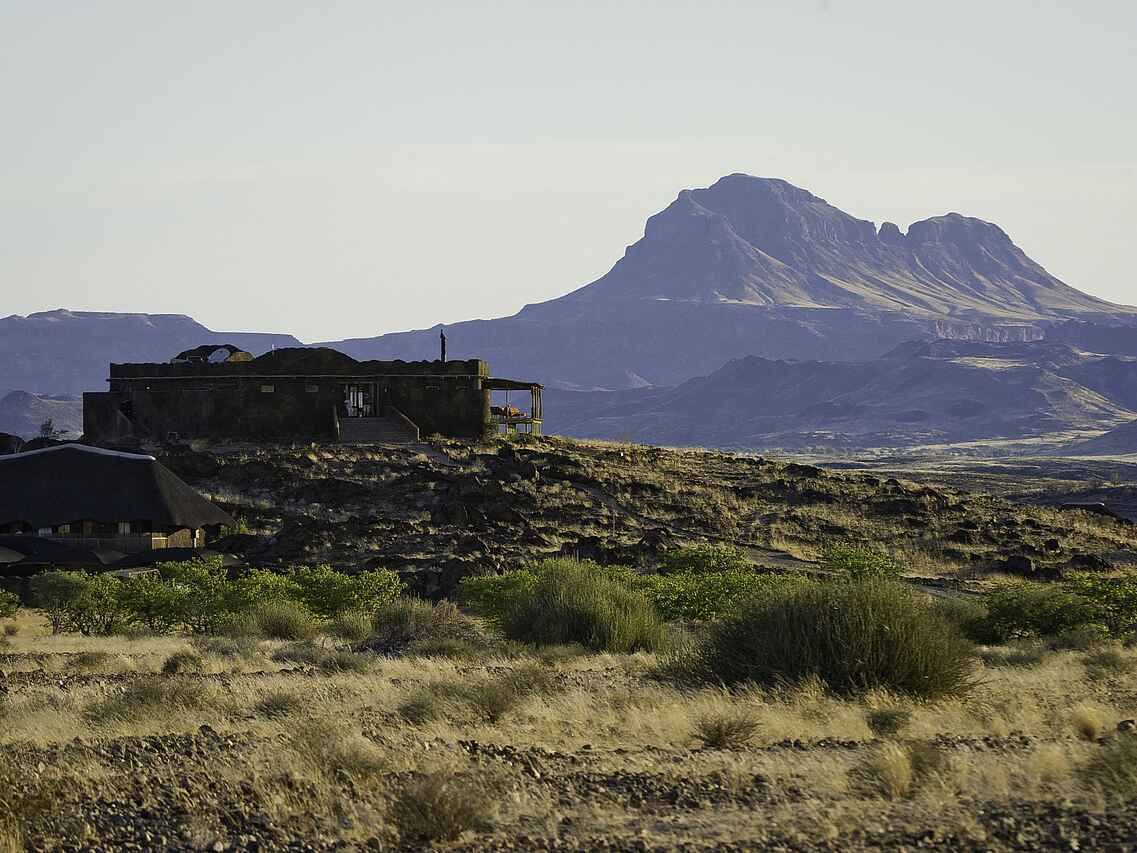 Das Doro Nawas Camp liegt in Namibia in der Region Damaraland, einer landschaftlich eindrucksvollen Gegend mit weiten Ebenen, trockenen Flussläufen und markanten Felsformationen. Die Lage nahe des Aba Huab Trockenflusses ermöglicht Einblicke in einen Lebensraum wüstenangepasster Elefanten, Antilopen und weiterer Tierarten. Ergänzt werden die Tierbeobachtungen durch geologische Besonderheiten und kulturelle Aspekte der Region. Das Camp wurde in Zusammenarbeit mit der lokalen Bevölkerung aufgebaut, viele Mitarbeitende stammen aus dem Damaraland und sind mit Landschaft, Tierwelt und Kultur der Region bestens vertraut.