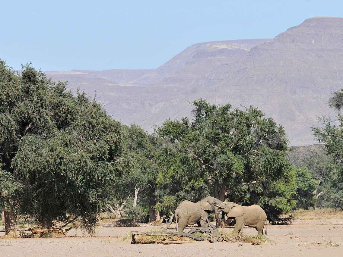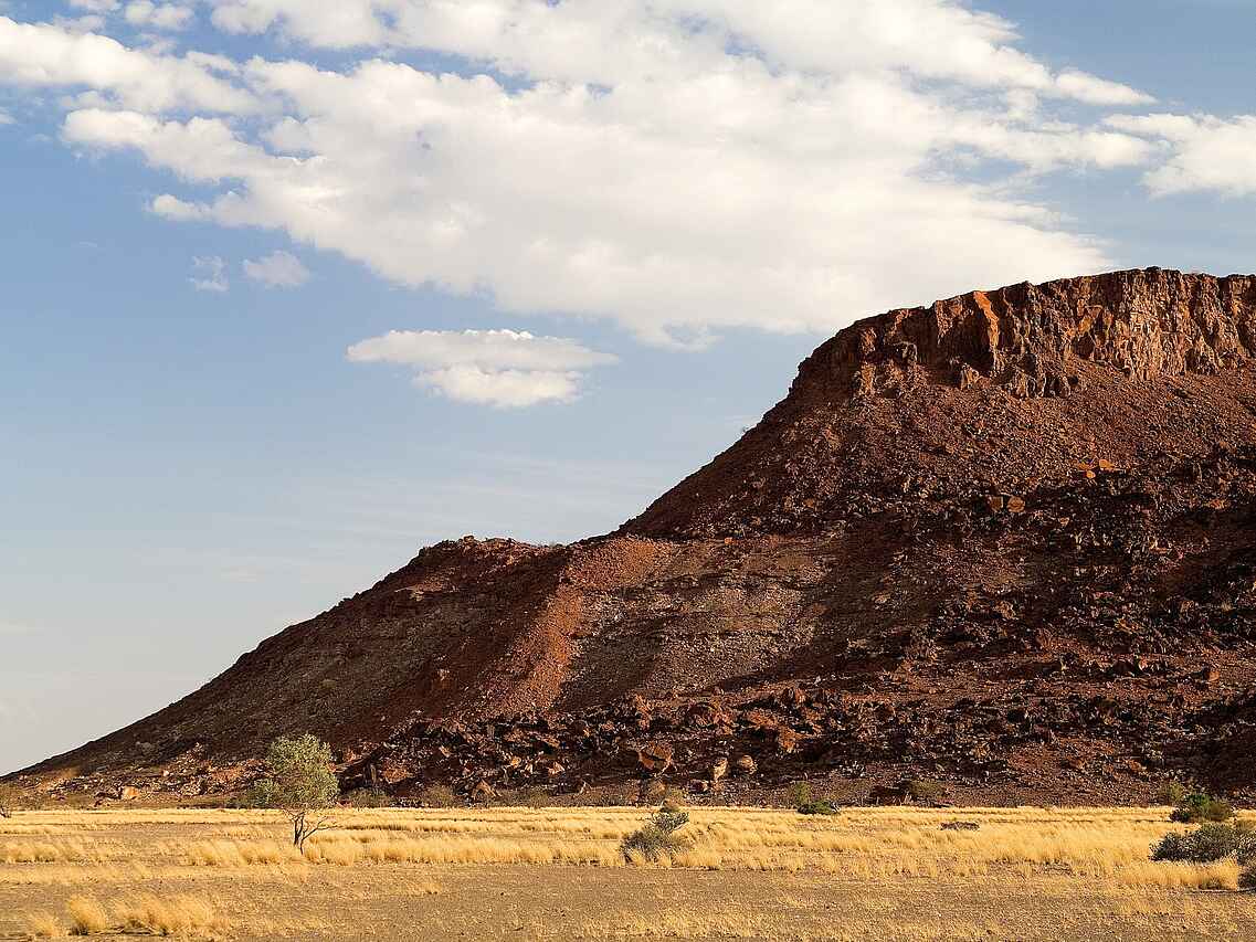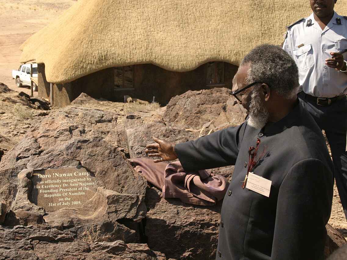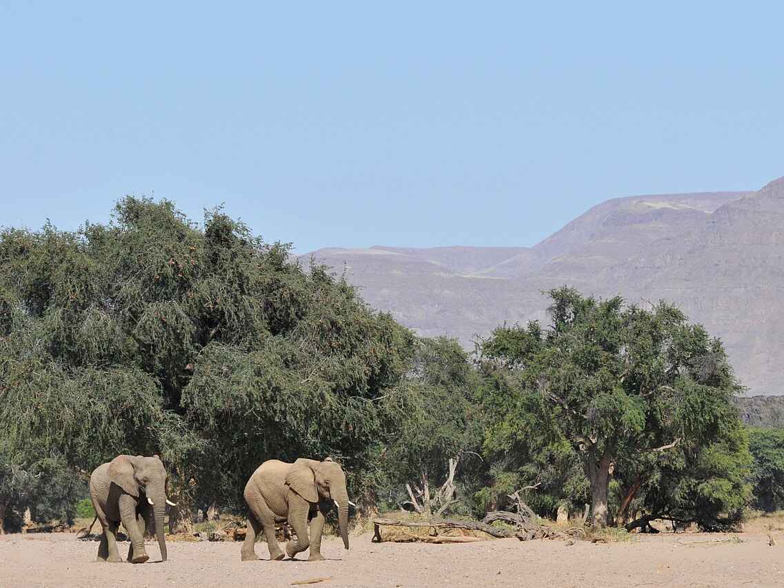 Das Doro Nawas Camp liegt in Namibia in der Region Damaraland, einer landschaftlich eindrucksvollen Gegend mit weiten Ebenen, trockenen Flussläufen und markanten Felsformationen. Die Lage nahe des Aba Huab Trockenflusses ermöglicht Einblicke in einen Lebensraum wüstenangepasster Elefanten, Antilopen und weiterer Tierarten. Ergänzt werden die Tierbeobachtungen durch geologische Besonderheiten und kulturelle Aspekte der Region. Das Camp wurde in Zusammenarbeit mit der lokalen Bevölkerung aufgebaut, viele Mitarbeitende stammen aus dem Damaraland und sind mit Landschaft, Tierwelt und Kultur der Region bestens vertraut.