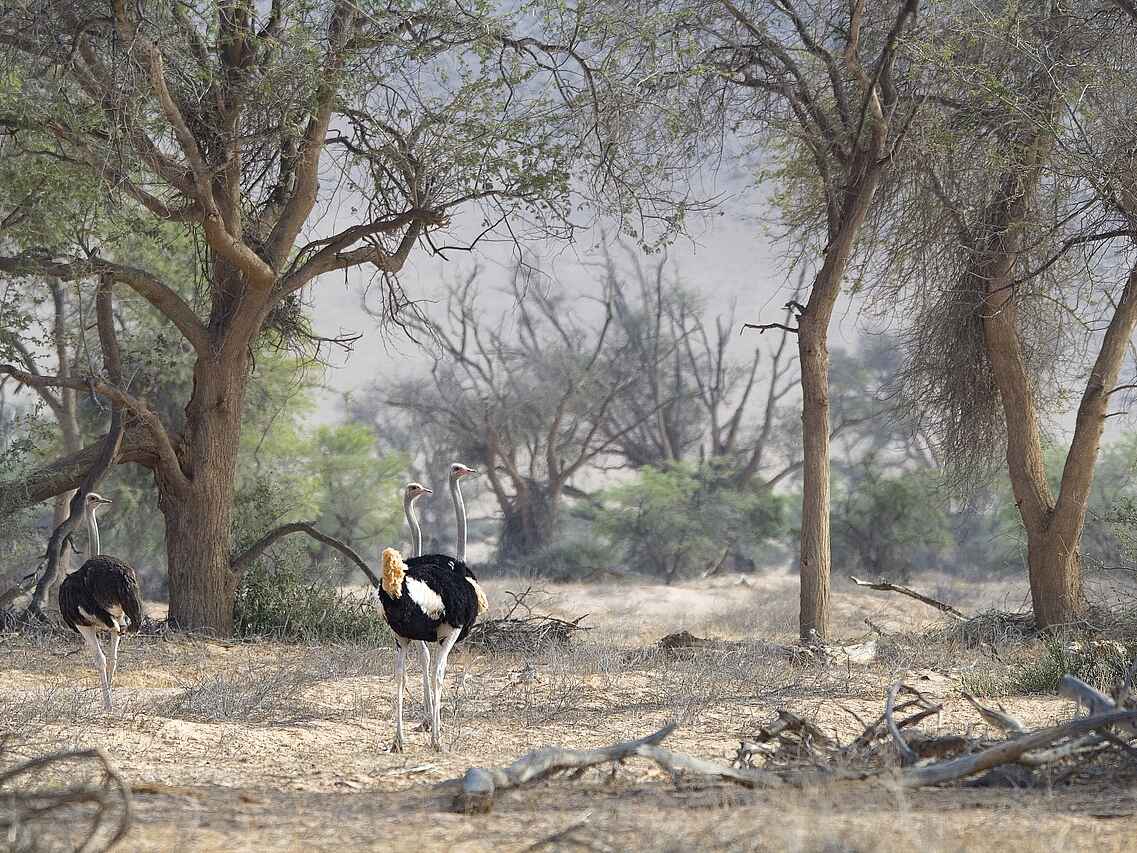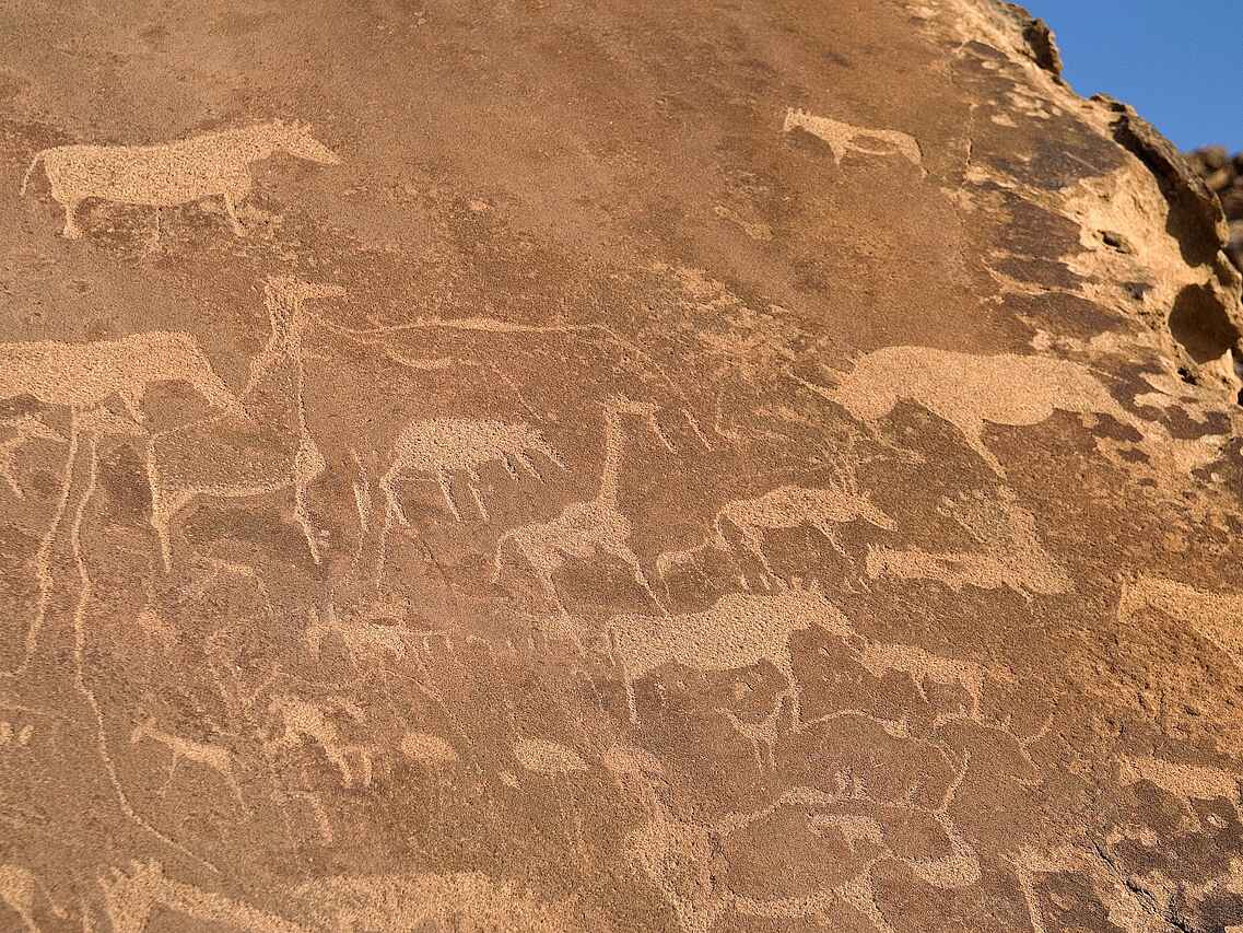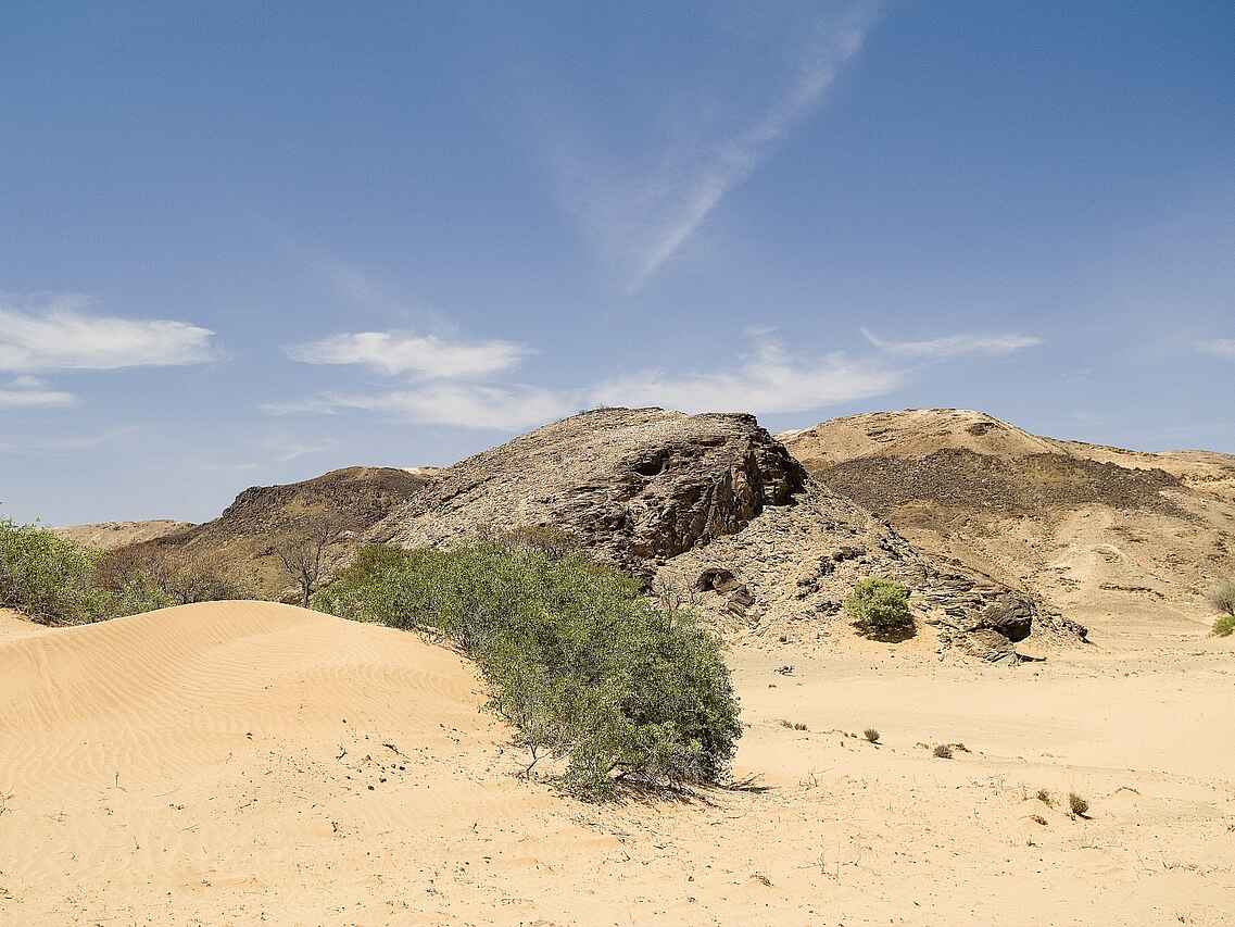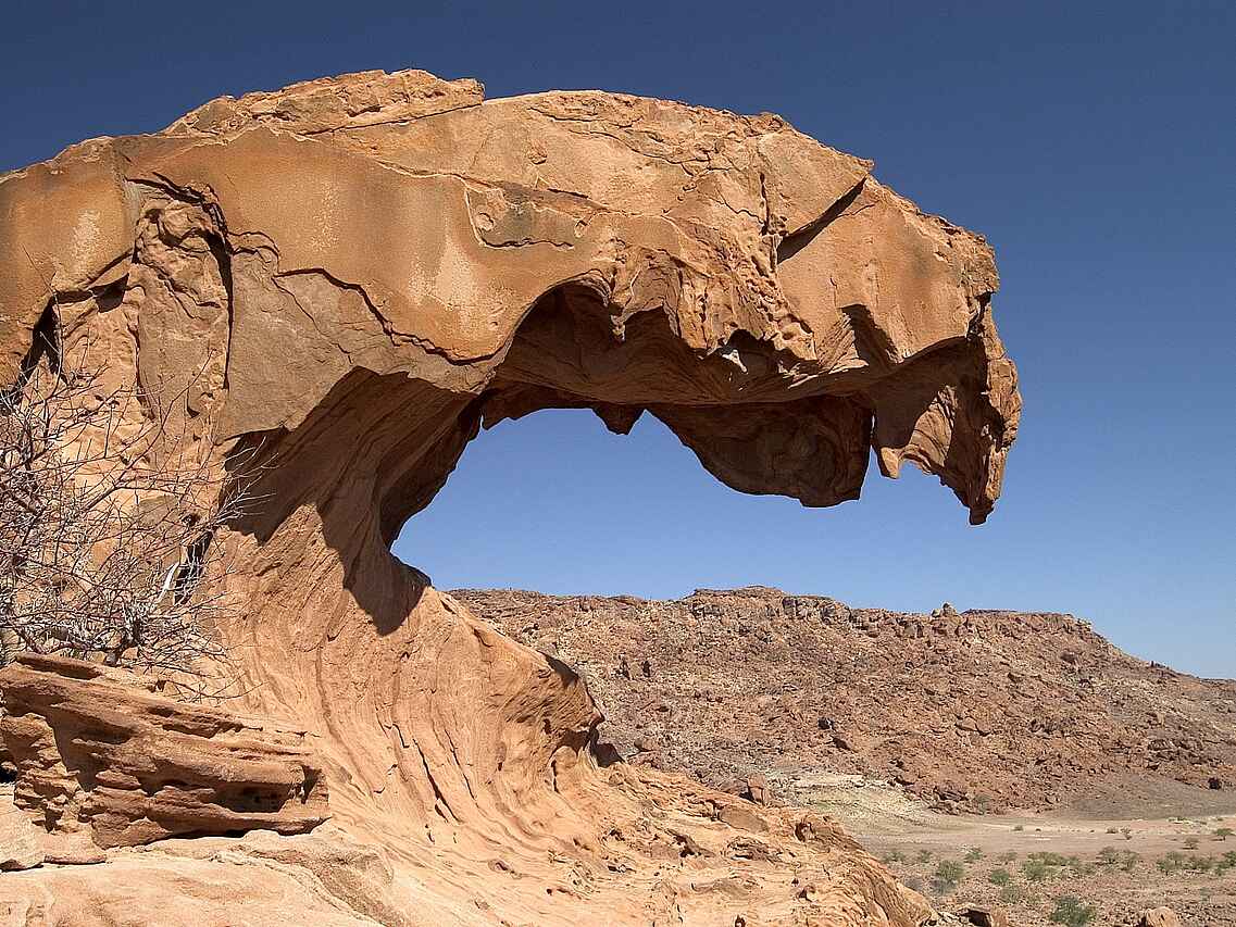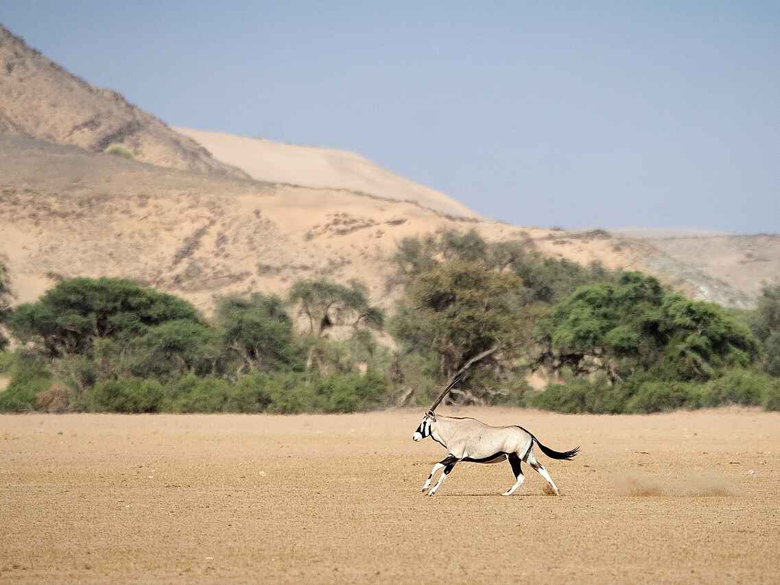 Das Doro Nawas Camp liegt in Namibia in der Region Damaraland, einer landschaftlich eindrucksvollen Gegend mit weiten Ebenen, trockenen Flussläufen und markanten Felsformationen. Die Lage nahe des Aba Huab Trockenflusses ermöglicht Einblicke in einen Lebensraum wüstenangepasster Elefanten, Antilopen und weiterer Tierarten. Ergänzt werden die Tierbeobachtungen durch geologische Besonderheiten und kulturelle Aspekte der Region. Das Camp wurde in Zusammenarbeit mit der lokalen Bevölkerung aufgebaut, viele Mitarbeitende stammen aus dem Damaraland und sind mit Landschaft, Tierwelt und Kultur der Region bestens vertraut.