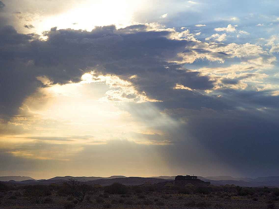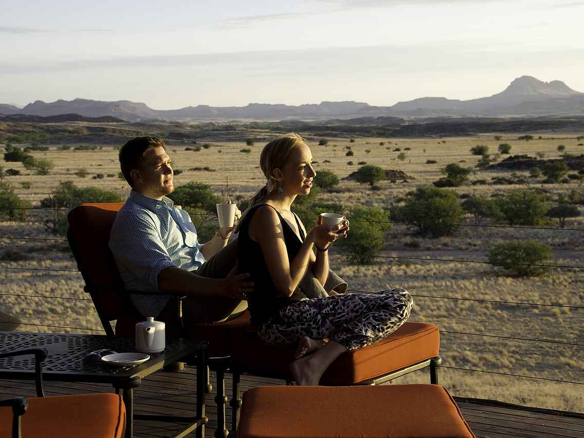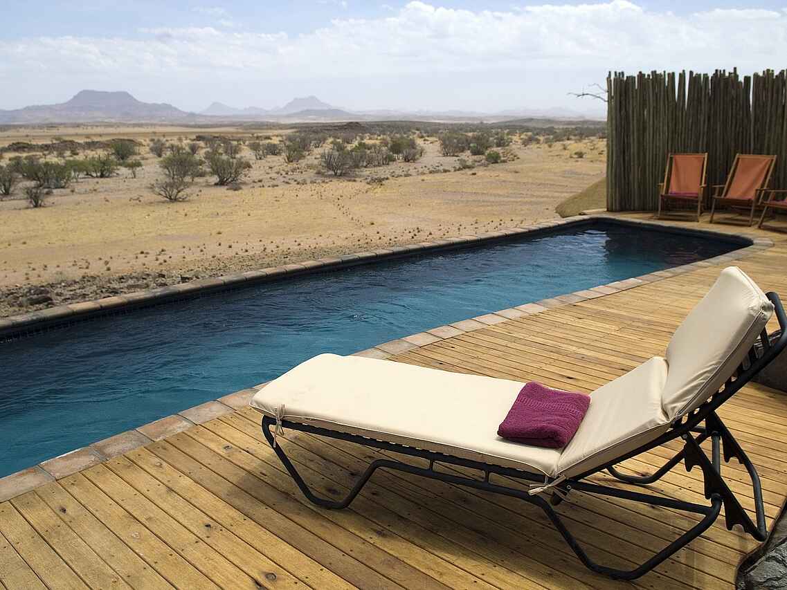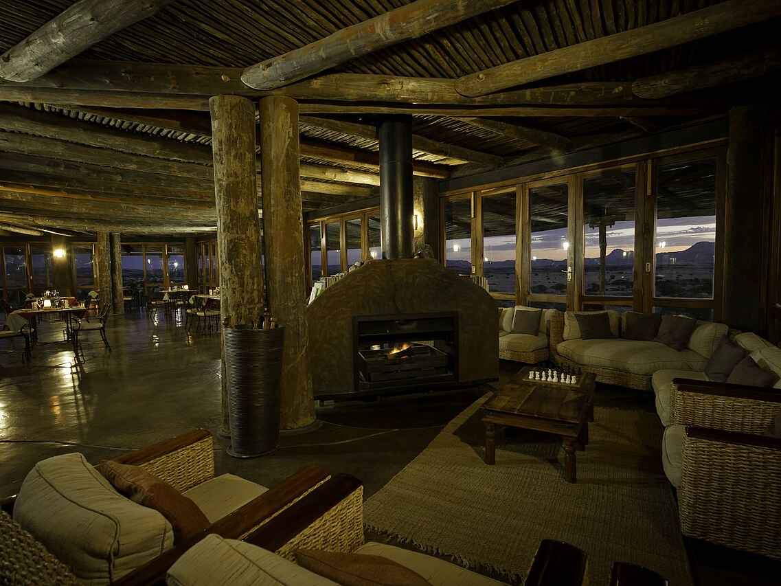 Der zentrale Bereich des Doro Nawas Camp ist offen gestaltet und bildet den lebendigen Mittelpunkt des Camps. Herzstück ist ein offener Innenhof mit Feuerstelle und Sitzkissen. Von hier führen Stufen zu einer offenen Terrasse mit weitem Blick über die umliegende Landschaft, ideal für den Tagesausklang und Beobachtungen des Sternenhimmels. Im Hauptgebäude befinden sich eine Bar, eine Lounge mit Kamin und bequemen Sitzmöbeln sowie ein großzügiger Essbereich. Ergänzt wird der Gemeinschaftsbereich durch einen kleinen Shop mit ausgewählten Souvenirs. Zwischen dem zentralen Bereich und den Gästeunterkünften liegt ein Swimmingpool mit Sonnenliegen, der an warmen Tagen für Erfrischung sorgt und zum Entspannen einlädt.