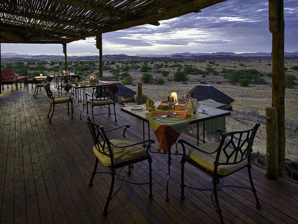 Die Küche im Doro Nawas Camp arbeitet mit frischen Zutaten und bietet eine abwechslungsreiche Auswahl an Gerichten. Gegessen wird je nach Tagesablauf im Essbereich oder auf der Terrasse. Alle Mahlzeiten sowie Getränke mit Ausnahme von Premium Alkoholika sind inklusive. Auf besondere Ernährungswünsche wird nach vorheriger Absprache Rücksicht genommen.