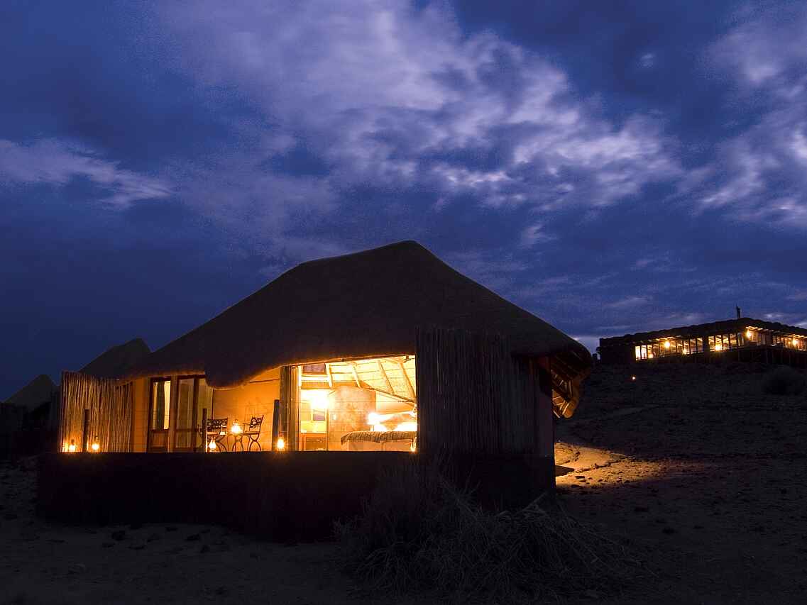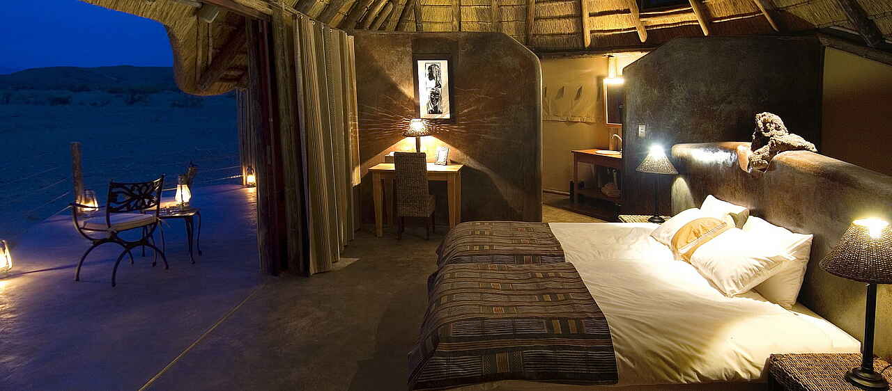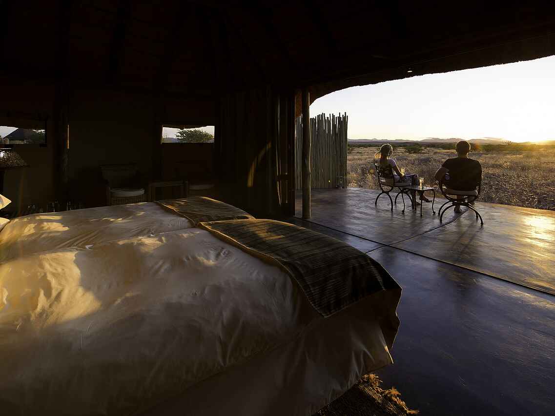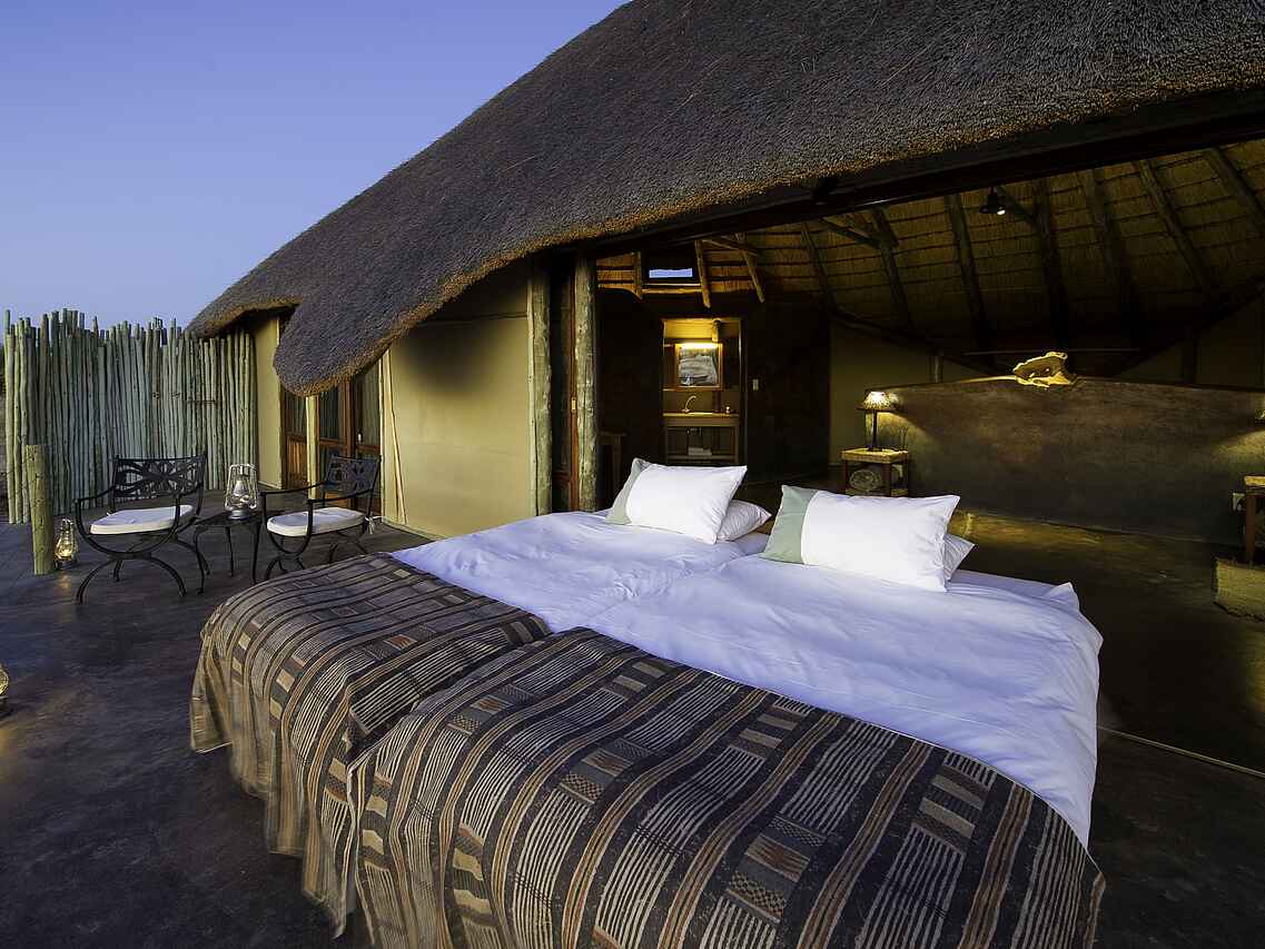 Die Gästeunterkünfte im Doro Nawas Camp bestehen aus insgesamt 16 Chalets aus Stein mit Reetdächern. Die offen gestalteten Einheiten sind großzügig geschnitten und setzen auf natürliche Materialien und klare Formen. Ein großes Doppelbett oder wahlweise zwei Einzelbetten, gepolsterte Korbsessel sowie ein Deckenventilator sorgen für angenehmen Komfort. Das trockene Klima trägt dazu bei, dass die Nächte auch ohne Moskitonetze ruhig und erholsam bleiben. Jedes Chalet verfügt über ein En-suite-Badezimmer mit Spültoilette, Doppelwaschbecken und Dusche. Ergänzt wird der Badbereich durch eine weitere Dusche auf der Veranda. Diese erweitert den Wohnraum nach außen und lädt sowohl zum Verweilen als auch dazu ein, die Betten nach draußen zu rollen und unter freiem Himmel zu übernachten.