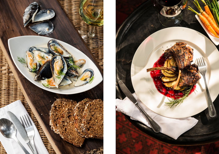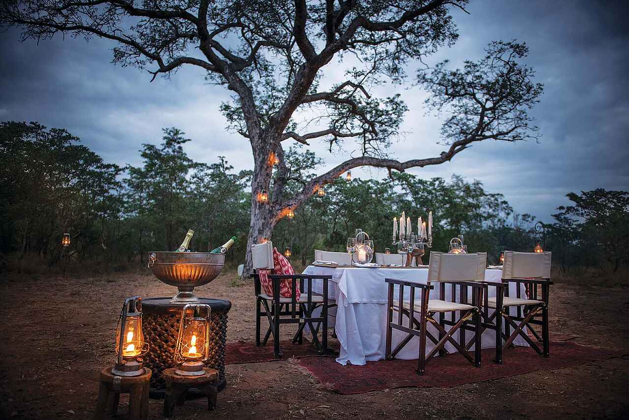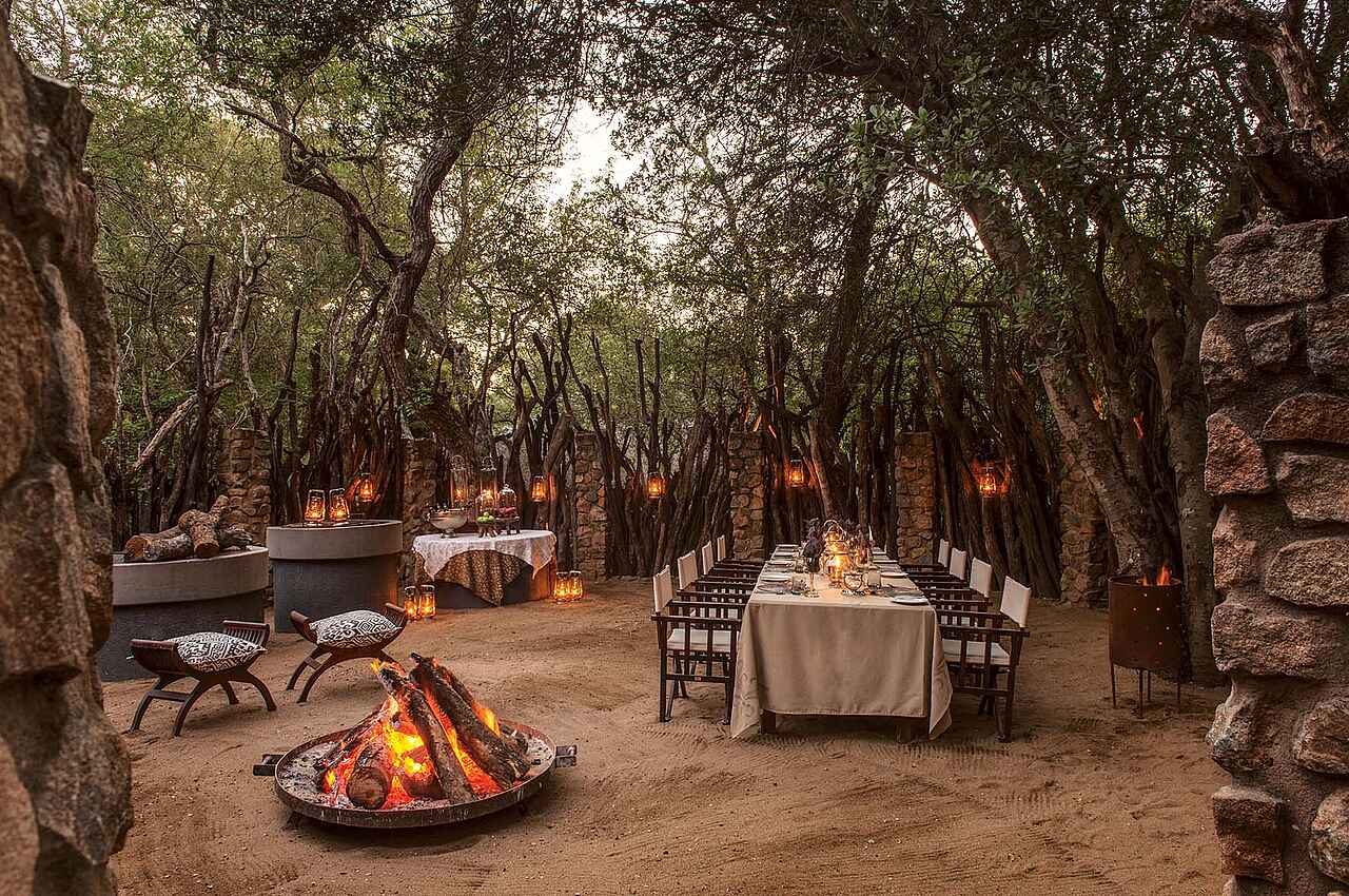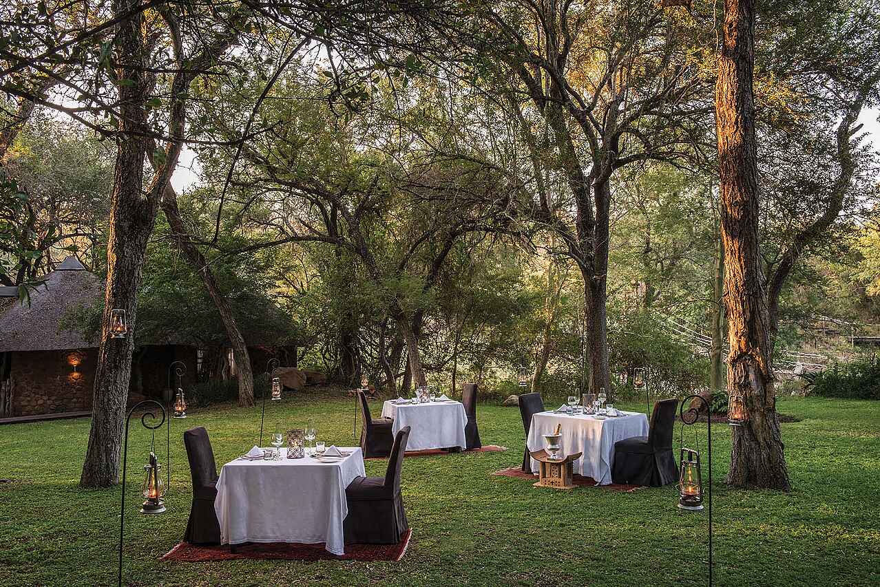 Vollpension: Frühstück, Lunch, High Tea und Dinner sind im Preis inbegriffen, ebenso wie die folgenden Getränke: Hausweine, lokale Alkoholika, Bier, Soft Drinks, Wasser, Tee und Kaffee. Entweder werden die Mahlzeiten an individuellen Einzeltischen im Speisebereich oder im Freien sowie an einer langen Tafel an der Feuerstelle serviert. Darüber hinaus können Mahlzeiten im Busch oder der privaten Veranda arrangiert werden.