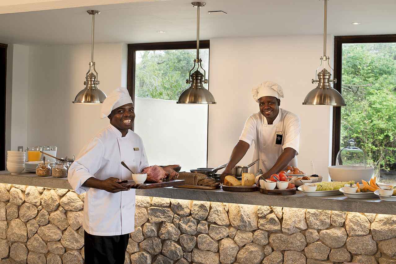 Vollpension: Frühstück, Lunch, High Tea und Dinner. Mahlzeiten und Getränke wie Hausweine, lokale Alkoholika, Bier, Soft Drinks, Wasser, Tee und Kaffee sind im Preis inkludiert. Die Mahlzeiten werden entweder an Einzeltischen im Speisebereich oder unter freiem Himmel oder auch an einer langen Tafel an der Feuerstelle serviert. Mahlzeiten können ebenso im Busch arrangiert werden.