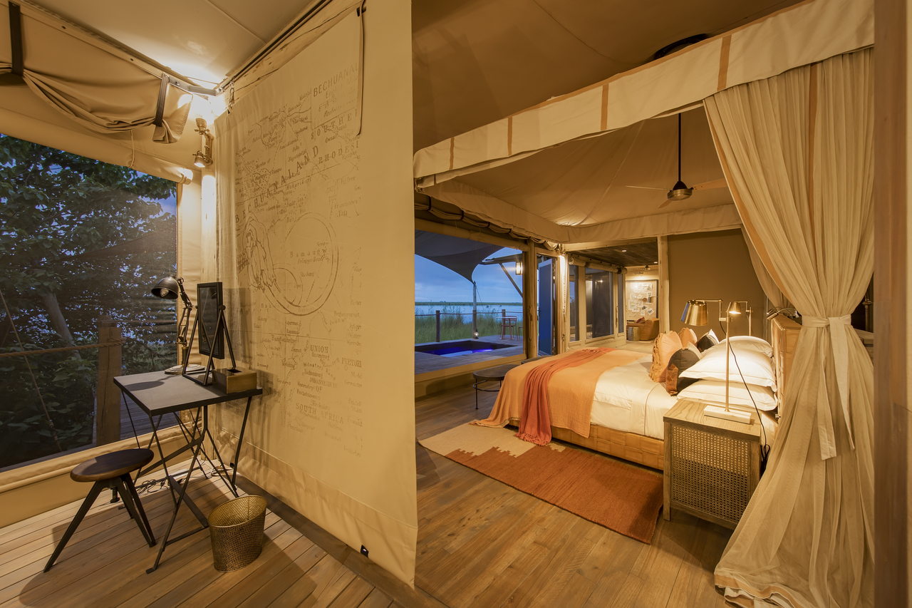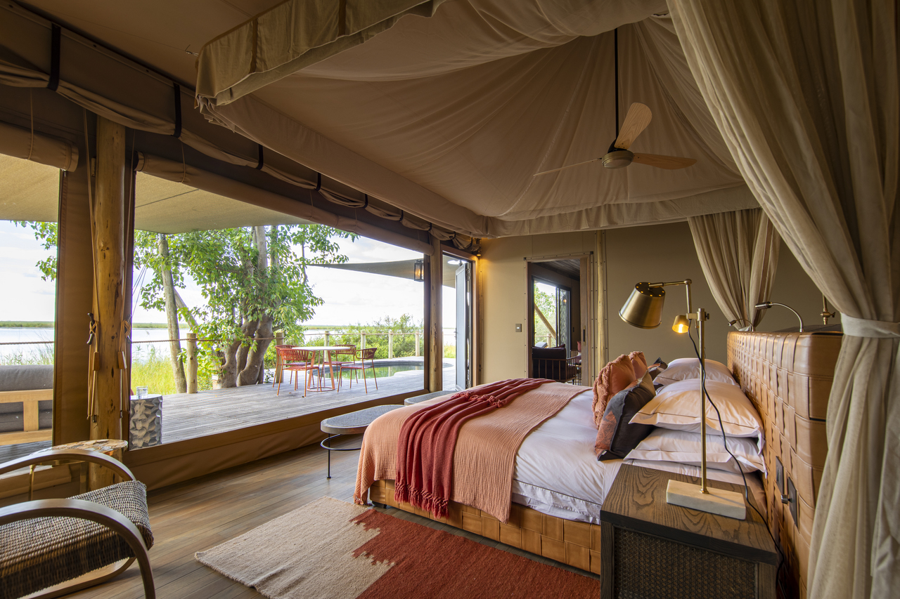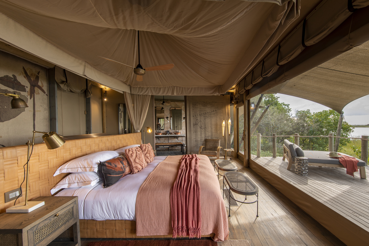Erhöhte Holzstege führen durch den Busch zu den acht Zeltsuiten des Camps, die sich auf beiden Seiten des Gemeinschaftsbereiches entlang des Flusses erstrecken. Die Zeltsuiten sind sehr geräumig, wobei eine Wand mit Fliegenschutzgittern versehen ist und so eine offene und luftige Atmosphäre schafft. Die Innenräume sind mit handgefertigten Mosaikfliesen, Akazienholz und lokalen Textilien gestaltet und spiegeln das Herz des Linyanti wider. Das King Size-bzw. Twin Size Bett befindet sich in der Mitte des Raumes und ist von wehenden Vorhängen umgeben. Ein Deckenventilator sorgt für eine angenehme Luftzirkulation. Wlan ist vorhanden.