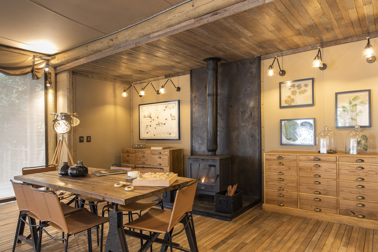 Erhöhte Holzstege führen durch den Busch zu den acht großzügigen Zeltsuiten, die beidseitig des Gemeinschaftsbereichs entlang des Flusses liegen. Fliegengitter an einer Wand sorgen für eine offene, luftige Atmosphäre. Im Inneren prägen handgefertigte Mosaikfliesen, Akazienholz und lokale Textilien das Erscheinungsbild. Das zentral platzierte Kingsize oder Twinsize Bett ist von leichten Vorhängen umgeben, ein Deckenventilator unterstützt die Luftzirkulation. WLAN steht zur Verfügung.