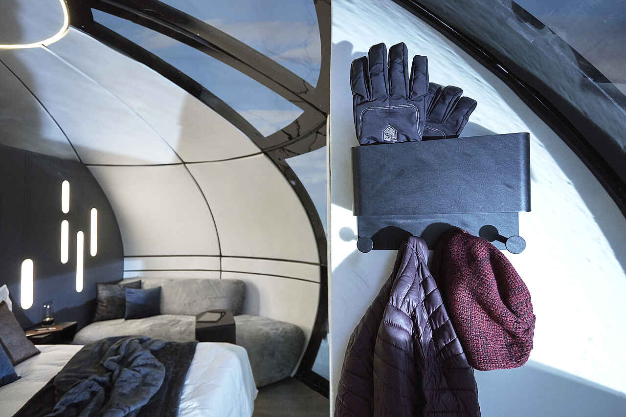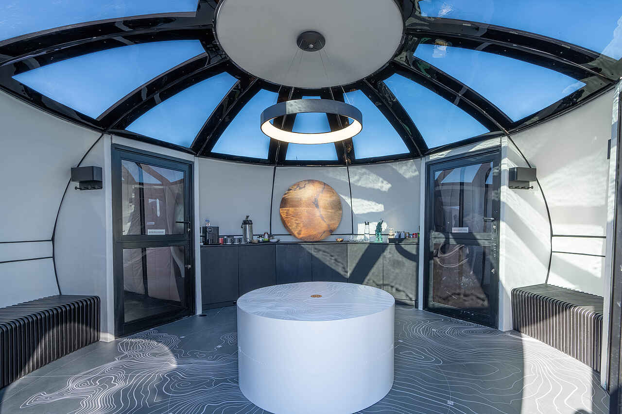 Die sechs beheizten Schlafkapseln des Echo Camps sind futuristische Unterkünfte aus Verbundglasfaser, die durch bodentiefe Fenster einen atemberaubenden Blick auf die mondähnliche Landschaft bieten. Mit einem Durchmesser von über fünf Metern sind die Kapseln geräumig und verfügen über einen einladenden Lounge-Bereich. Die bequemen Betten können entweder als Doppelbett oder als zwei Einzelbetten angeordnet werden. Die Inneneinrichtung der Kapseln spiegelt ein elegantes und minimalistisches Design wider.