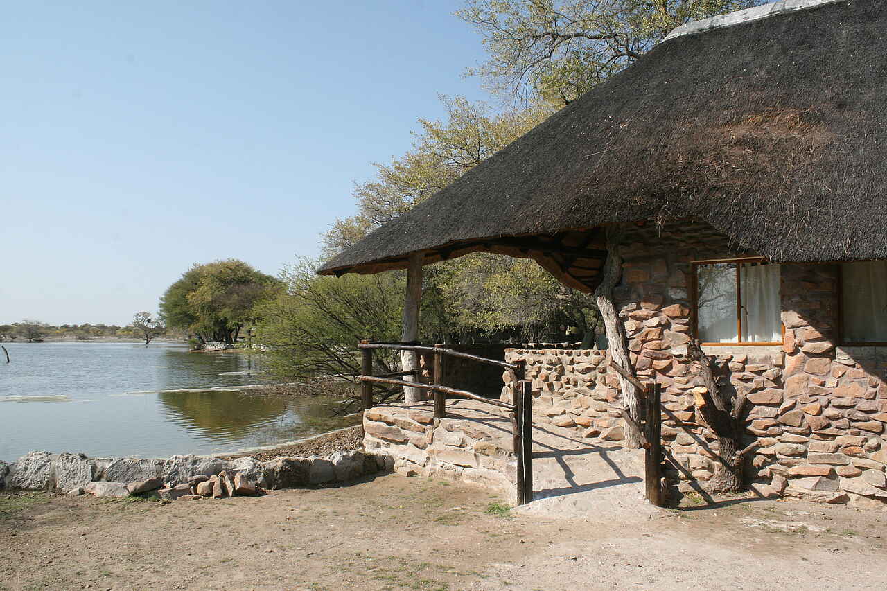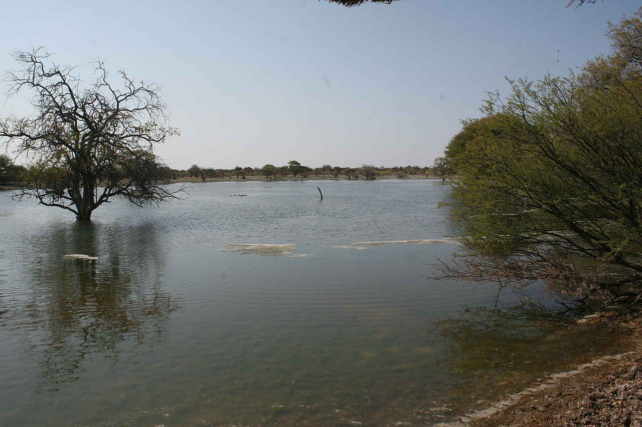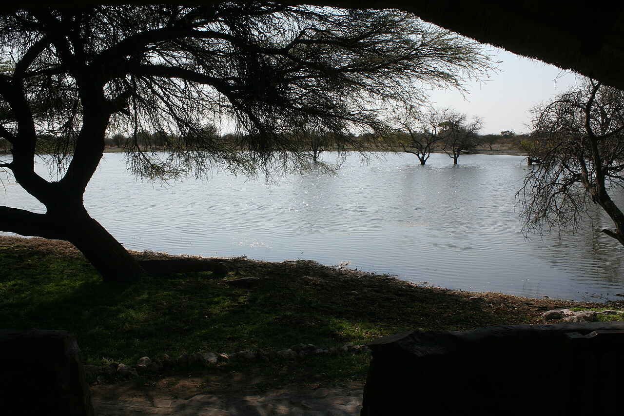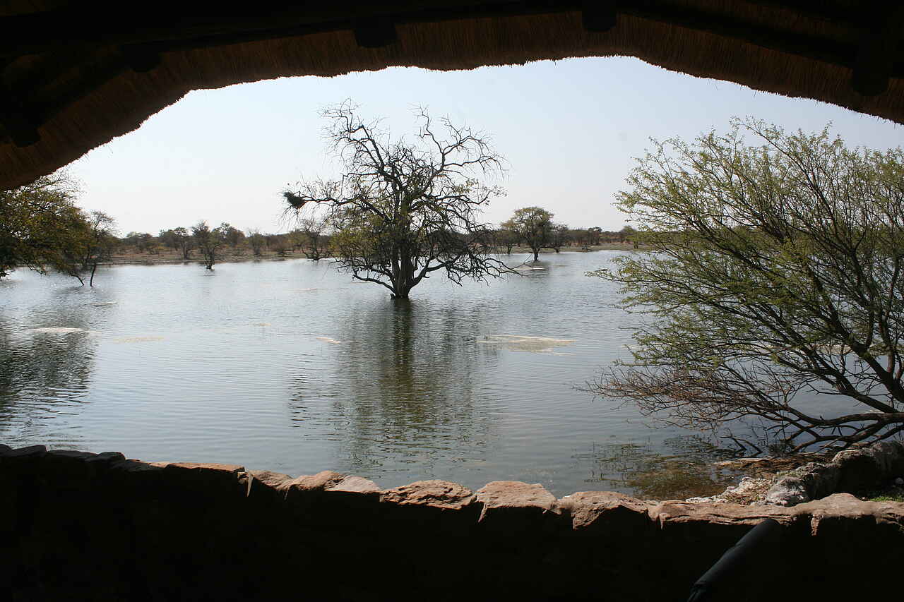 Edo’s Camp bietet nachhaltige Safaris in klassischer Kalahari-Landschaft, inkl. Nashorn-Tracking und kulturellen Begegnungen mit den San. Ein Highlight ist das Wasserloch im Camp.