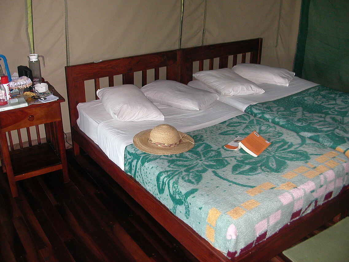 6 große Meru-Zelte auf erhöhten Holzplattformen zur Verfügung, jedes mit 2 Betten, dazwischen ein Nachttisch, eines davon ist ein Familienzelt mit 4 Betten. Jedes Zelt mit Bad en suite (fließend Heiß- und Kaltwasser, Dusche, Badewanne, Wasserklosett, Spiegel, Waschutensilien, Handtücher) und privater Veranda. Solarstrom, 24 Stunden/Tag Licht, Batterieladestation, Moskitonetze, Ankleide, Schrank, Taschenlampe, Insektenspray, Tee- und Kaffeebereiter, Standventilator. Wäscheservice inkl.