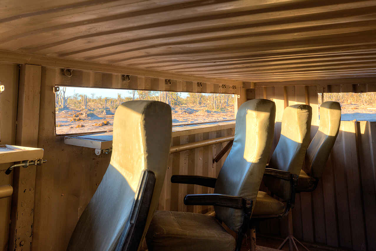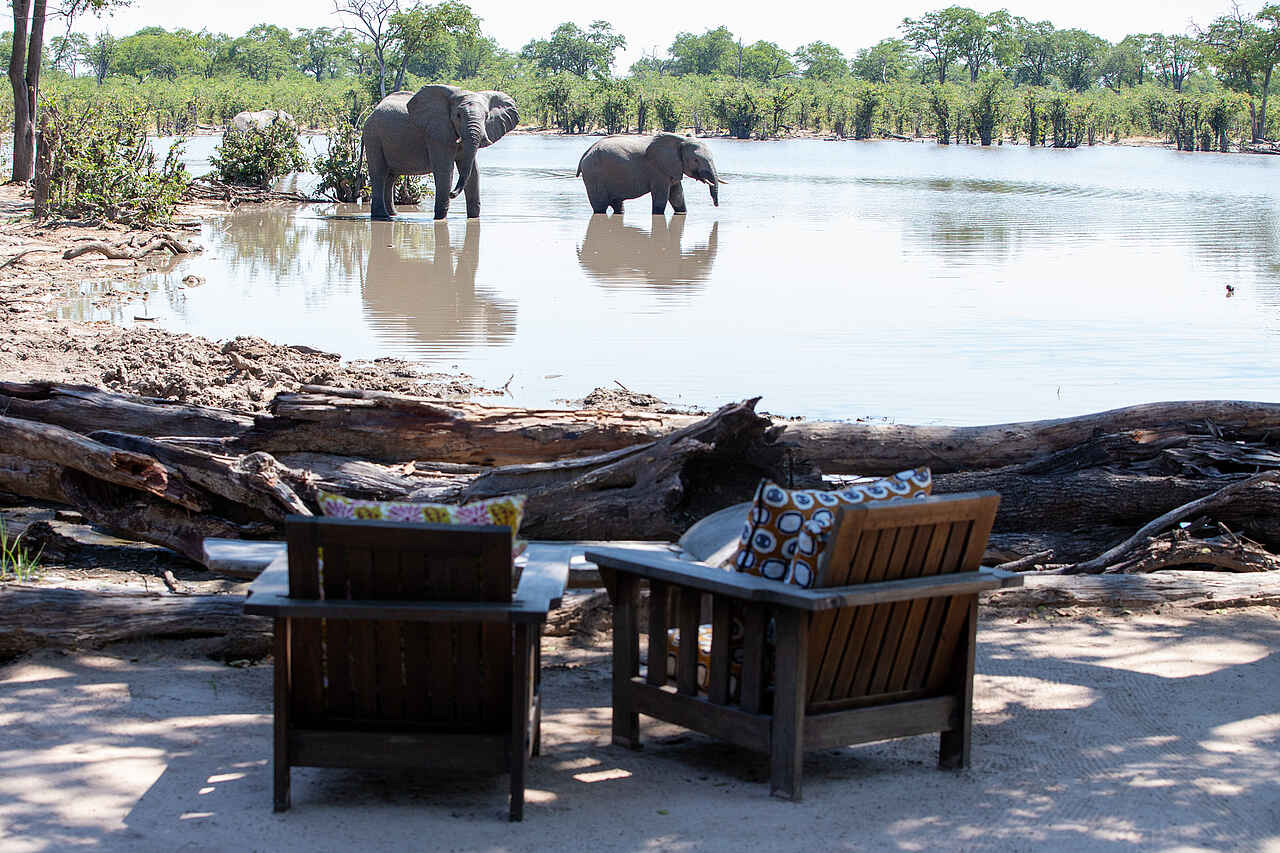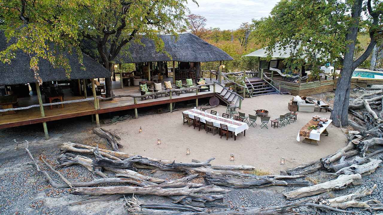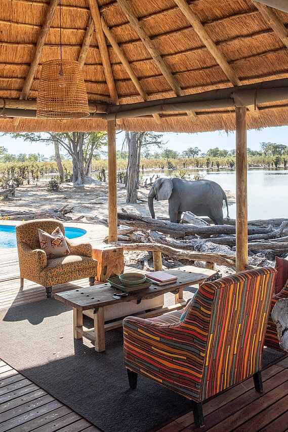 Der zentrale Bereich des Elephant Pan Camps lädt mit einem großzügigen Speisedeck und gemütlichen Lounge-Bereichen zum Verweilen ein - stets mit freiem Blick auf das belebte Wasserloch. Ein Pool auf einer erhöhten Plattform bietet nach den Safari-Aktivitäten eine willkommene Erfrischung. Abends trifft man sich in der offenen Boma am Lagerfeuer, um den Tag ausklingen zu lassen und den Geräuschen der afrikanischen Wildnis zu lauschen. Ein besonderes Highlight ist das Untergrund-Versteck direkt an der Wasserstelle, das ungestörte Tierbeobachtungen aus nächster Nähe und erstklassige Fotomöglichkeiten bietet. Zudem stehen den Gästen kostenfreies WLAN und ein Wäscheservice zur Verfügung.