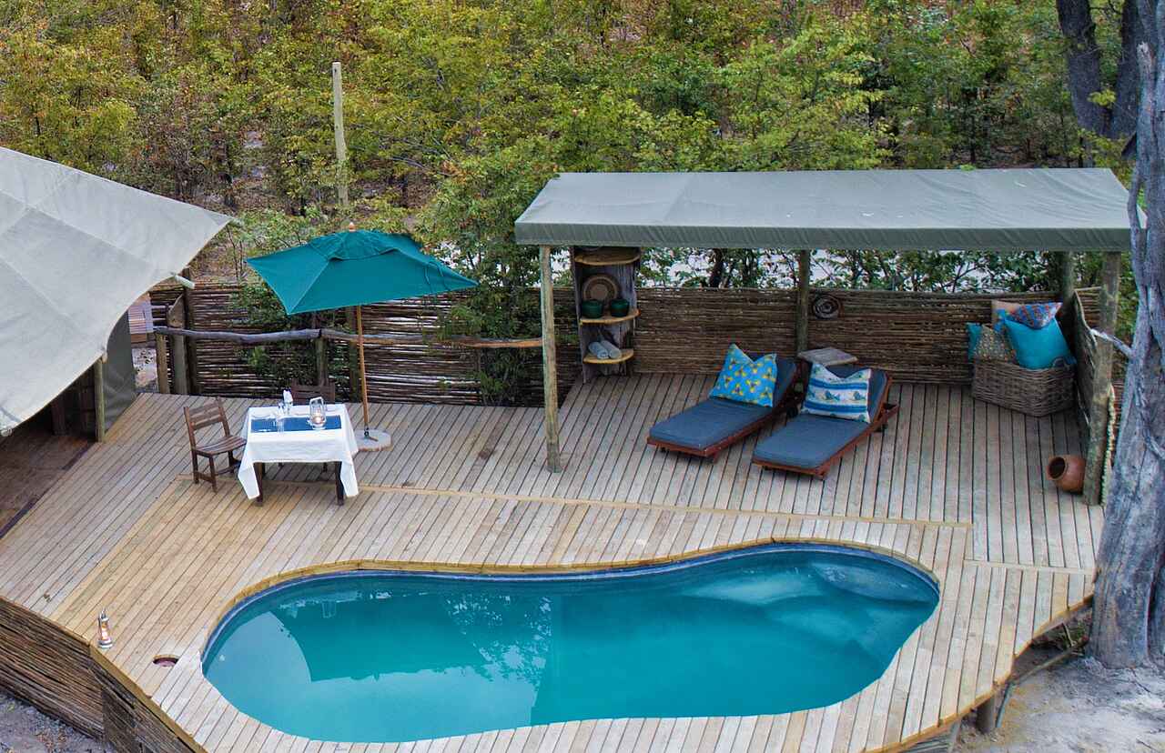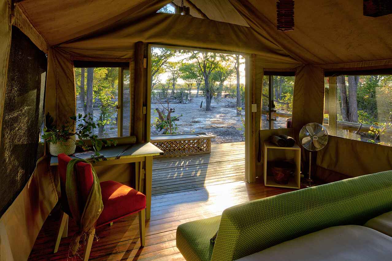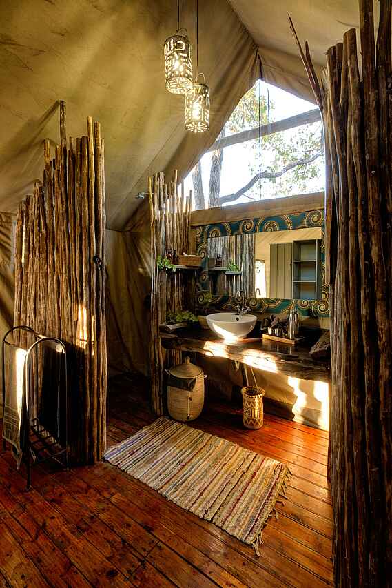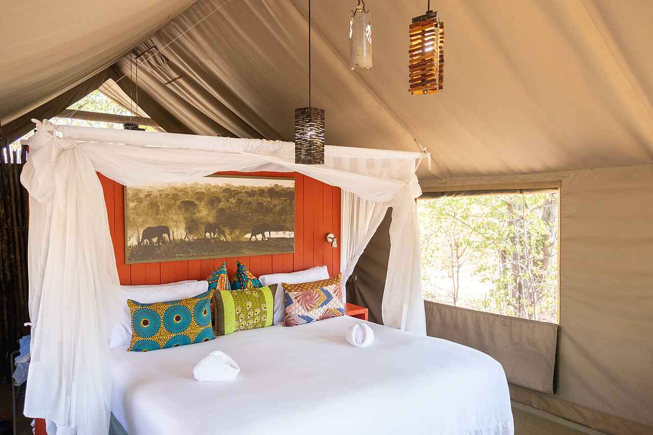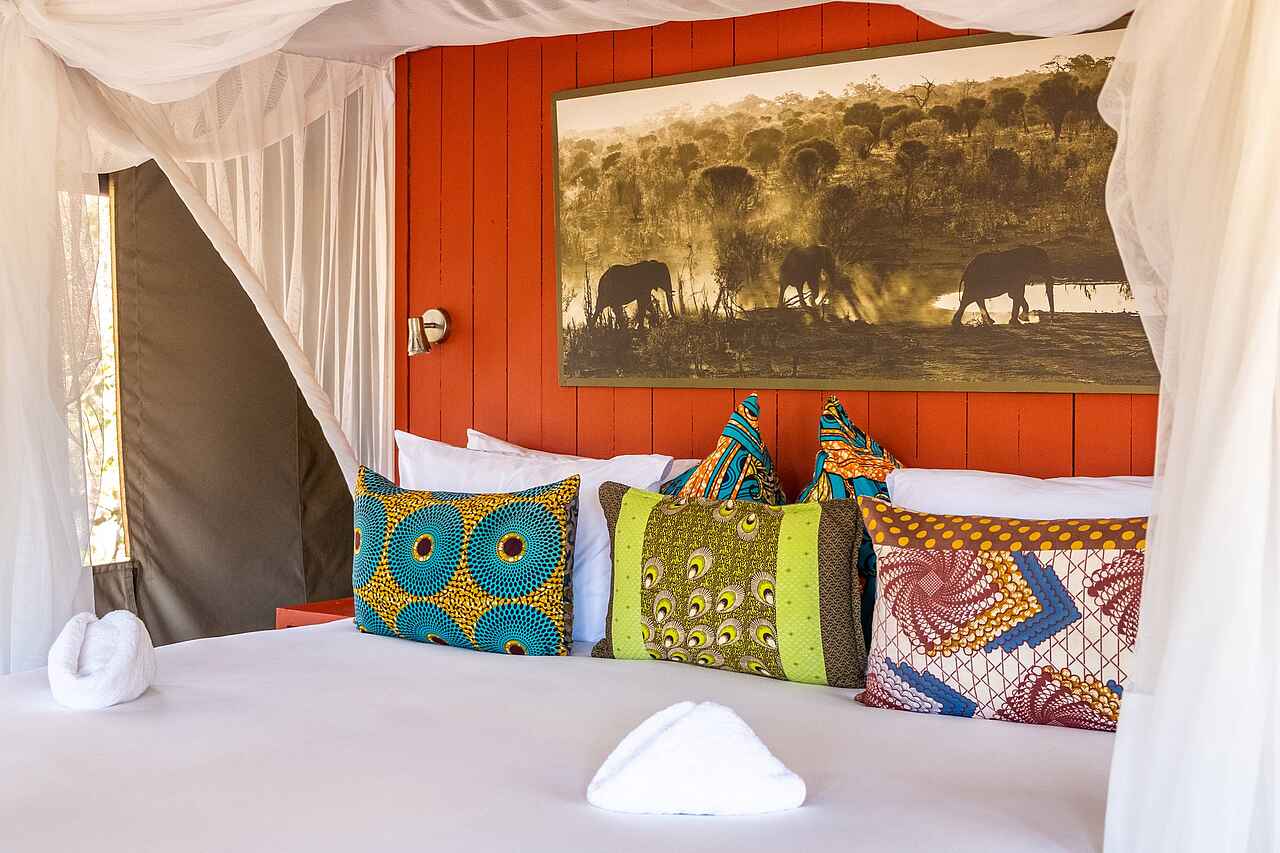 Die acht Zelte des Elephant Pan Camps fügen sich nahtlos in die Natur ein und bieten einen ungestörten Blick auf das belebte Wasserloch. Schlicht und zugleich ansprechend gestaltet, verfügen sie über Einzelbetten, die bei Bedarf zu einem Doppelbett umgewandelt werden können, sowie Moskitonetze für erholsamen Schlaf. Ein elektronischer Safe und durchdachte Stauraumlösungen bieten zusätzlichen Komfort. Das En-suite-Badezimmer ist mit Dusche, Waschbecken und Toilette ausgestattet, während ein Gasdurchlauferhitzer jederzeit für warmes Wasser sorgt - ideal nach einem erlebnisreichen Safaritag.