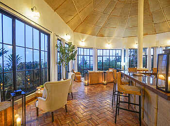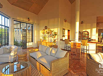 Das Hauptgebäude der Elephant Plains Lodge ist offen und luftig gestaltet, mit bodentiefen Fenstern und einem weiten Blick auf die Savannenlandschaft. Lounge, Bar und Restaurant gehen fließend ineinander über und bieten bequeme Sitzgelegenheiten im Innen- und Außenbereich. Die Einrichtung kombiniert natürliche Materialien mit afrikanischen Elementen. Ein Pool mit Sonnenterrasse bietet Erfrischung an warmen Tagen, während die erhöhte Lage für eine stetige Brise sorgt. Abends lädt eine Feuerstelle zum Austausch unter freiem Himmel ein. WLAN steht in der gesamten Lodge zur Verfügung.