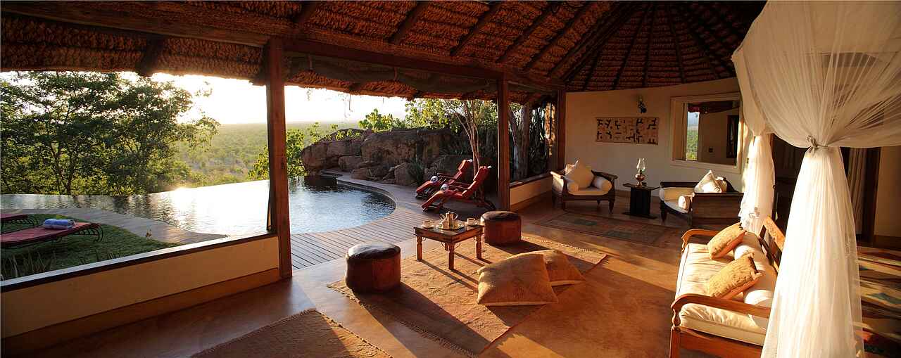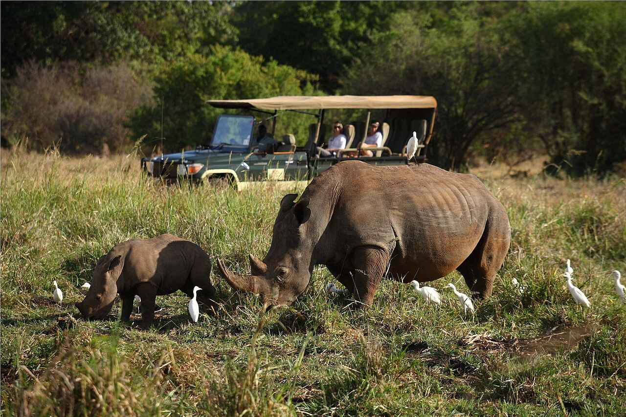 Nashörner in ihrer natürlichen Umgebung, einer der schönsten afrikanischen Nationalparks, eine der elegantesten Lodges Afrikas