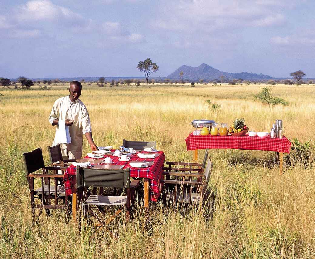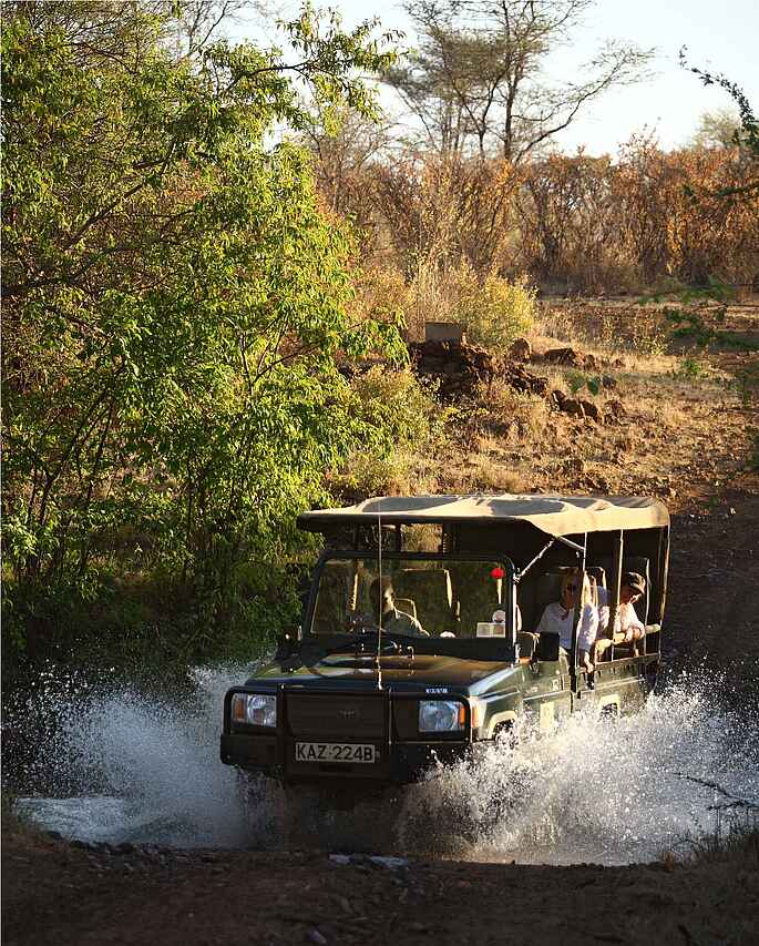 Von Nairobi aus Flug zum Mughwango oder Kinna Airstrip. Fahrt von Mughwango: ca. 5 Min., von Kinna: ca. 45 Min.