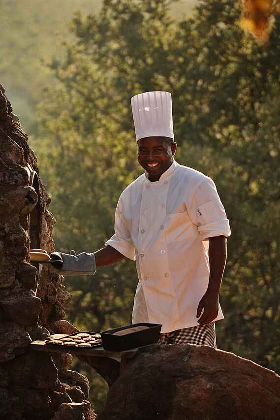 Italy meets Africa, gespeist wird am persönlichen Tisch, meist draußen bei Kerzenschein. Frühstück: 6.30 - 9.30 Uhr, Lunch: 13.00 - 14.30 Uhr, Tea Time am Nachmittag, Dinner: 20.00 - 21.30 Uhr. Am frühen Abend Häppchen an der Bar.