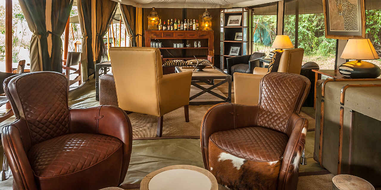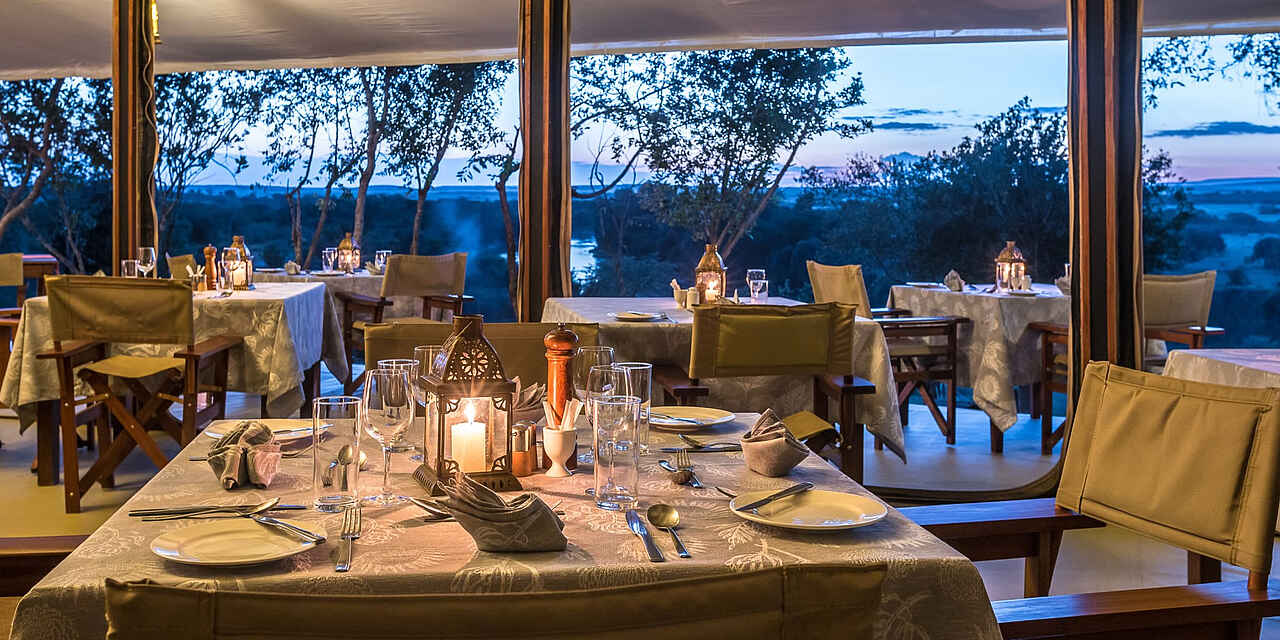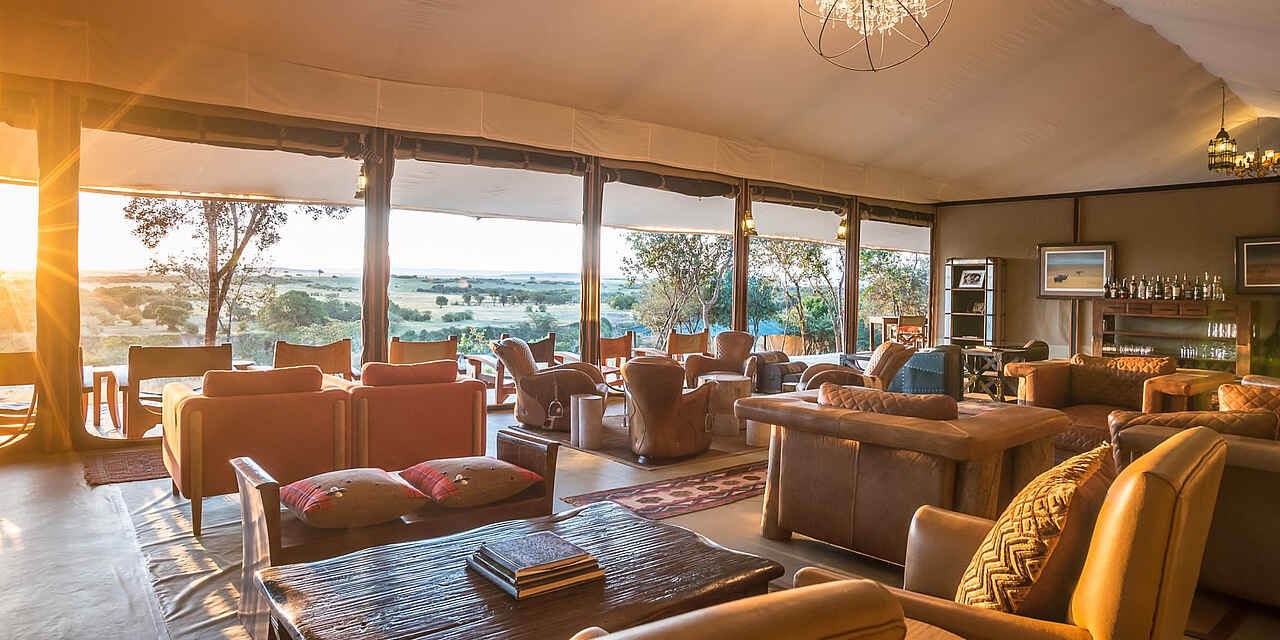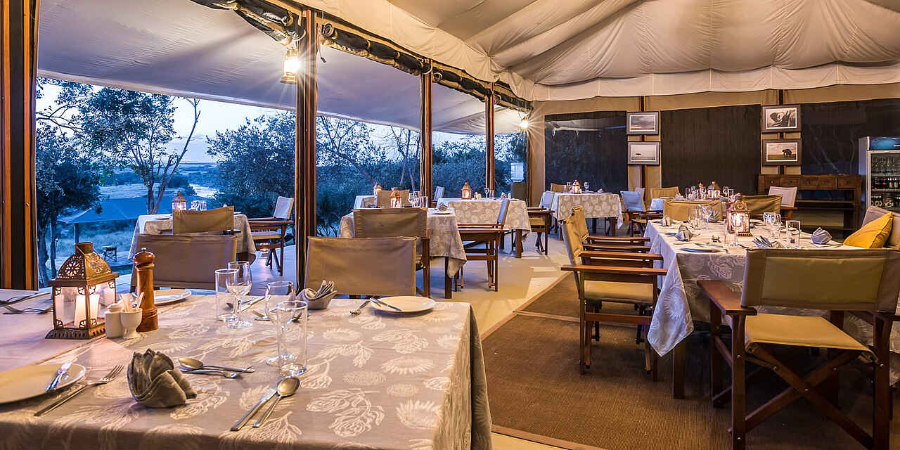 Entim Main Camp: elegantes Hauptzelt leicht erhöht auf einer Holzterrasse mit einem weiten braunen Kanvas-Dach überzogen. Im Inneren schaffen helle Stoffe an der Decke und entlang der Seitenwände, die alle geöffnet werden können, eine gemütliche Atmosphäre mit edlen, originellen Ledersofas und -sesseln und handgemachten Dekorationselementen. Im Hauptzelt befinden sich das Restaurant, die Lounge und die Bar, davor liegen überdachte Terrassen mit bequemen Safari-Möbeln, die einen direkten Blick über den Mara Fluss offenbaren. Entim Private Wing: Sehr schickes, großzügiges Hauptzelt auf einer hohen Holzterrasse mit Restaurant, Bar, Lounge und dem Fotostudio; den Mittelpunkt bildet eine Holzterrasse mit einer imposanten Feuerstelle mit Sitzgelegenheiten. Die Einrichtung ist modern in weiß und orange gehalten, locker wechseln sich Couches, Sessel und Safari-Möbel in der Lounge und auf den langgezogenenTerrassen ab, von allen genießt der Gast einen herrlichen Blick über die Savanne und die sanften Hügel der Masai Mara. Kostenloses Wifi, Steckdosen in den Hauptbereichen. SPA mit ausgebildeten Therapeuten. Privates Fotostudio im Private Wing mit iMacs (Softwares: Photoshop, Lightroom), LCD Projektoren, die von professionellen Guides für die speziellen Fotogruppen und -kurse genutzt werden.