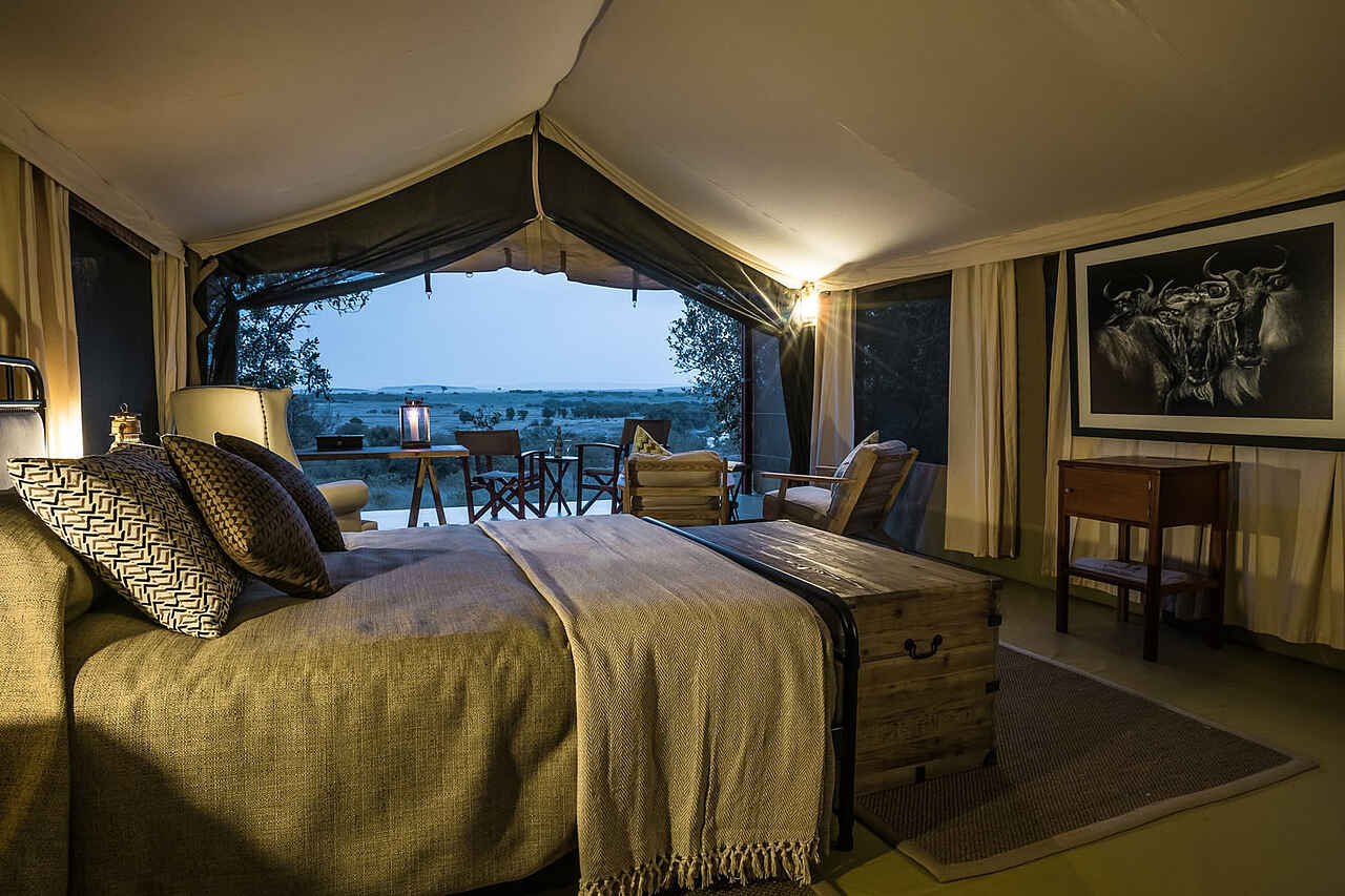 Entim Main Camp: alle Zelte sind mit dem Blick auf den Mara River gerichtet. Die braunen Kanvas-Zelte stehen leicht erhöht auf Holzterrassen, die mit Zeltplane bespannt und gewebten Teppichen belegt sind. Der Eintritt erfolgt über die private, möblierte Terrasse, im Eingangsbereich empfängt ein antiker Schreibtisch und eine gemütliche, hellbeige Sitzgruppe, daran schließt sich das Schlafzimmer mit einem großen Doppelbett, Kommode und Überseekoffer als Stauraum. Das Interieur wirkt dank der hellen Stoffe und der antiken Möbel schlicht und edel. Im Anschluss an das Schlafzimmer folgt das Badezimmer mit Waschtisch mit Messingbecken, Toilette und solarbeheizter Dusche. Hübsche Paraffinlampen und natürliche Materialien schaffen ein authentisches Safari-Feeling im Zelt. Entim Private Wing: die Kanvas-Zelte sind gleich groß und ebenso gut ausgestattet, wie die des Schwester-Camps, die Einrichtung ist jedoch eher altmodisch, mit bunten Stoffen und einfachen Safari-Möbeln. Die Zelte sind alle in Richtung der offenen Savanne gerichtet, der Mara River ist nur 100 entfernt.
