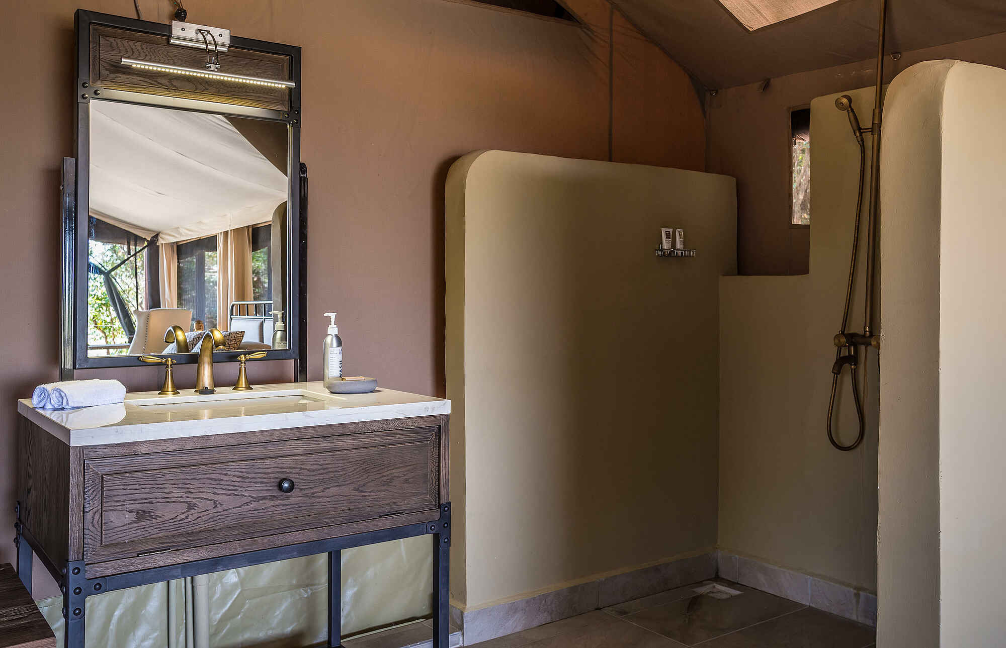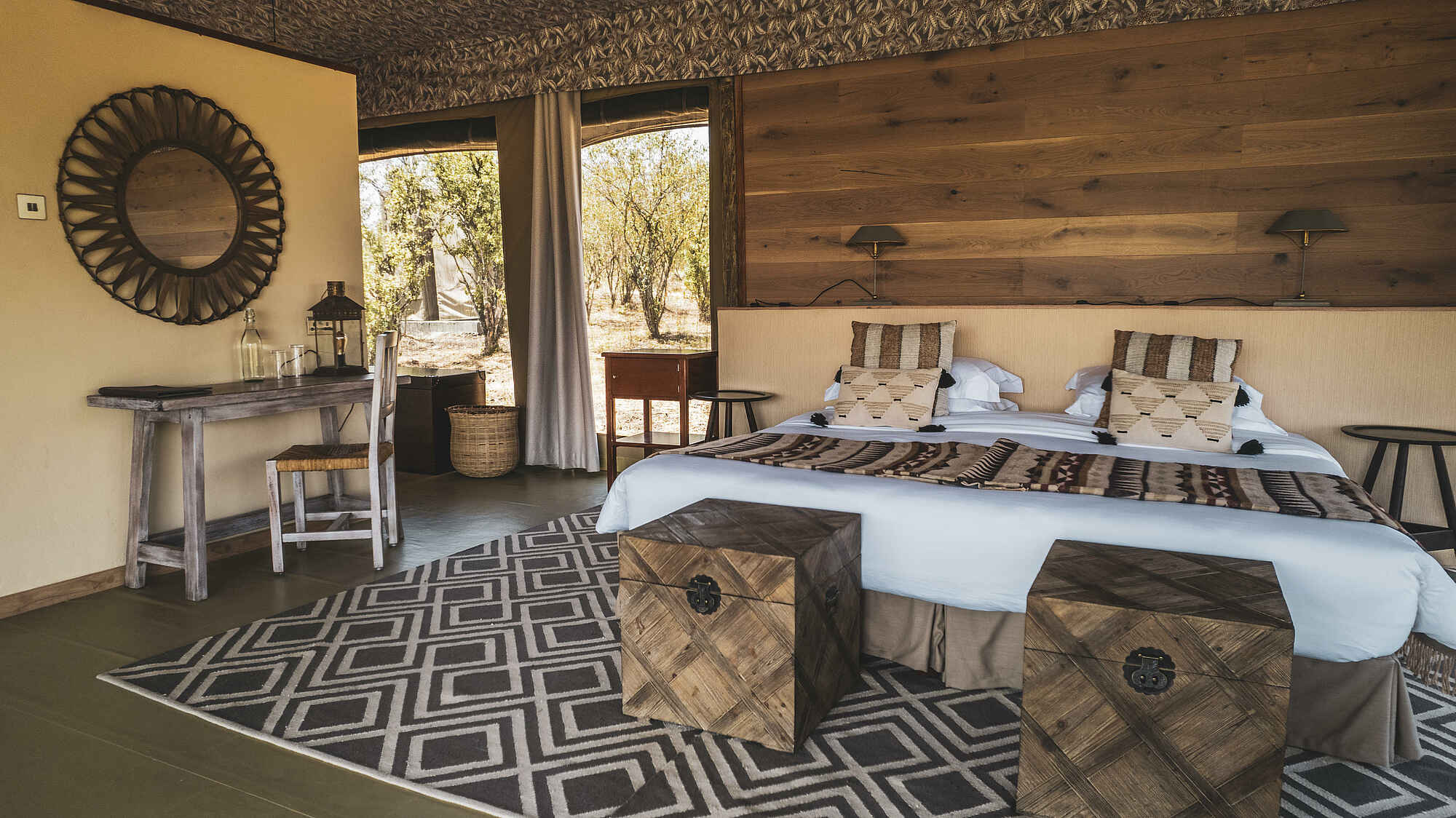Die acht Zeltsuiten des Entim Private Wing Camp stehen auf erhöhten Plattformen mit direktem Ausblick in die Wildnis. Im Inneren erwartet die Gäste ein großzügiger Wohn- und Schlafbereich mit gemütlichen Sitzmöbeln, hochwertiger Bettwäsche und ausreichend Stauraum. Eine Kaffee- und Teestation sowie eine Minibar sorgen für Komfort zu jeder Tageszeit. Jedes Zelt verfügt über ein eigenes En-Suite-Badezimmer mit fließendem Warmwasser, Doppelwaschbecken, Dusche, WC, Pflegeprodukten und frischen Handtüchern. Die Familiensuite bietet zwei großzügige Schlafzimmer, die durch eine gemeinsame Lounge miteinander verbunden sind.