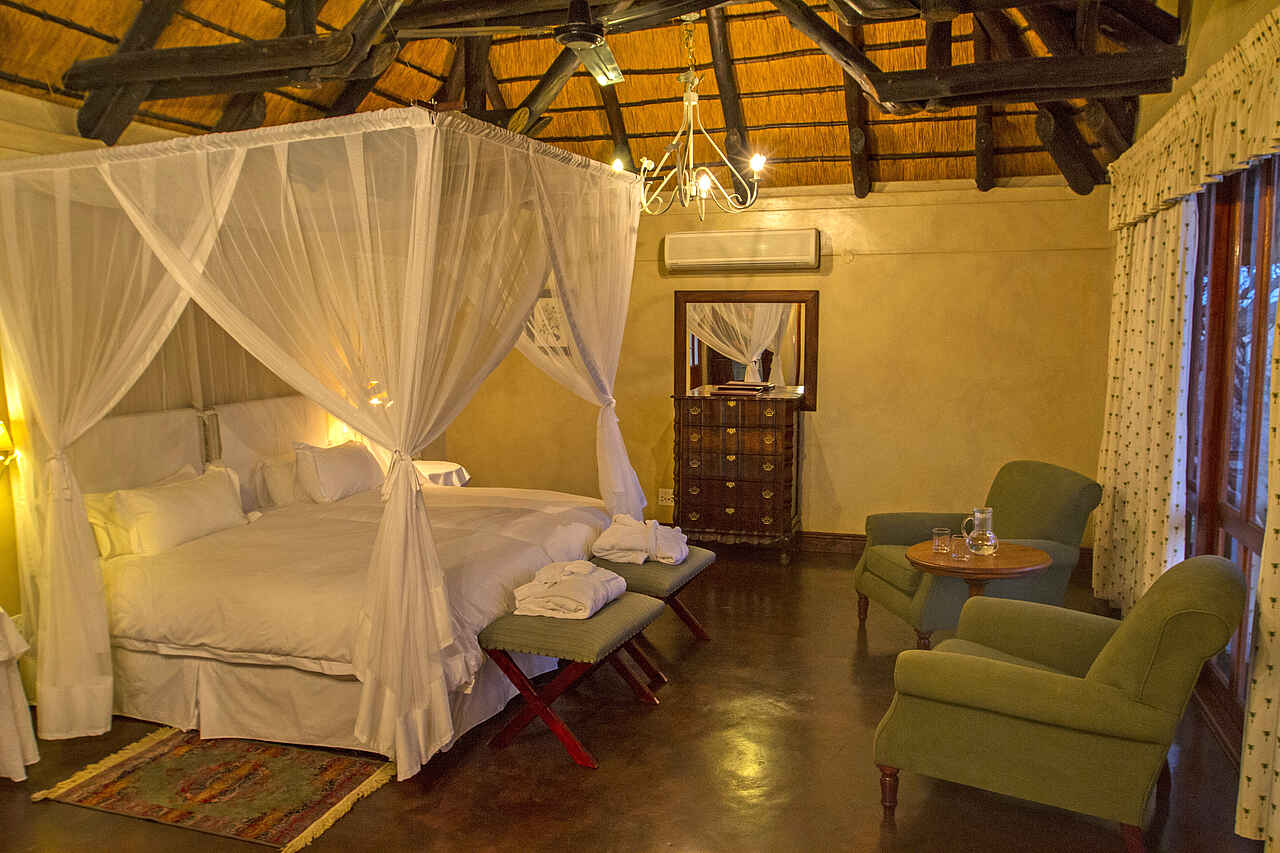 Die 18 komfortablen Chalets, die auf erhöhten Plattformen um das Haupthaus erbaut, besitzen ebenfalls große Glasfenster. Jedes Chalet ist mit je einem Doppelbett, zwei Nachtischen, einer Kommode mit Spiegel, Stühlen und zwei Sesseln, alles bestehend aus dunklem Holz, sowie einem Telefon, einer Minibar, einer Kaffee- und Teestation und Moskitonetzen ausgestattet. Auf dem dunklen Steinboden liegen Teppiche aus. Die Räume sind klimatisiert, daneben findet sich noch ein Ventilator. An jede Unterkunft ist eine private Terrasse mit zwei Sitzgelegenheiten und einem Beistelltisch angeschlossen. Außerdem sind die privaten en-suite Bäder von dem Schlafbereich abgetrennt und warten mit Spültoilette, einem Waschtisch mit zwei Waschbecken, einer Badewanne, einer Indoor- und einer Outdoordusche sowie fließendem heißen und kalten Wasser auf. Neben den Chalets gibt es auch noch die private Royal Impala Villa, die drei Zimmer, Küche, Wohnbereich, zwei private Terrassen und Gärten sowie einen eigenen Pool umfasst.