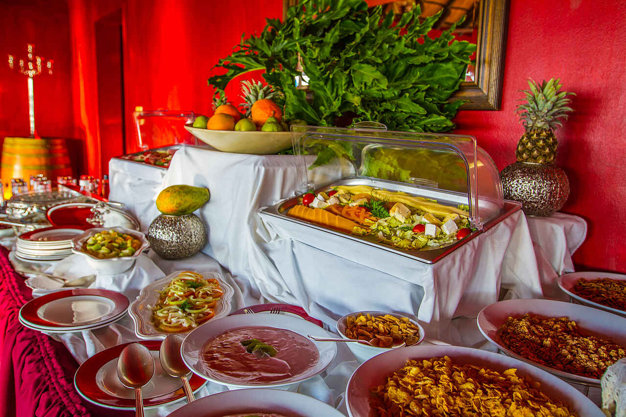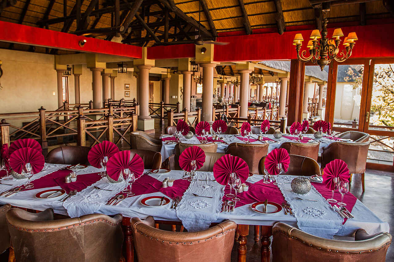 Halbpension: Frühstück und Dinner. Das Frühstück reicht von Continental bis English Breakfast. Mittagessen und Dinner können à la Carte gewählt werden. Alle Mahlzeiten werden im Restaurant serviert. Diätwünsche können nach Absprache berücksichtigt werden. Frühstück und Abendessen können mit extra Buchung im Busch eingenommen werden.