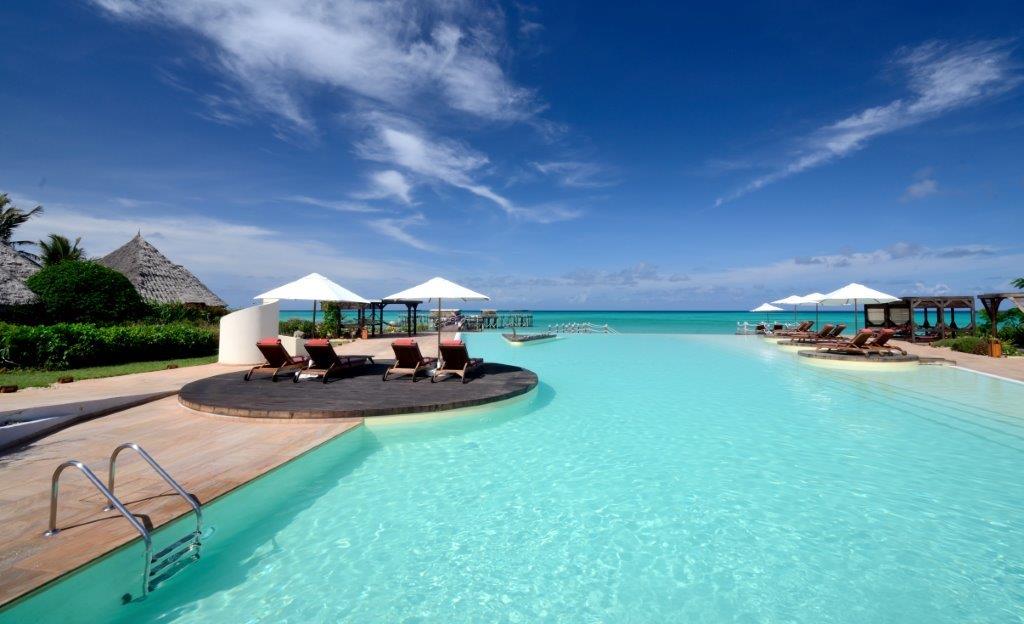 Strandparadies direkt am Indischen Ozean, feiner Sandstrand mit kristallklaren Wasser, lange Pier, große Poollandschaft, 2.000 Quadratmeter Wellness- und Fitnessbereich, 450 Quadratmeter große Kunstgalerie, Tauchen, Schnorcheln, Segeln, Touren ins Landesinnere, Essque Zalu im Paket buchbar mit vorherigem Aufenthalt in der The Retreat Selous Safari Lodge in Tansania, Hochzeiten und Honeymoon.