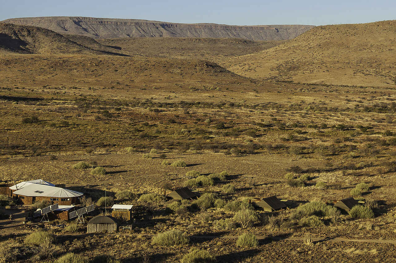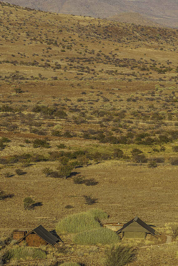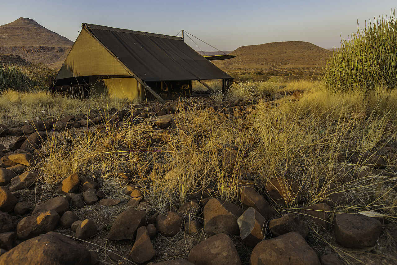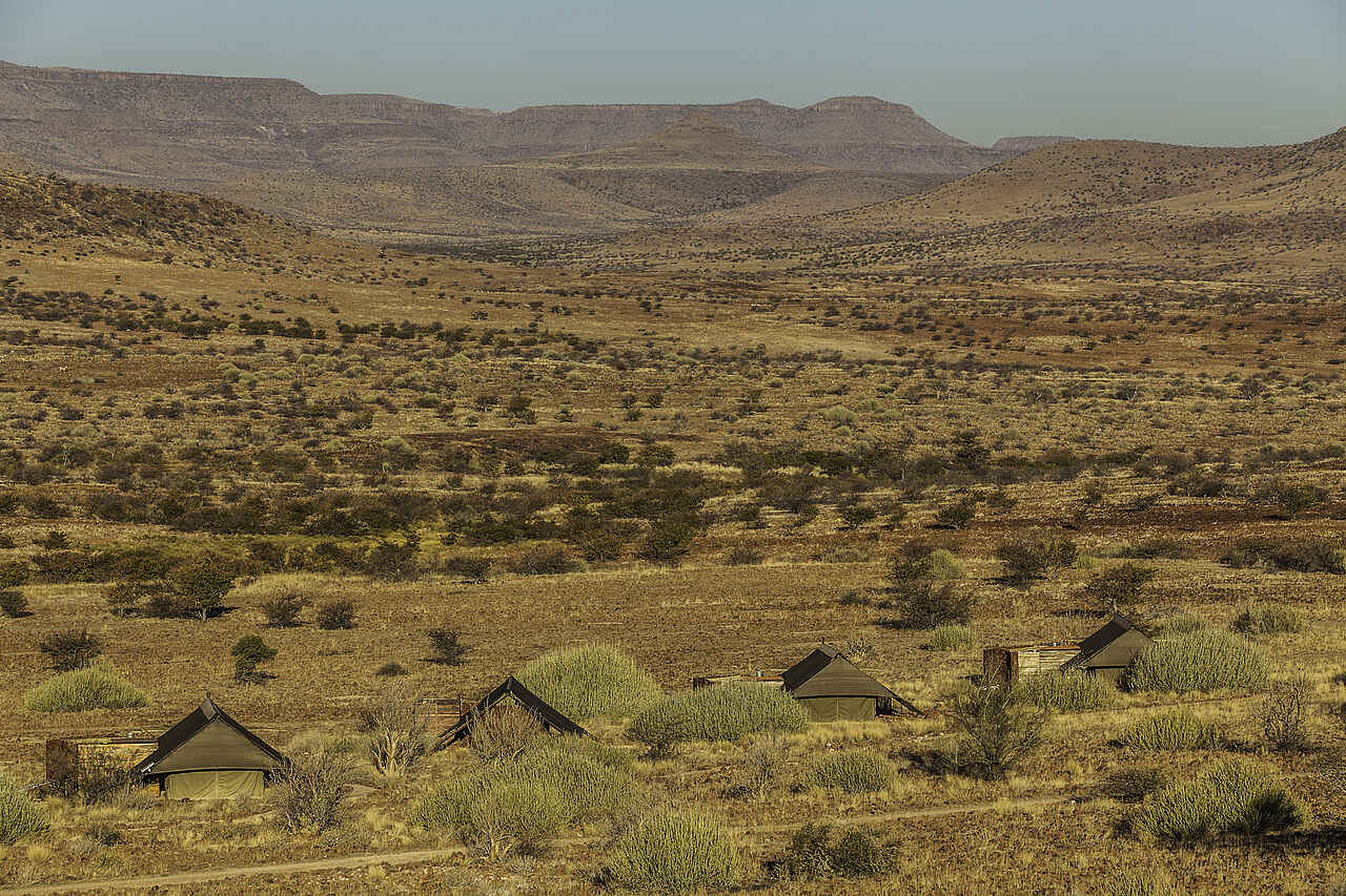 Etendeka Mountain Camp ist das einzige permanente Zeltcamp im gesamten Damaraland. Die offenen Zelte bieten einen guten Blick auf die Landschaft. Nur Gäste des Camps dürfen das dazugehörige, private Konzessionsgebiet besuchen, was die Erlebnisqualität sehr verbessert und für ungestörte Naturbeobachtungen sorgt.