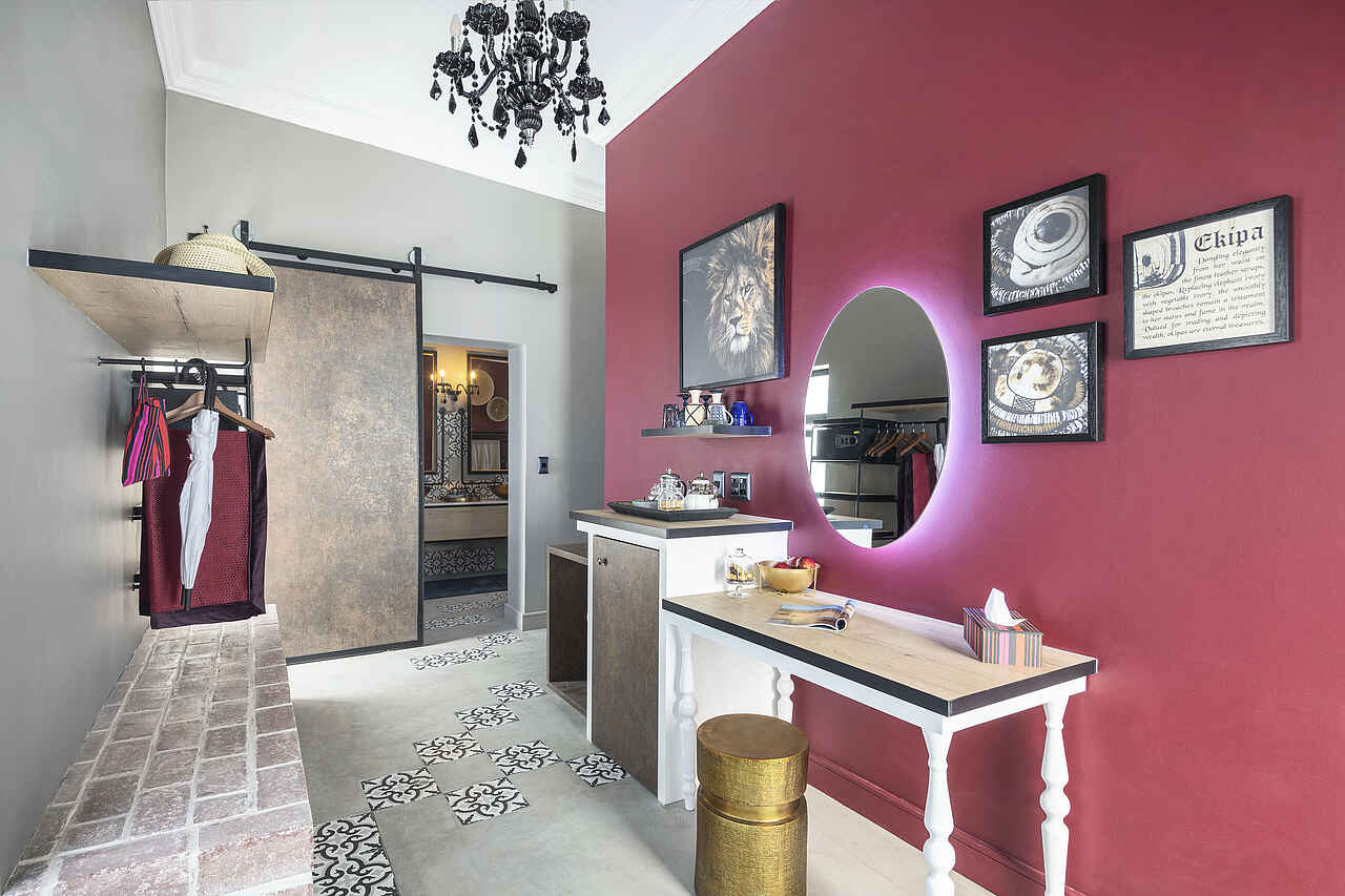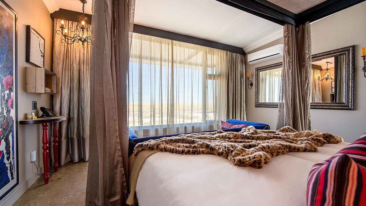 Die 40 großzügigen Gästechalets der Lodge sind stilvoll und modern gestaltet, wobei traditionelle afrikanische Elemente die Einrichtung harmonisch ergänzen. Ein heller Steinton prägt das Farbkonzept und wird durch kräftige, spanisch-rote Akzentwände raffiniert unterstrichen. Jedes Chalet ist mit einem komfortablen Doppelbett und einem Deckenventilator ausgestattet, umgeben von einem schützenden Moskitonetz. Ein königsblaues Sofa am Fußende lädt zum Entspannen ein und bietet einen freien Blick durch ein großes Panoramafenster.