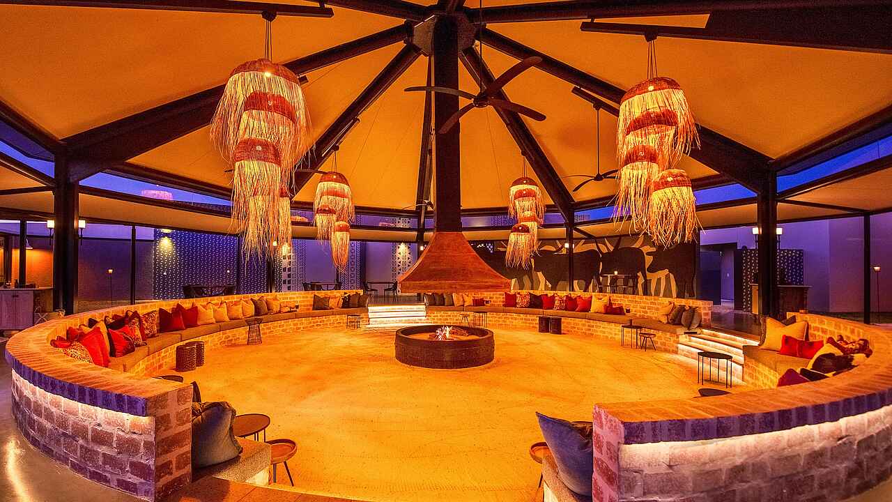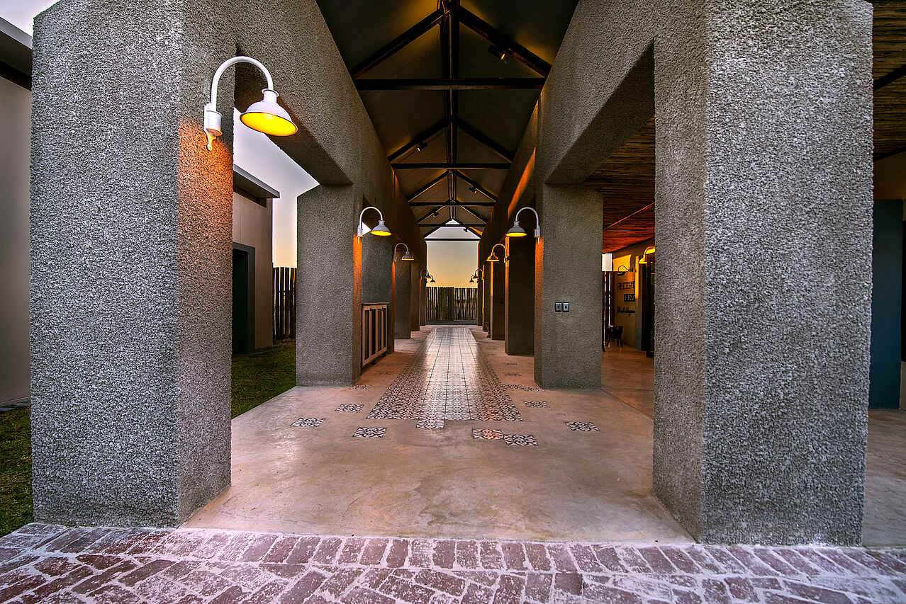 Das Hauptgebäude umfasst eine einladende Rezeption, wo man auch WLAN-Zugang hat, sowie einen gut sortierten Souvenirladen mit einer Auswahl an überwiegend namibischen Produkten. Der Weg führt zunächst in einen großzügigen, runden Boma-Bereich mit weichem Sandboden, einer zentralen Feuerstelle und zahlreichen gemütlichen Sitzgelegenheiten mit farbenfrohen Kissen. Dieser Bereich erinnert an das Olupale, das Wohnzimmer eines traditionellen Ovambo-Anwesens, wo sich die Familie abends versammelt.