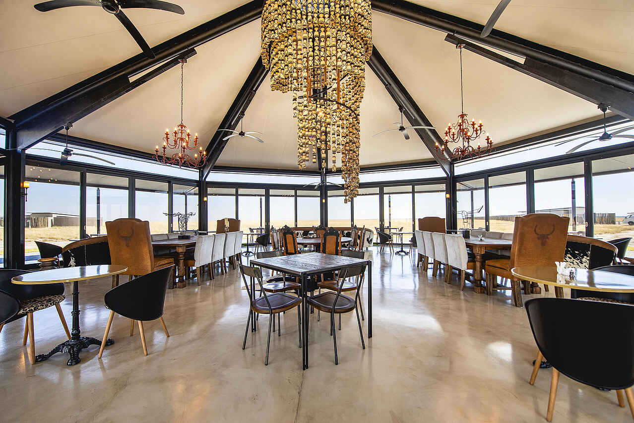 Der Speisebereich und die Bar liegen in einem großzügigen Saal mit hohen Decken und eleganten Kronleuchtern. Gäste können es sich auf Ledersofas, hochlehnigen Sesseln oder an individuell gestalteten Essbereichen gemütlich machen. Große Fenster und Glastüren holen die umgebende Landschaft ins Innere, während draußen eine schattige Veranda mit weiteren Tischen und Stühlen zum Verweilen einlädt und den Blick auf gepflegte Rasenflächen freigibt.