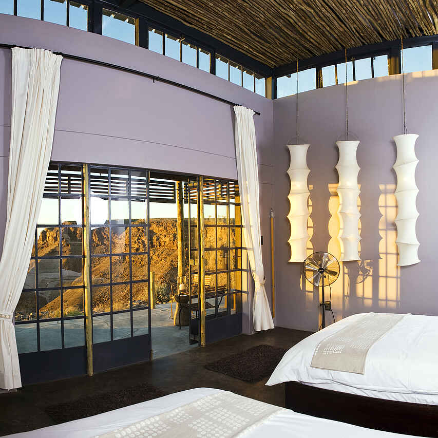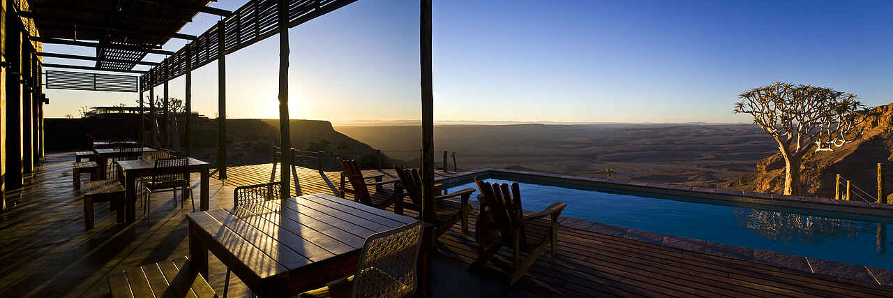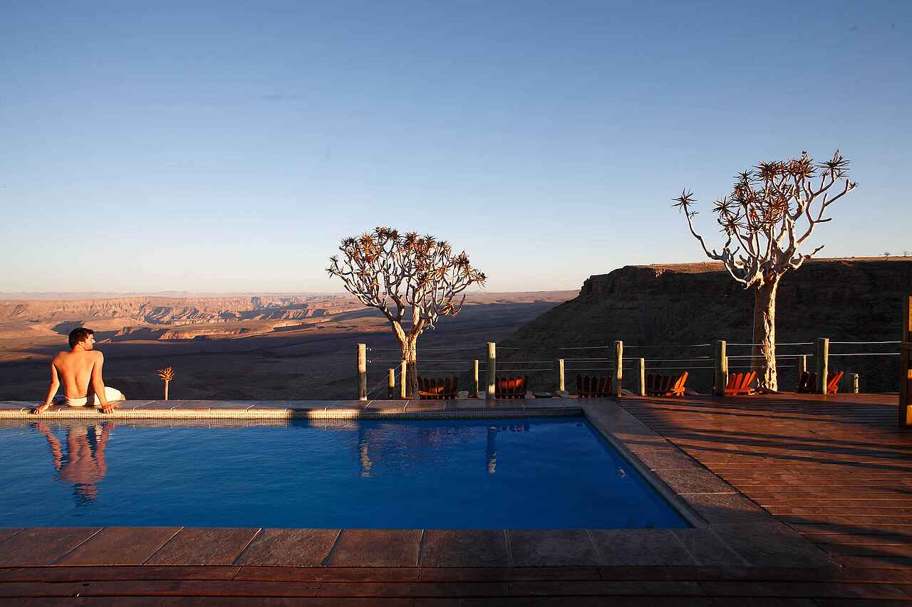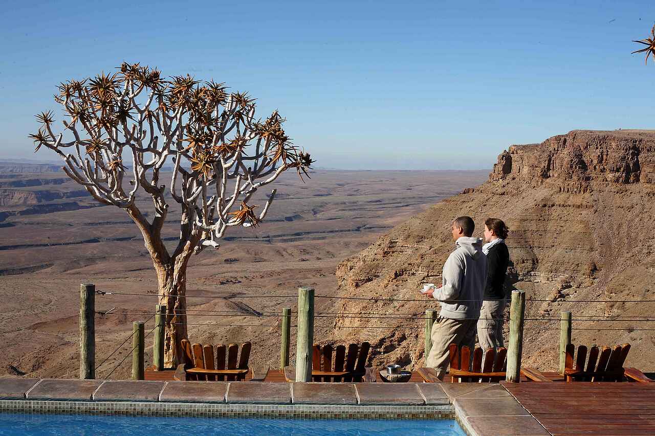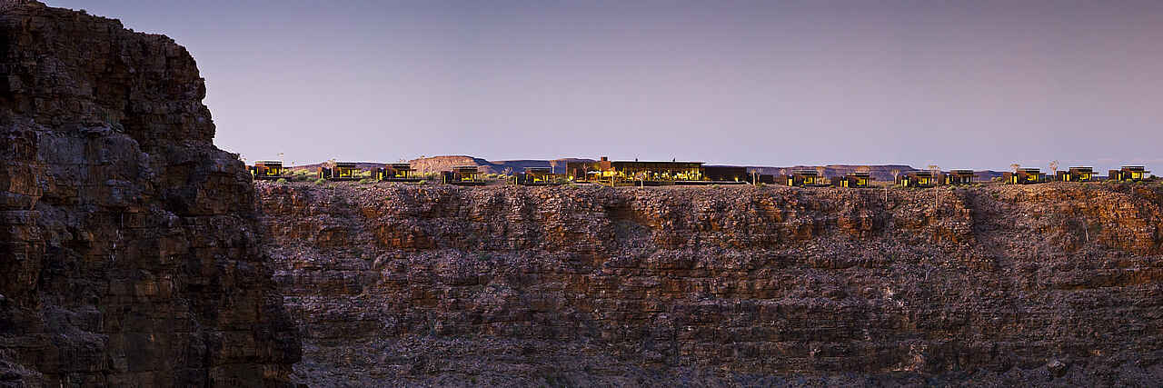 Eingebettet in den Canyon National Park liegt die Lodge mit seinen 20 Chalets nur wenige Meter von der Schlucht des Fish River Canyons entfernt, welcher mit Tiefen bis zu 550 Metern und einer Gesamtlänge von ca. 160 Kilometern als zweitgrößter Canyon der Welt bekannt ist. Ein einmaliger Panoramaausblick über die Gesteinsformationen sowie die weitläufige Canyonlandschaft mit dem sich durch die Sedimente schlängelnden Fish Rivers laden zum Verweilen ein und symbolisieren den Reiz und die natürliche Anziehungskraft dieser Region.